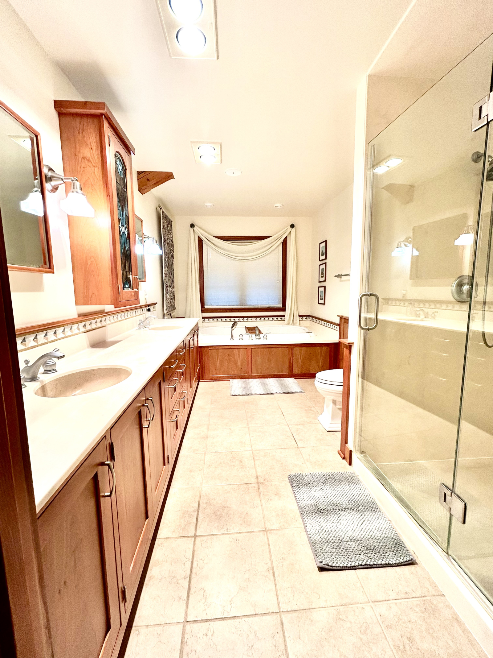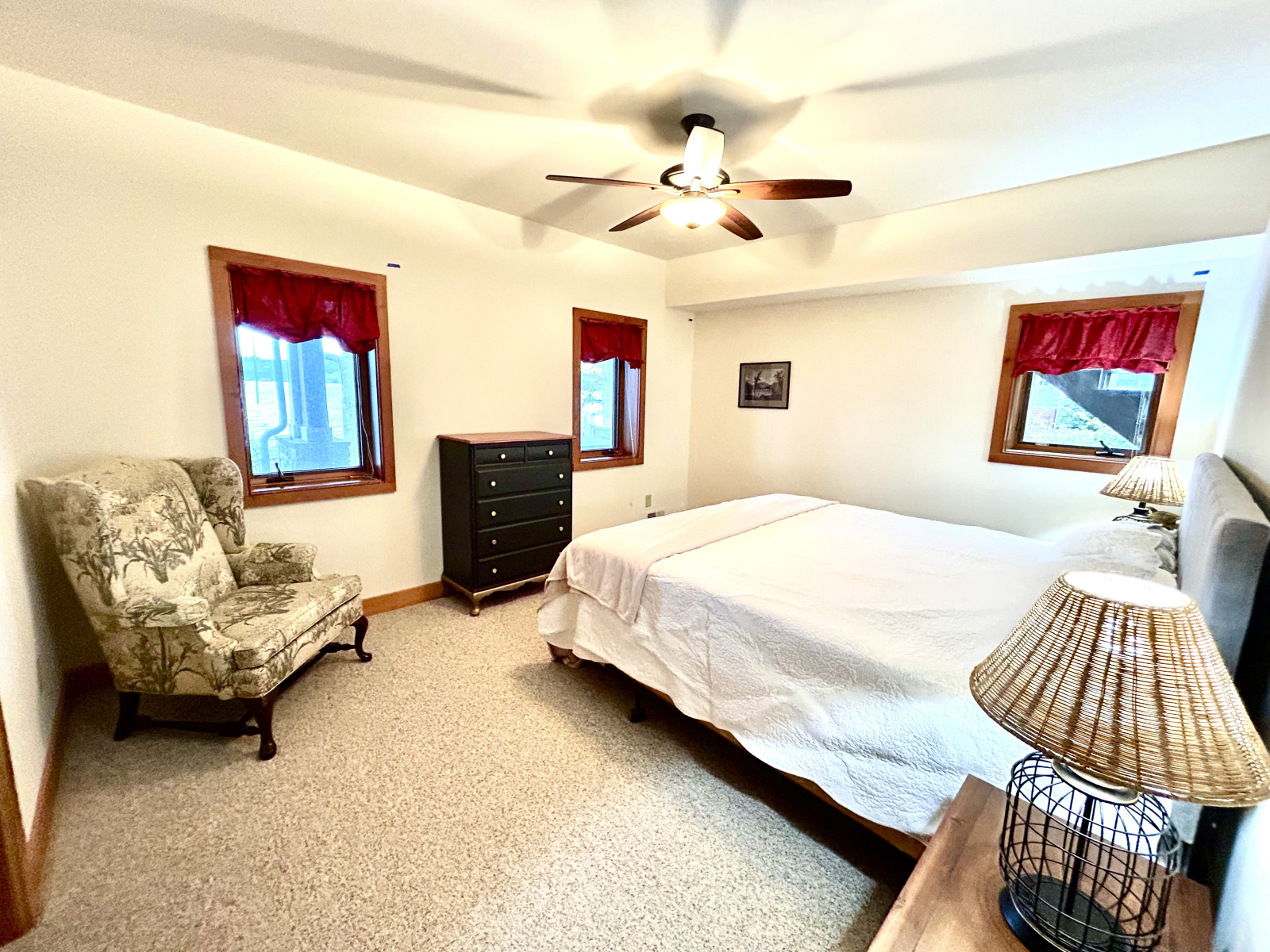 Main level master suite living with lower walkout level including three bedrooms and two full bathrooms.