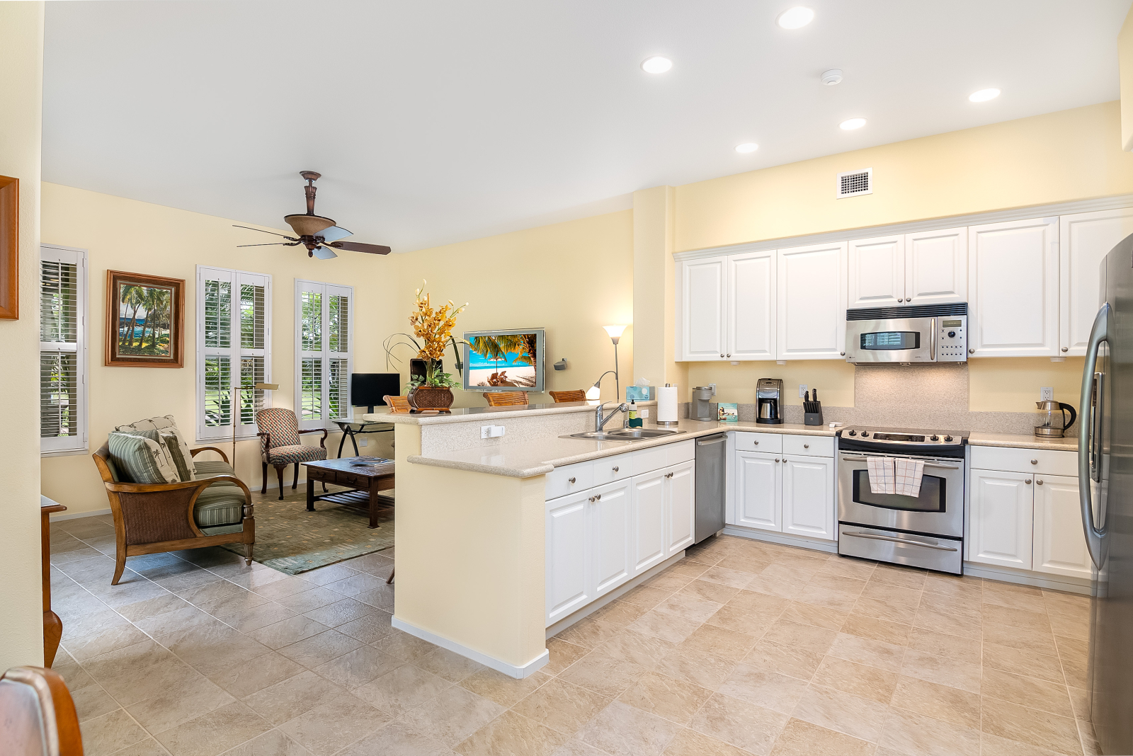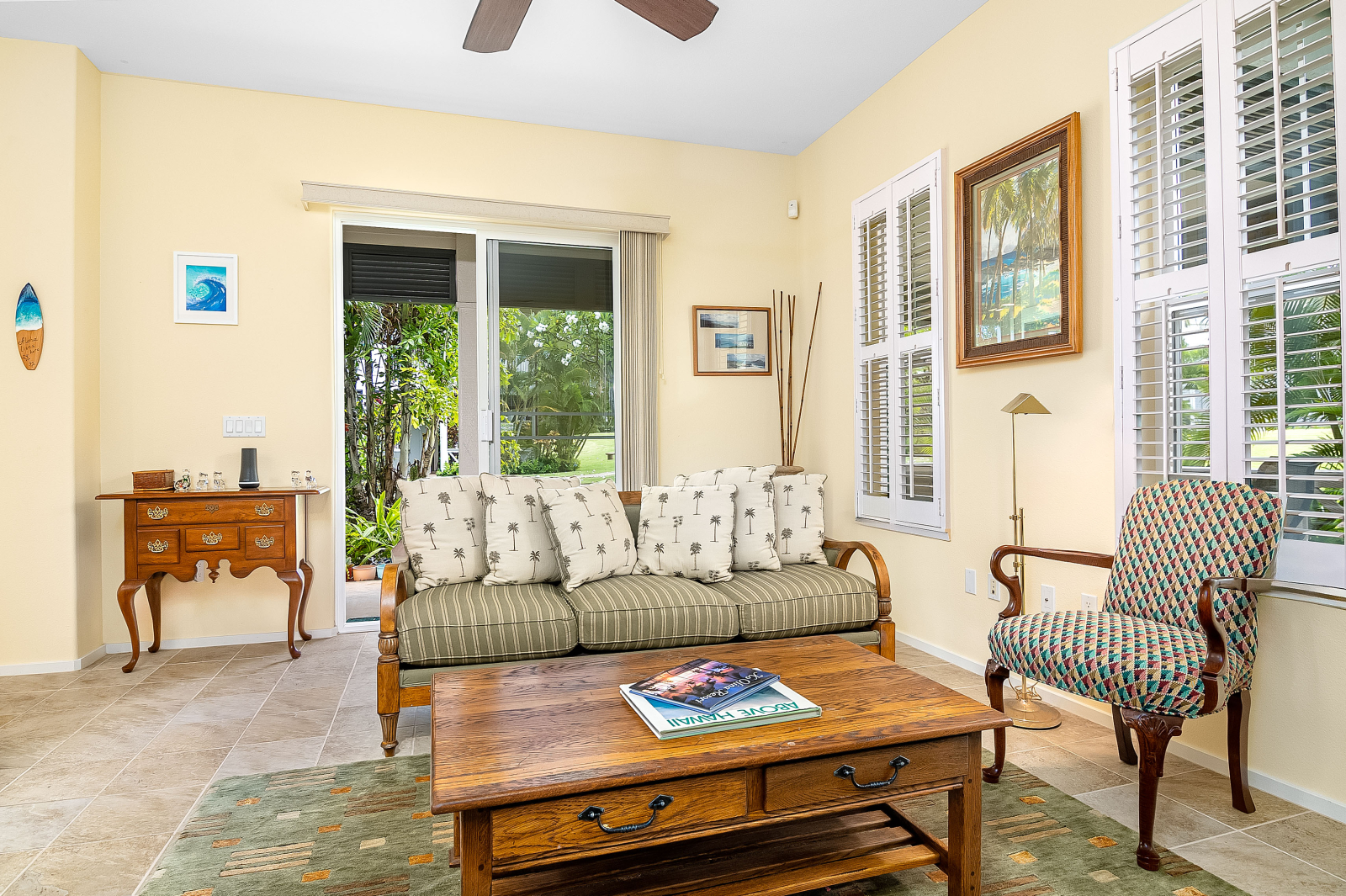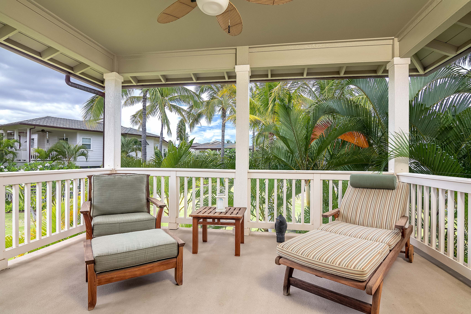 The unit has two spacious lanais. The upstairs lanai has lounge chairs and a table. Both lanais face quiet and pristine grass areas with walkways.