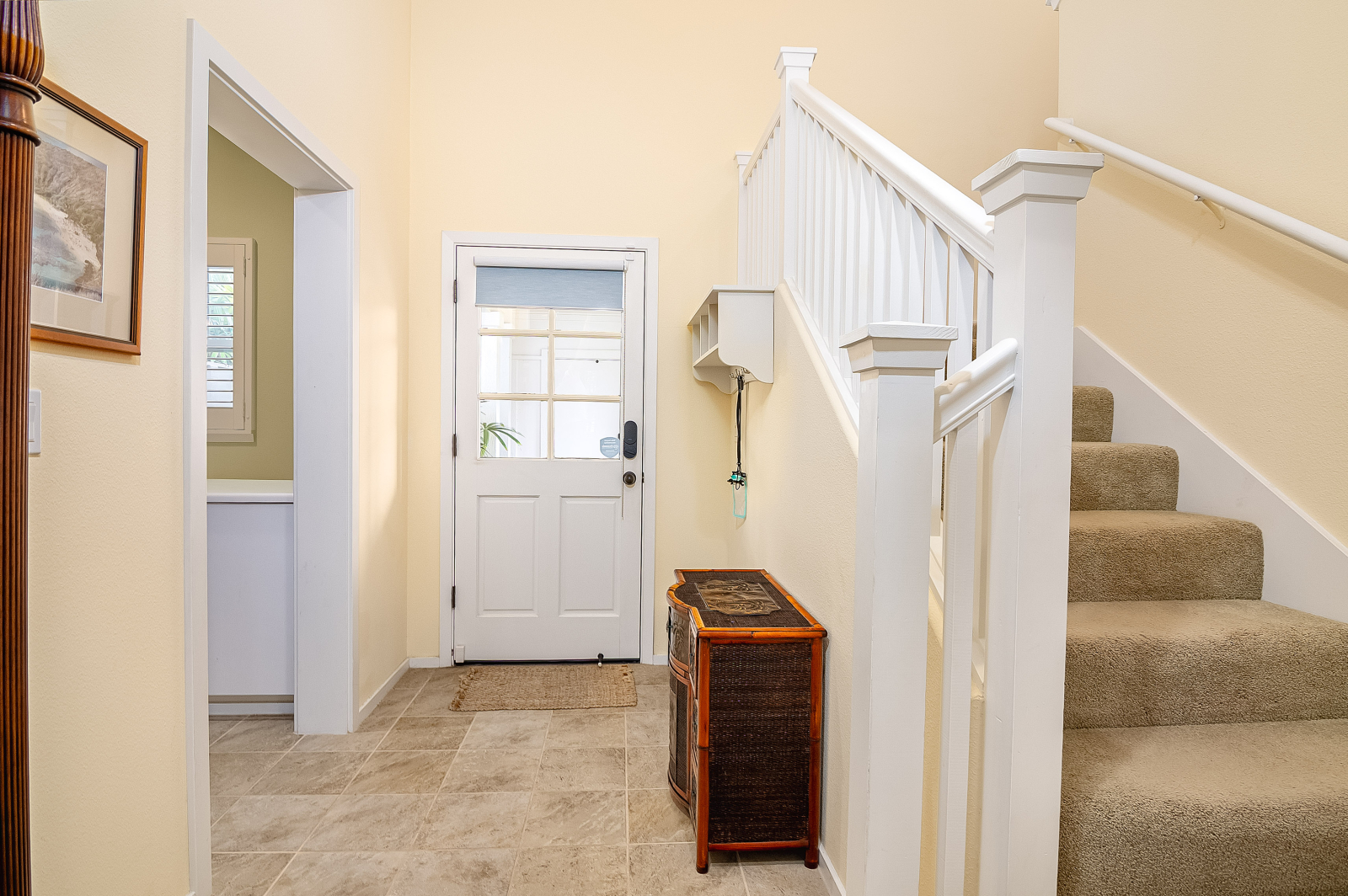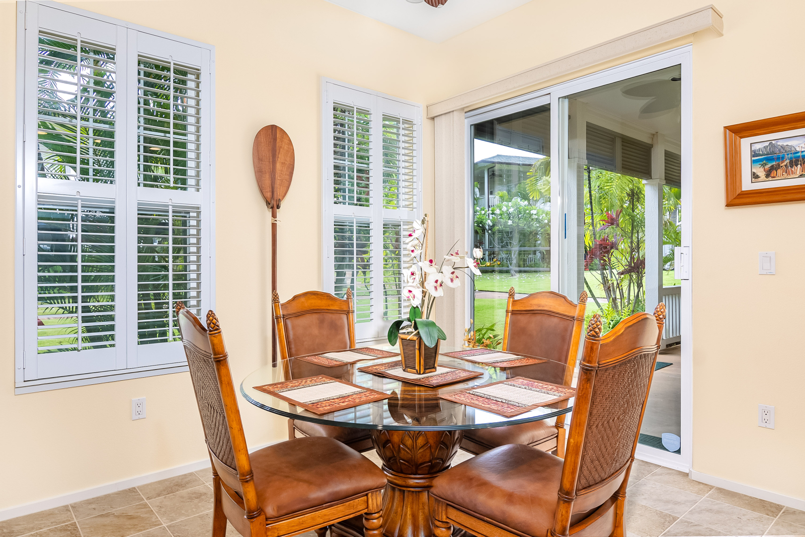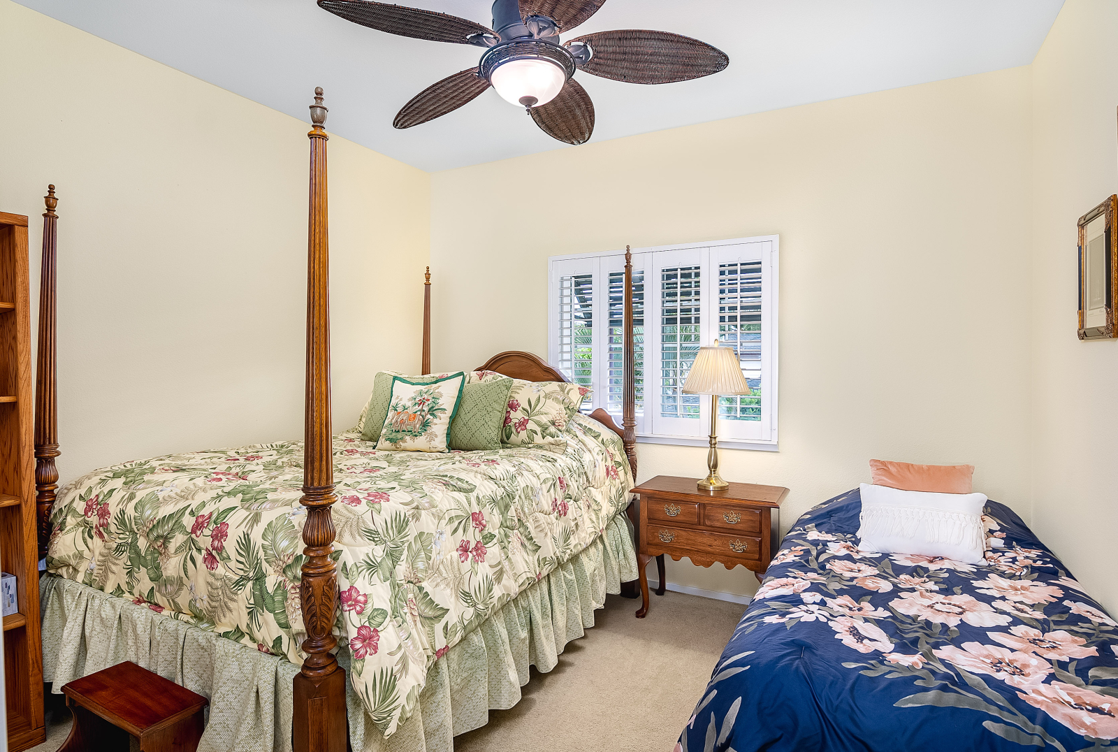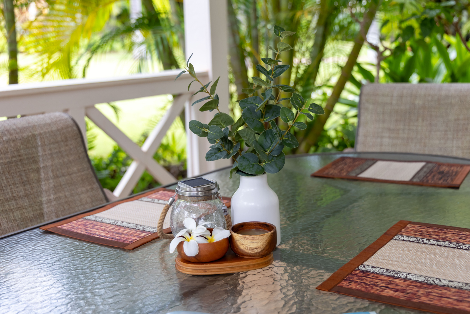 The unit has two spacious lanais. The upstairs lanai has lounge chairs and a table. Both lanais face quiet and pristine grass areas with walkways.