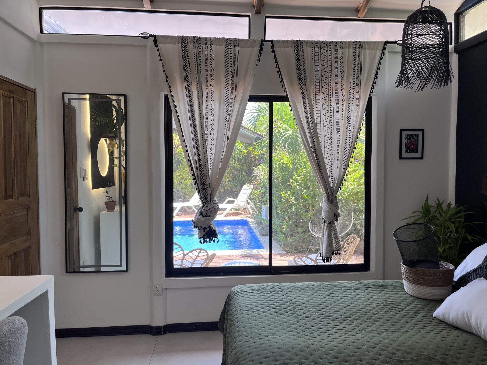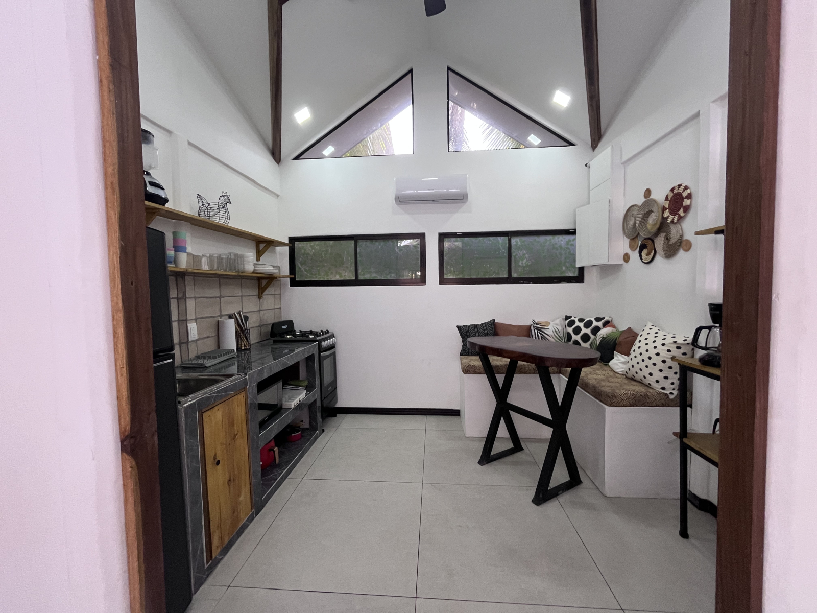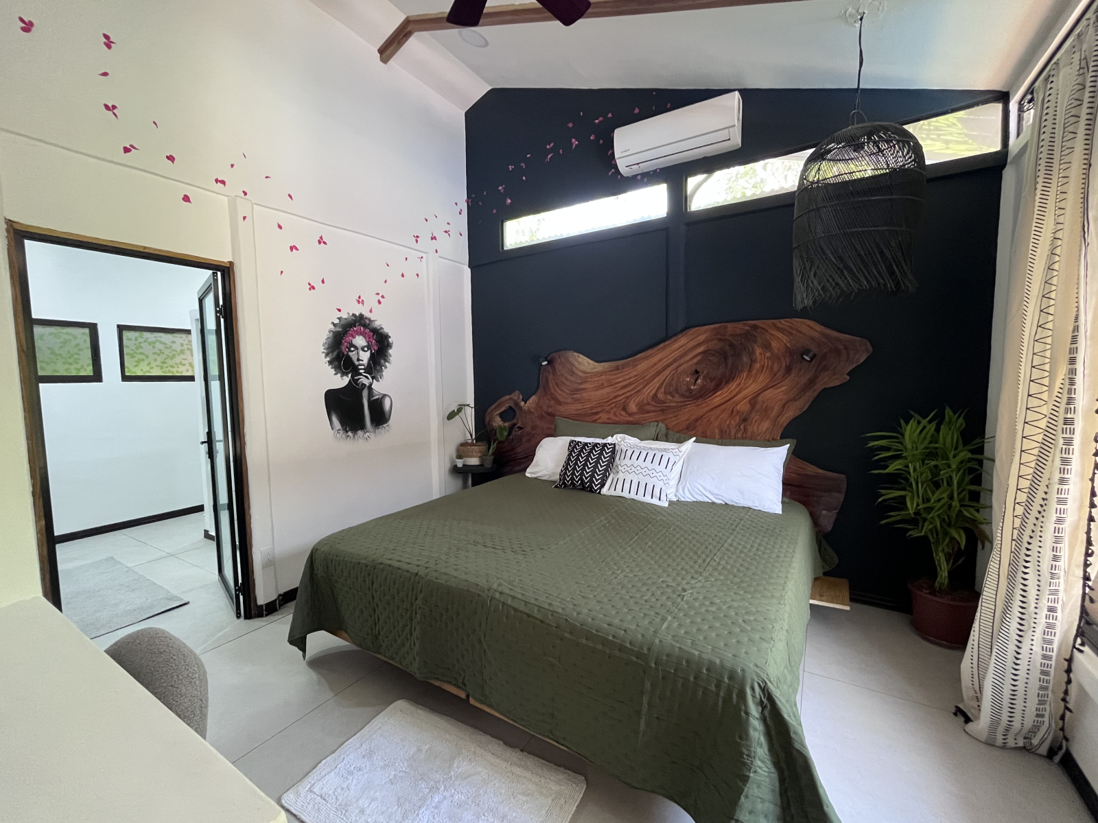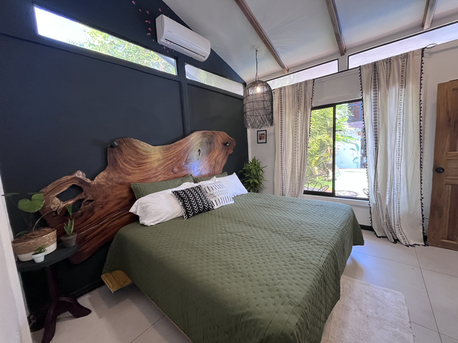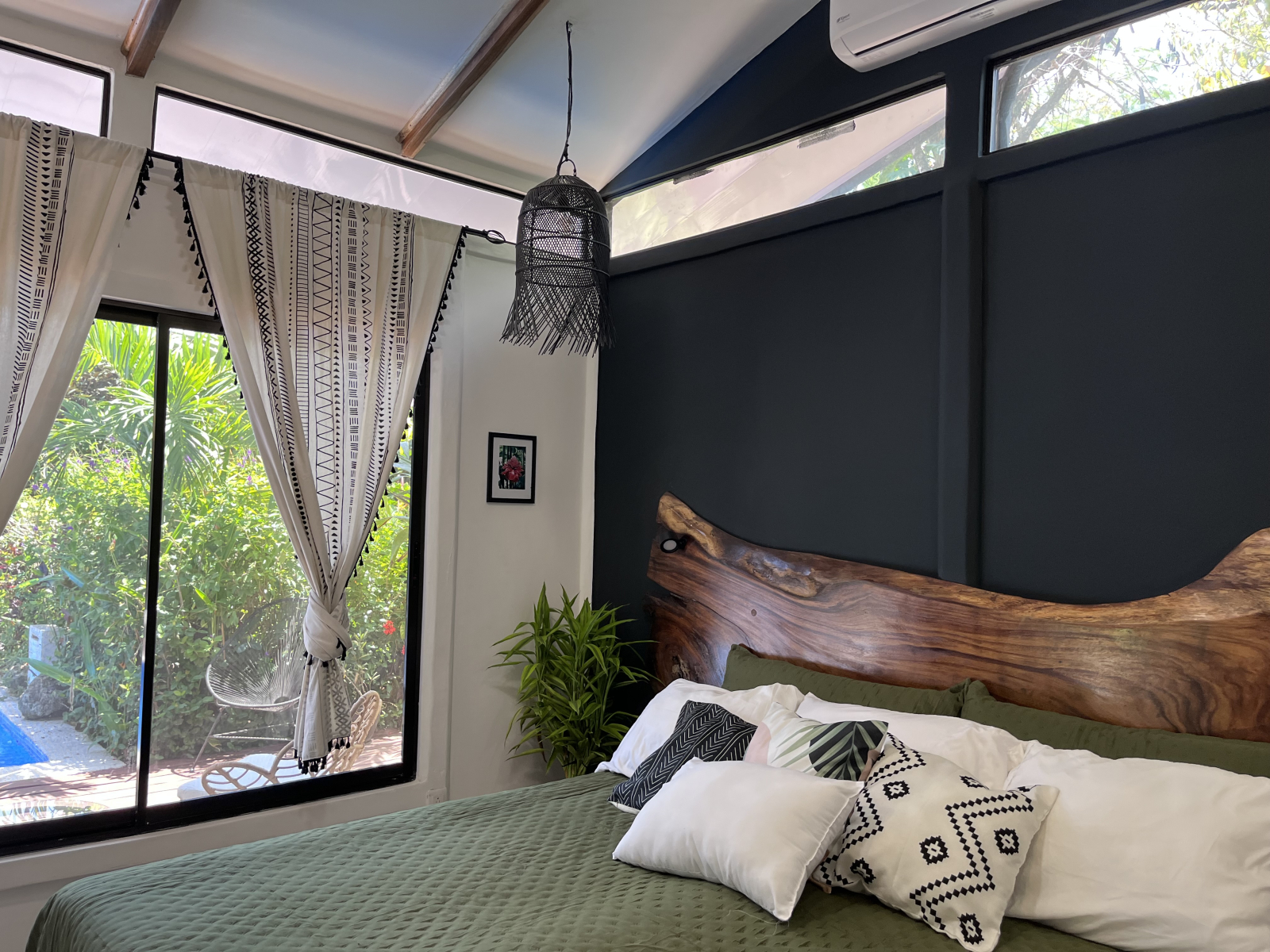 Modern two bedroom casita with en suite bathrooms, living room, full kitchen, shared pool, bbq/firepit, WiFi, hot water, AC, use of free bikes, yoga shala, and walking distance to the beach and town.