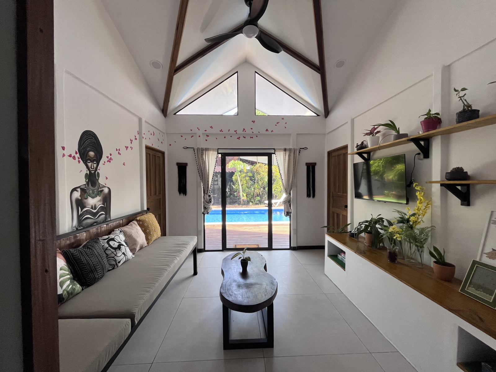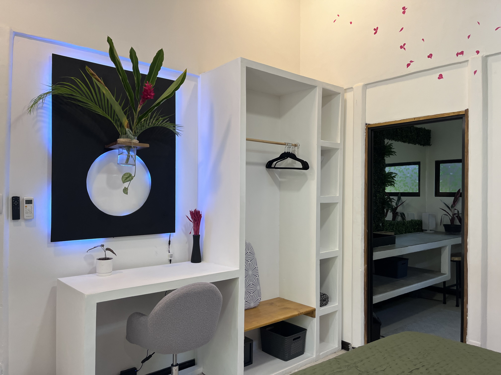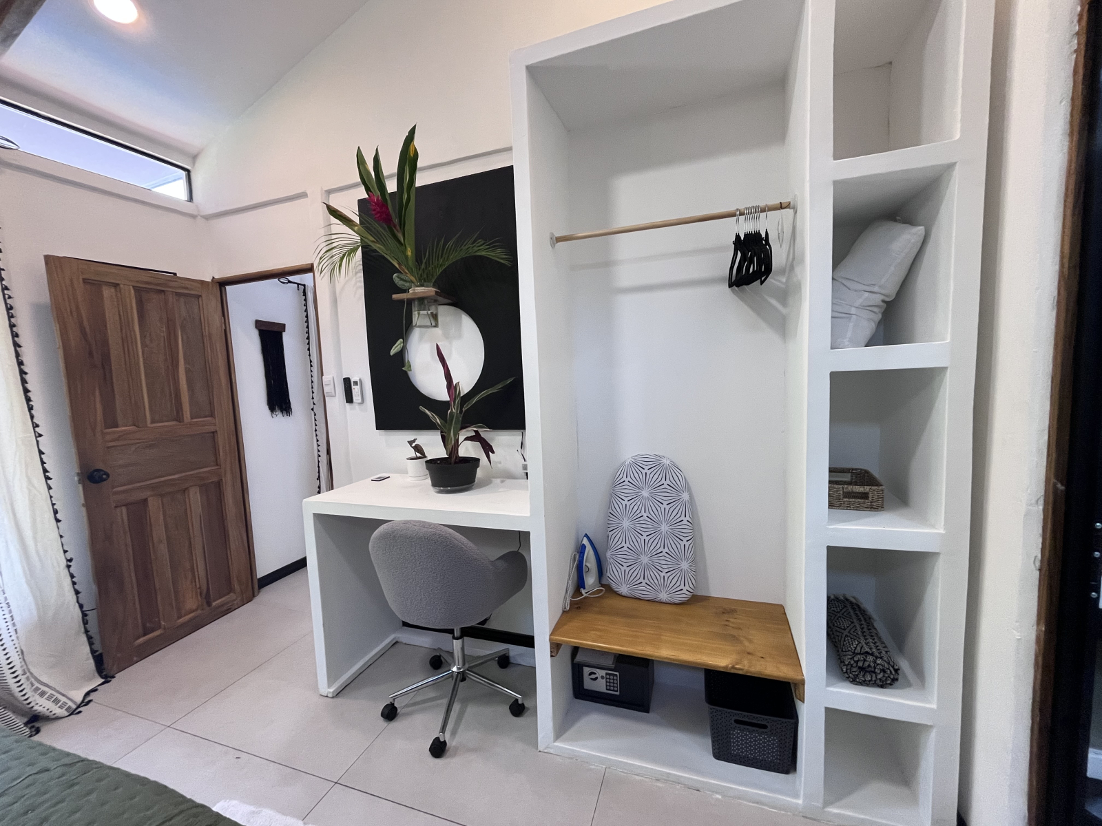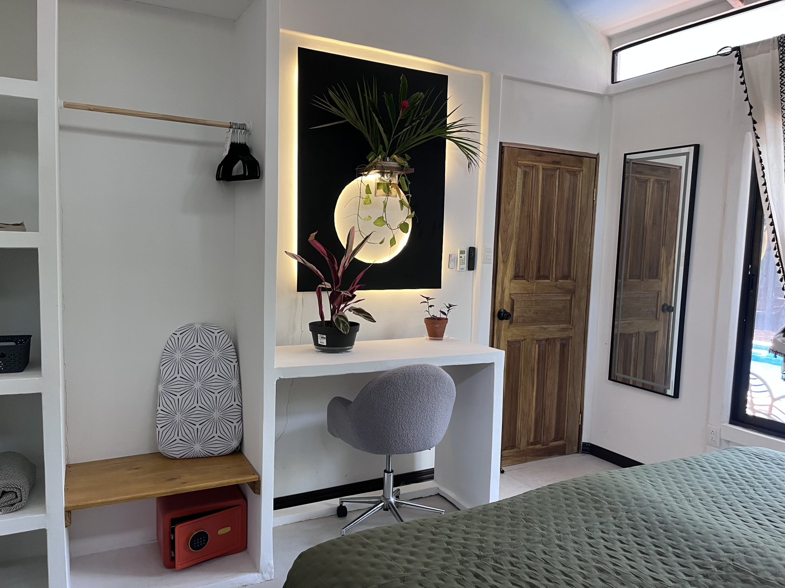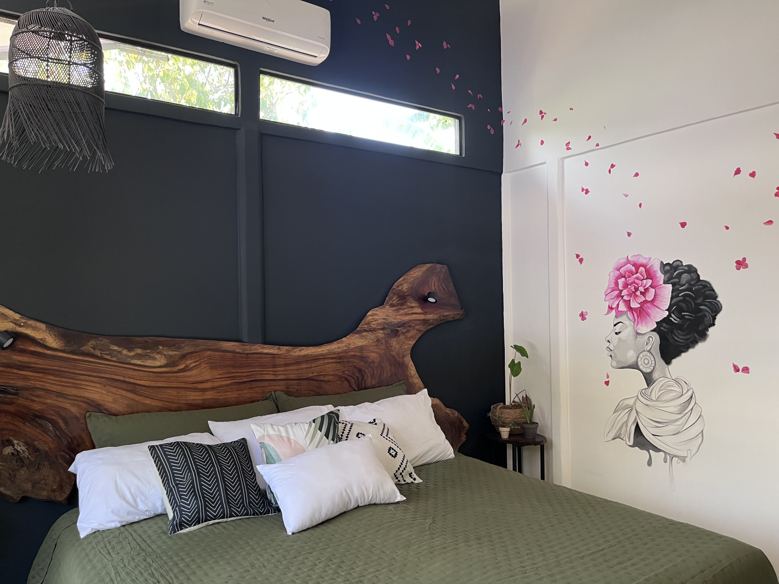 Modern two bedroom casita with en suite bathrooms, living room, full kitchen, shared pool, bbq/firepit, WiFi, hot water, AC, use of free bikes, yoga shala, and walking distance to the beach and town.