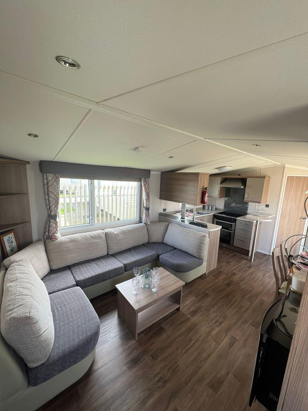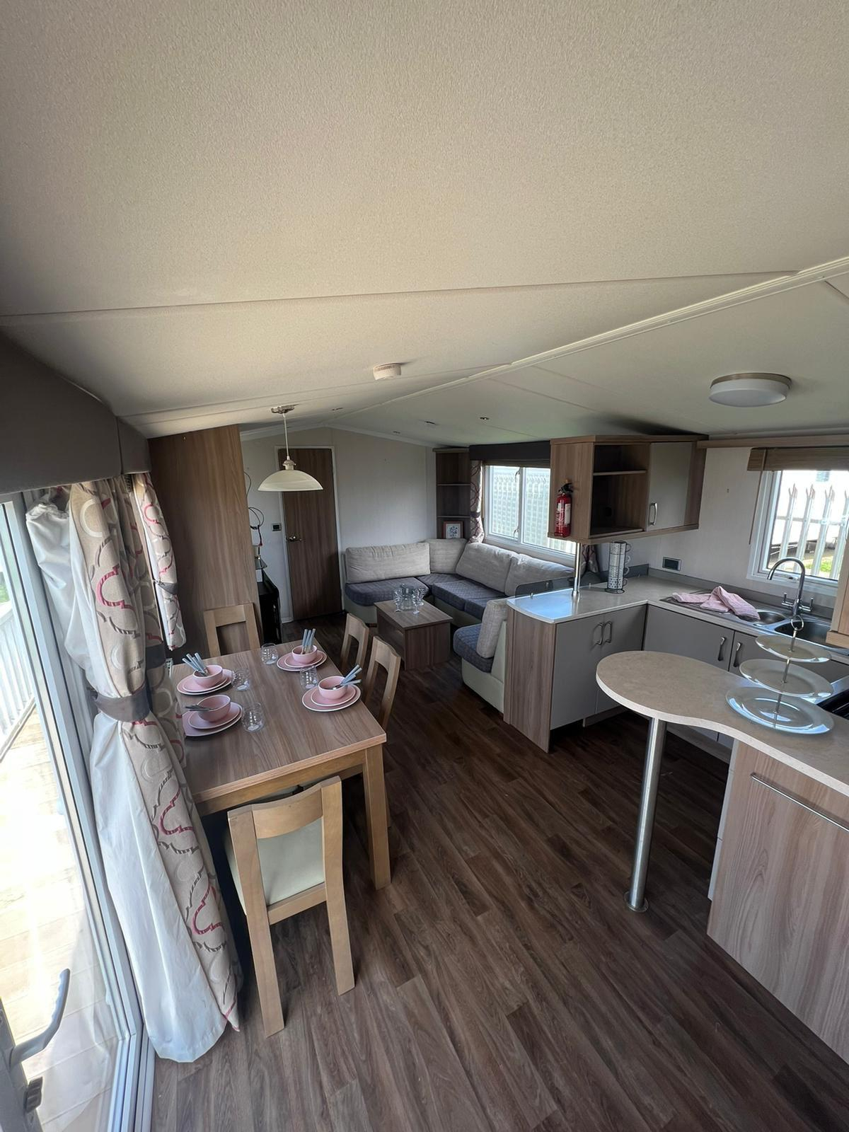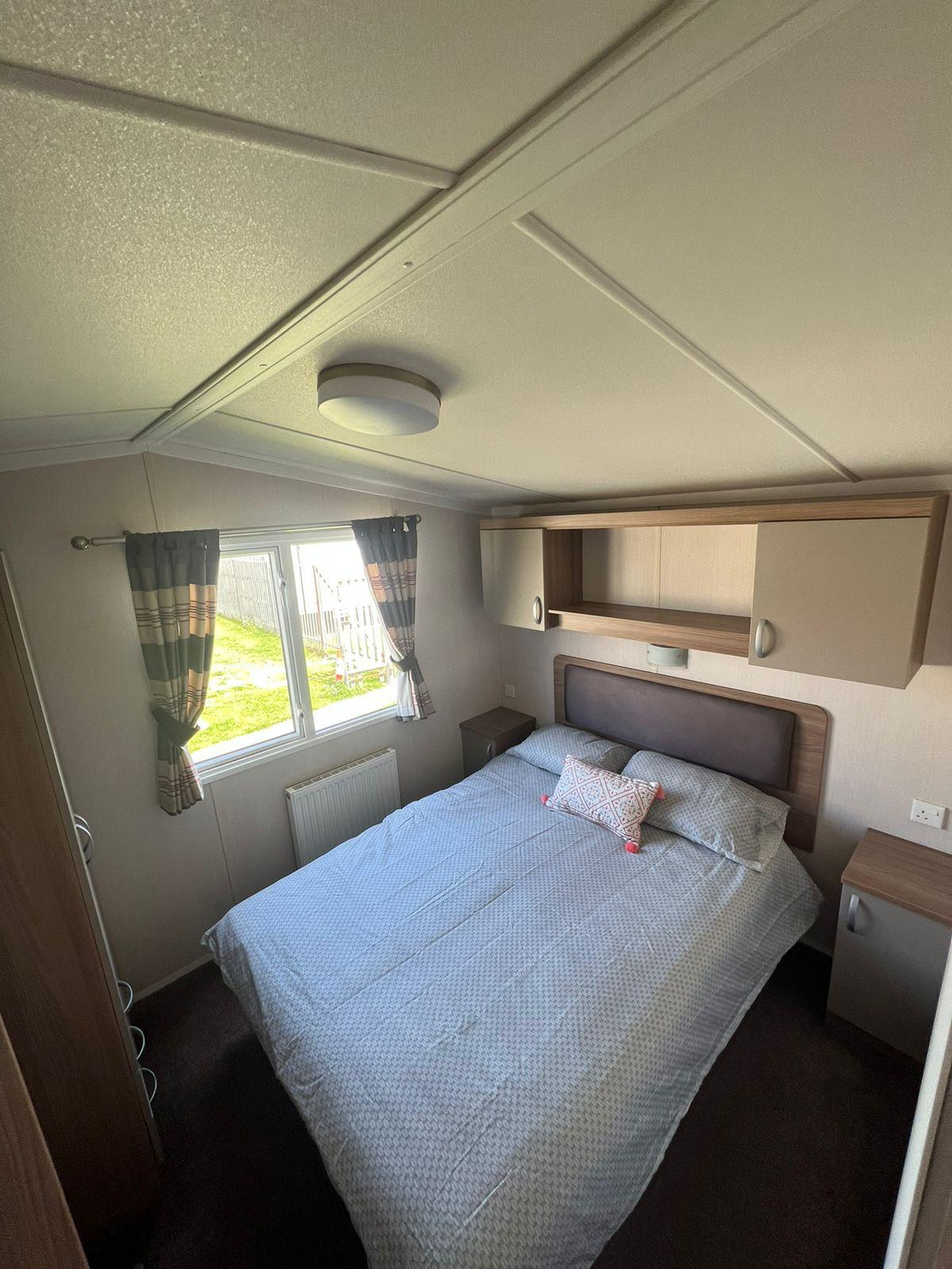 The caravan itself is unique as the bedrooms are separated by the kitchen/lounge area that has french doors opening out onto private decking that overlooks a small, shared,grassy area. Parking can be found just 50 metres away meaning not far to carry your bags and a safe space for children to play or you to chill away from cars.