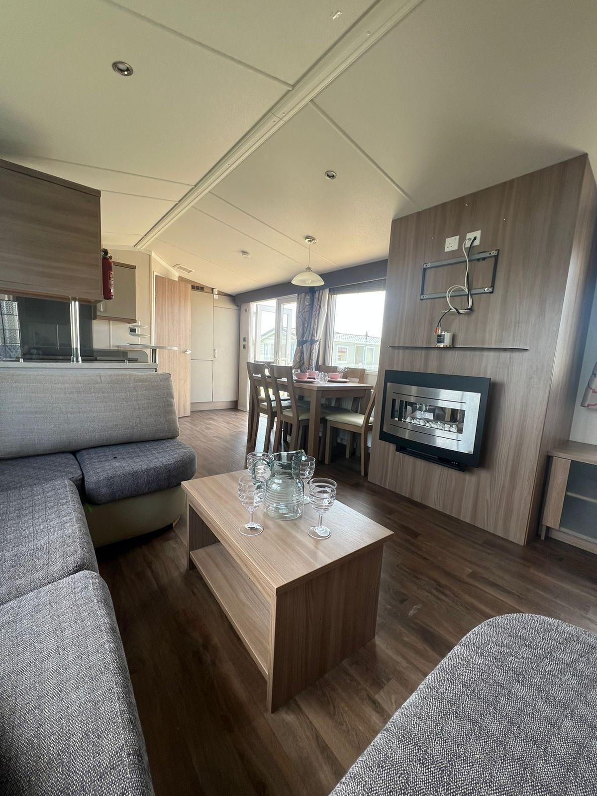 The communal area itself has fitted seating that comfortably seats 5, a small coffee table, large screen tv, games console, a fire and a dining table for 4.