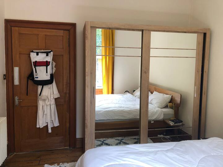 We have a woodburning fire, high ceilings, and leafy trees surrounding us. Our place is quiet, spacious, and full of character.