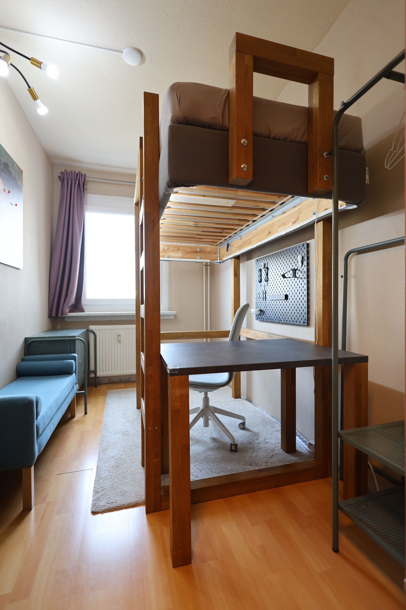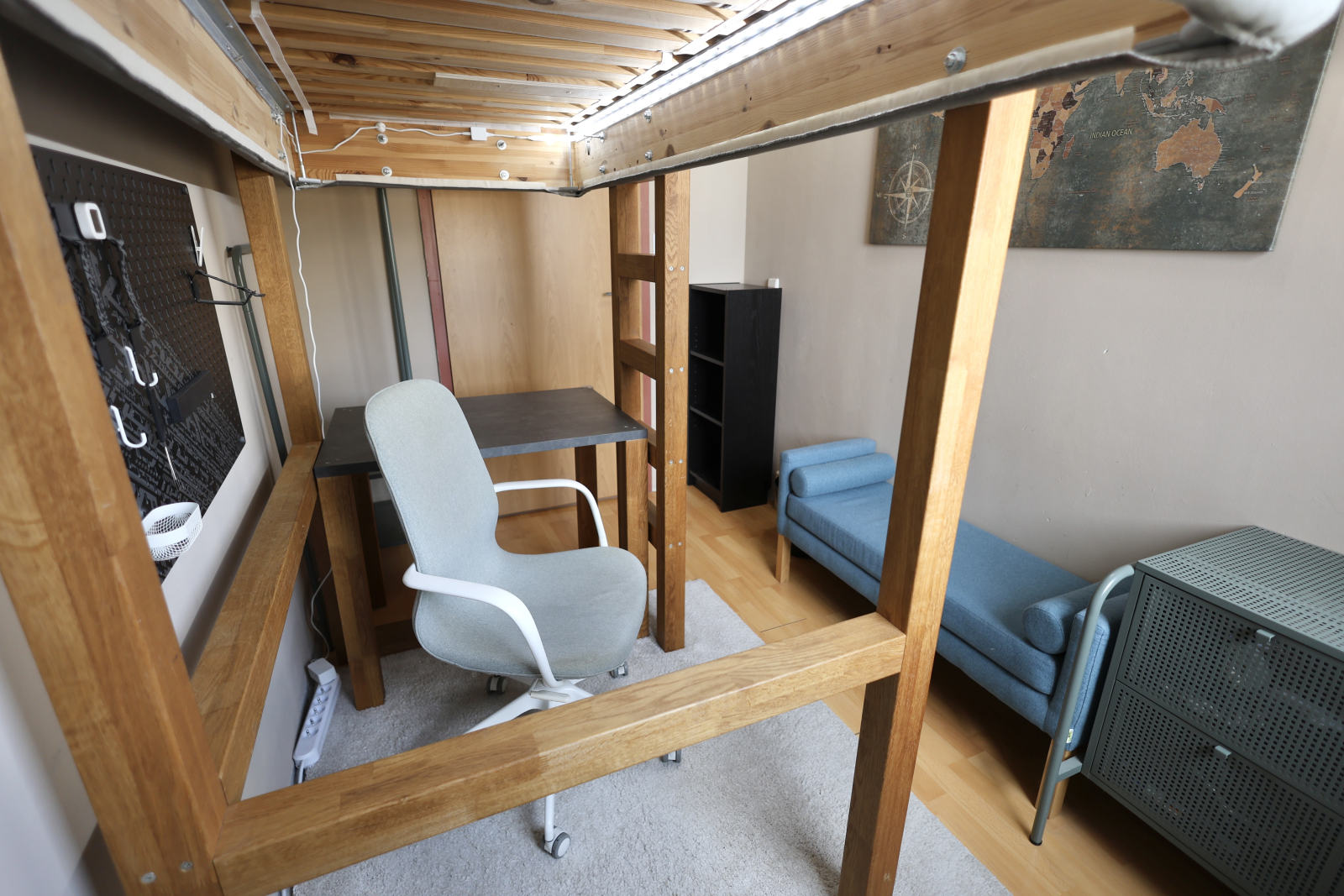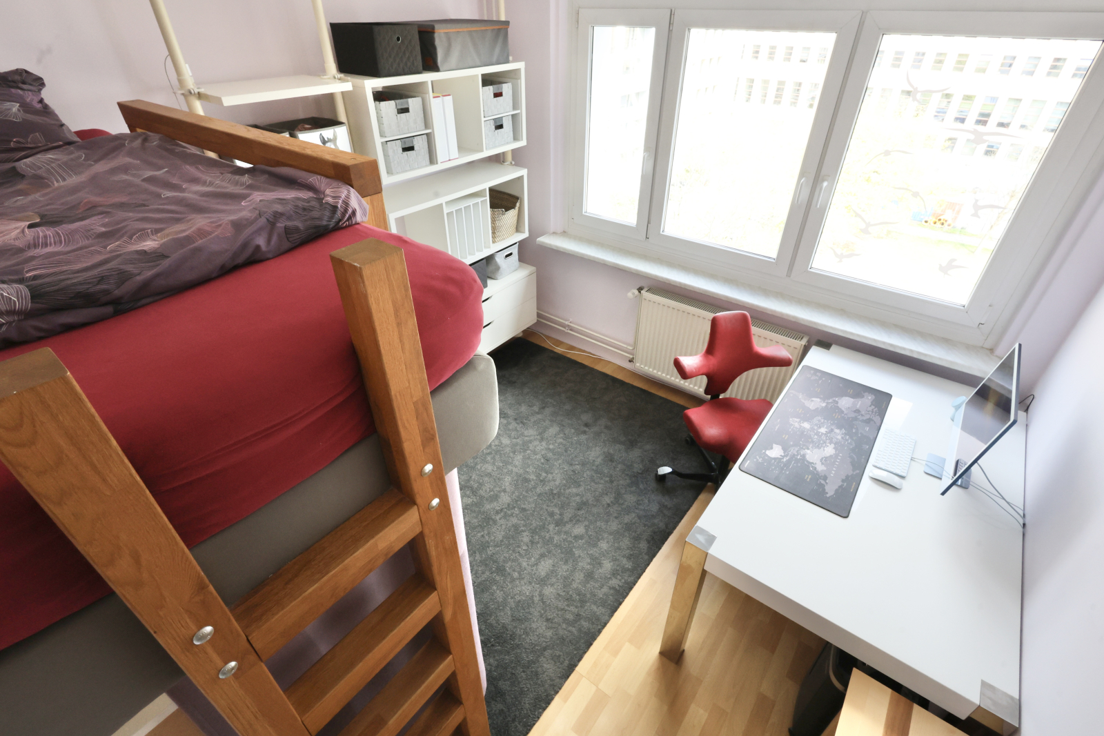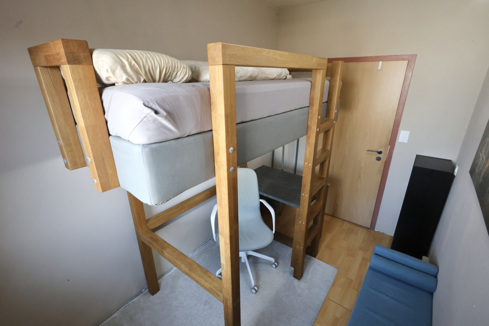 • Another oak high sleeper setup, complete with vanity corner, huge desk (90x160cm), and an iMac—plus, yeah, that killer TV Tower view again.