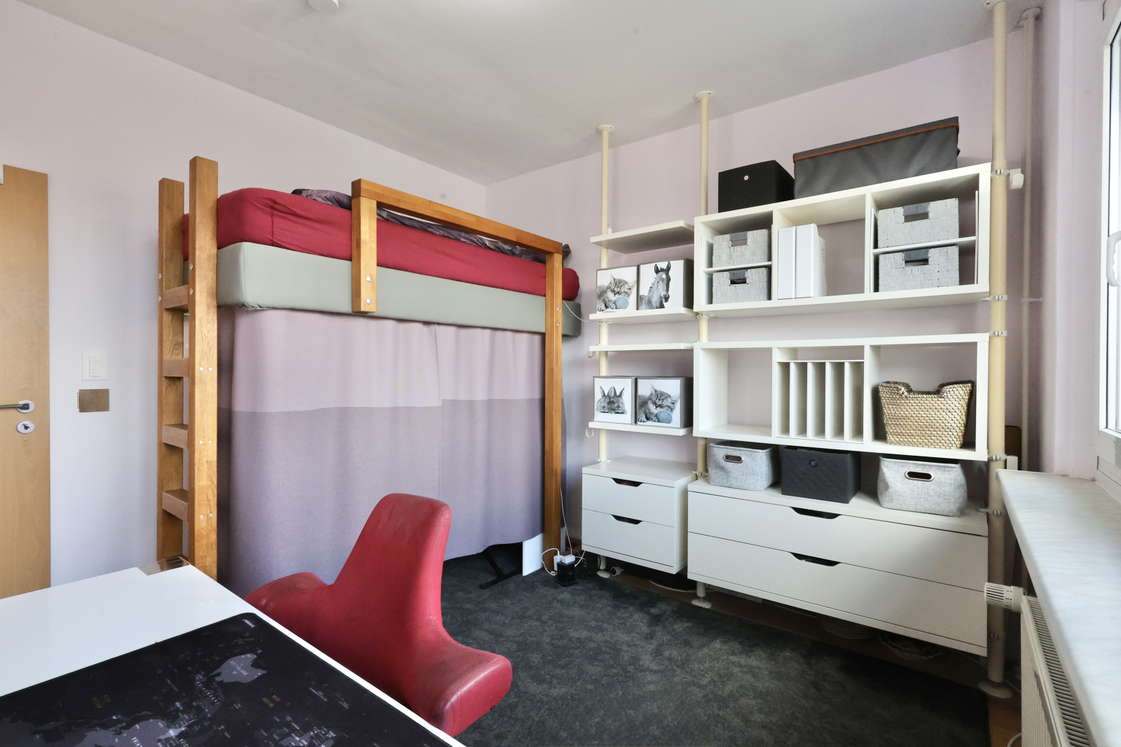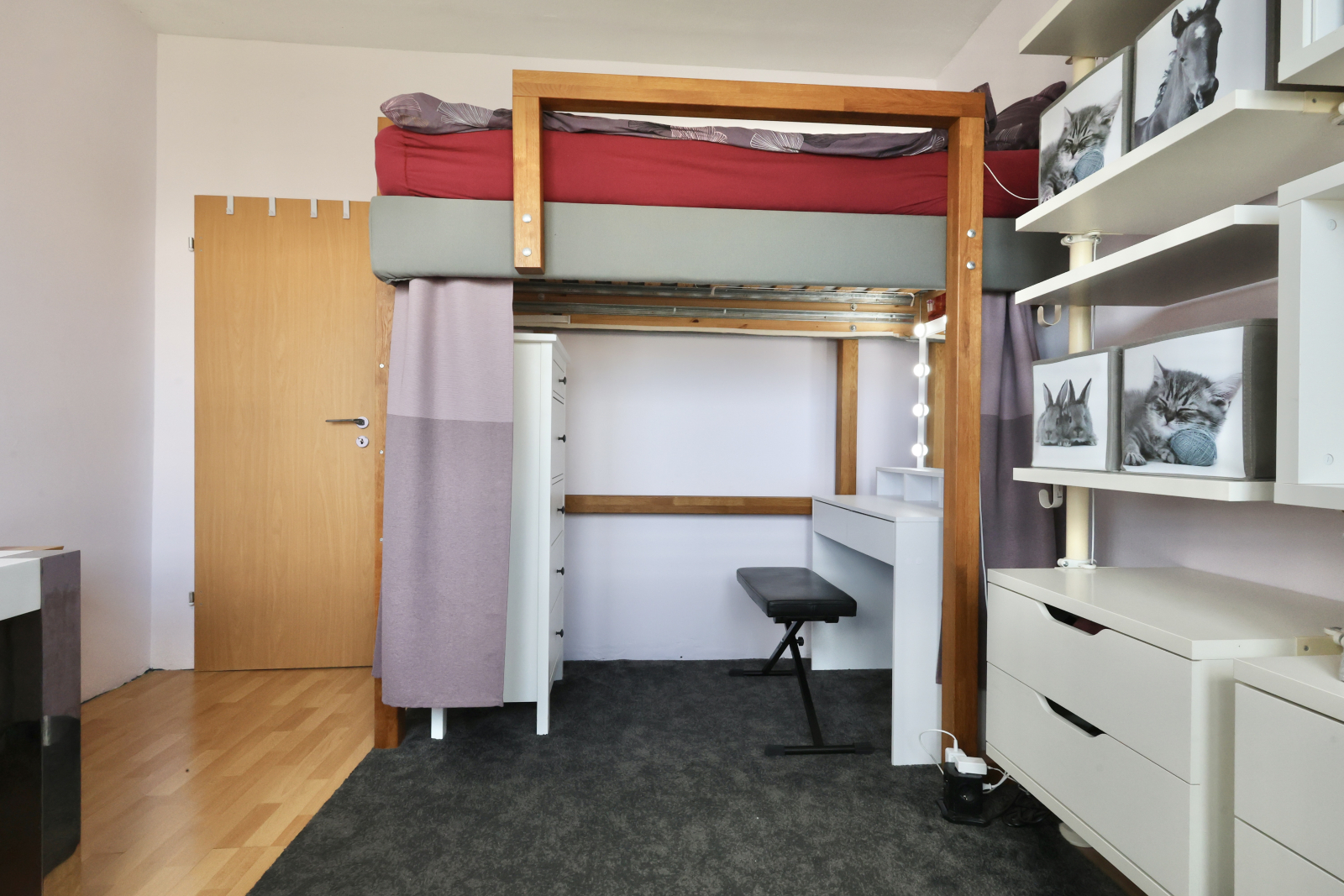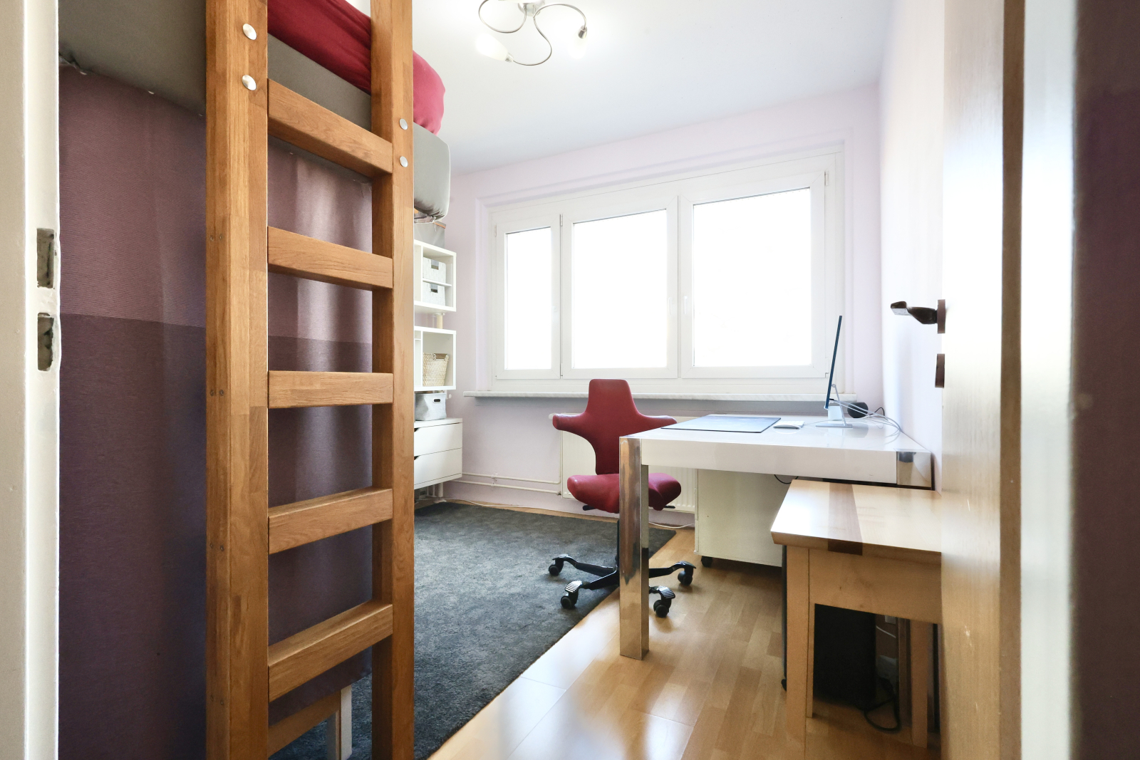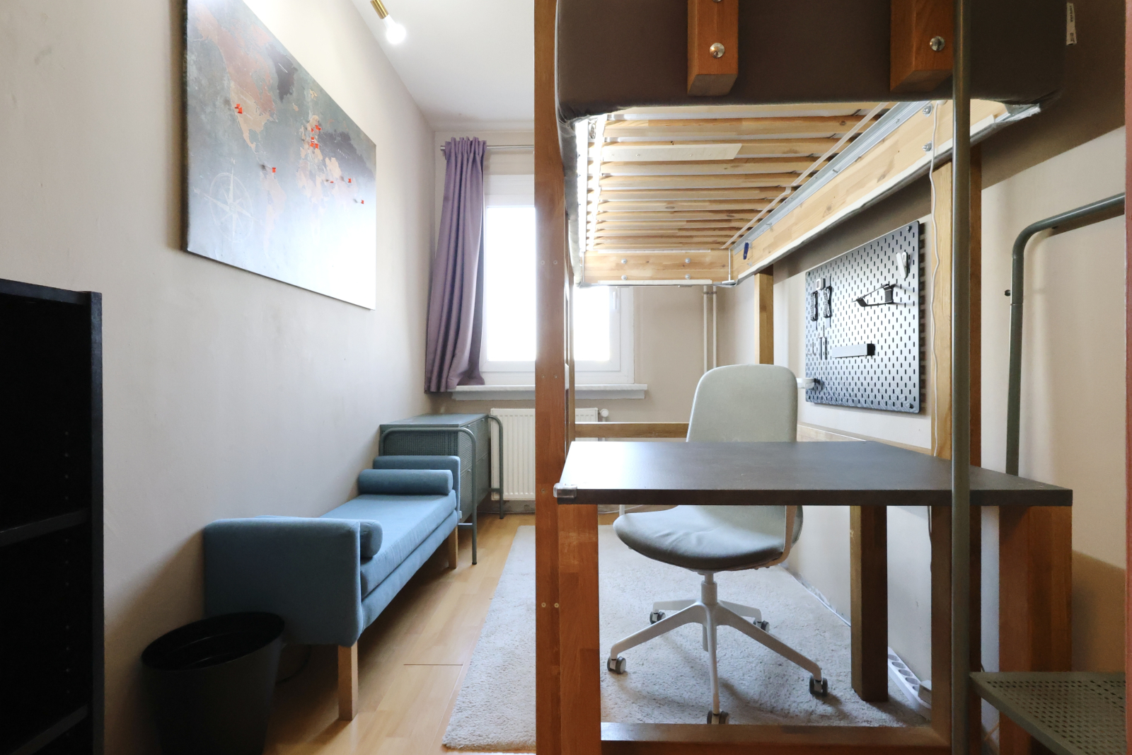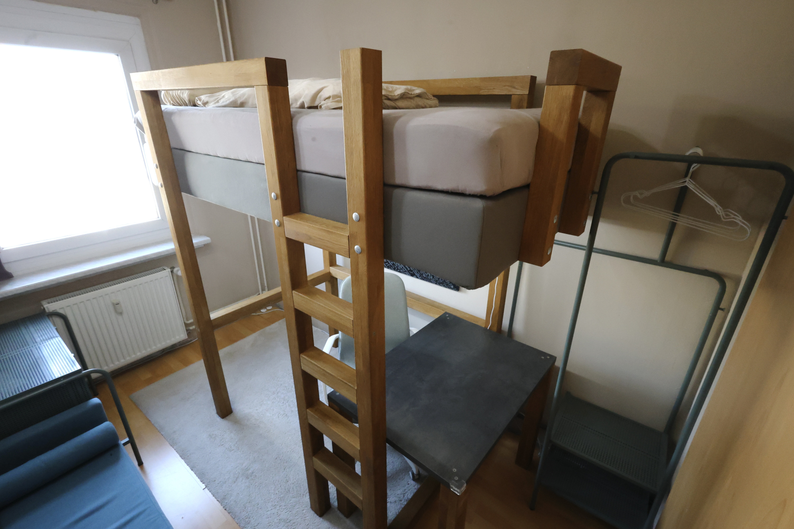 • Another oak high sleeper setup, complete with vanity corner, huge desk (90x160cm), and an iMac—plus, yeah, that killer TV Tower view again.