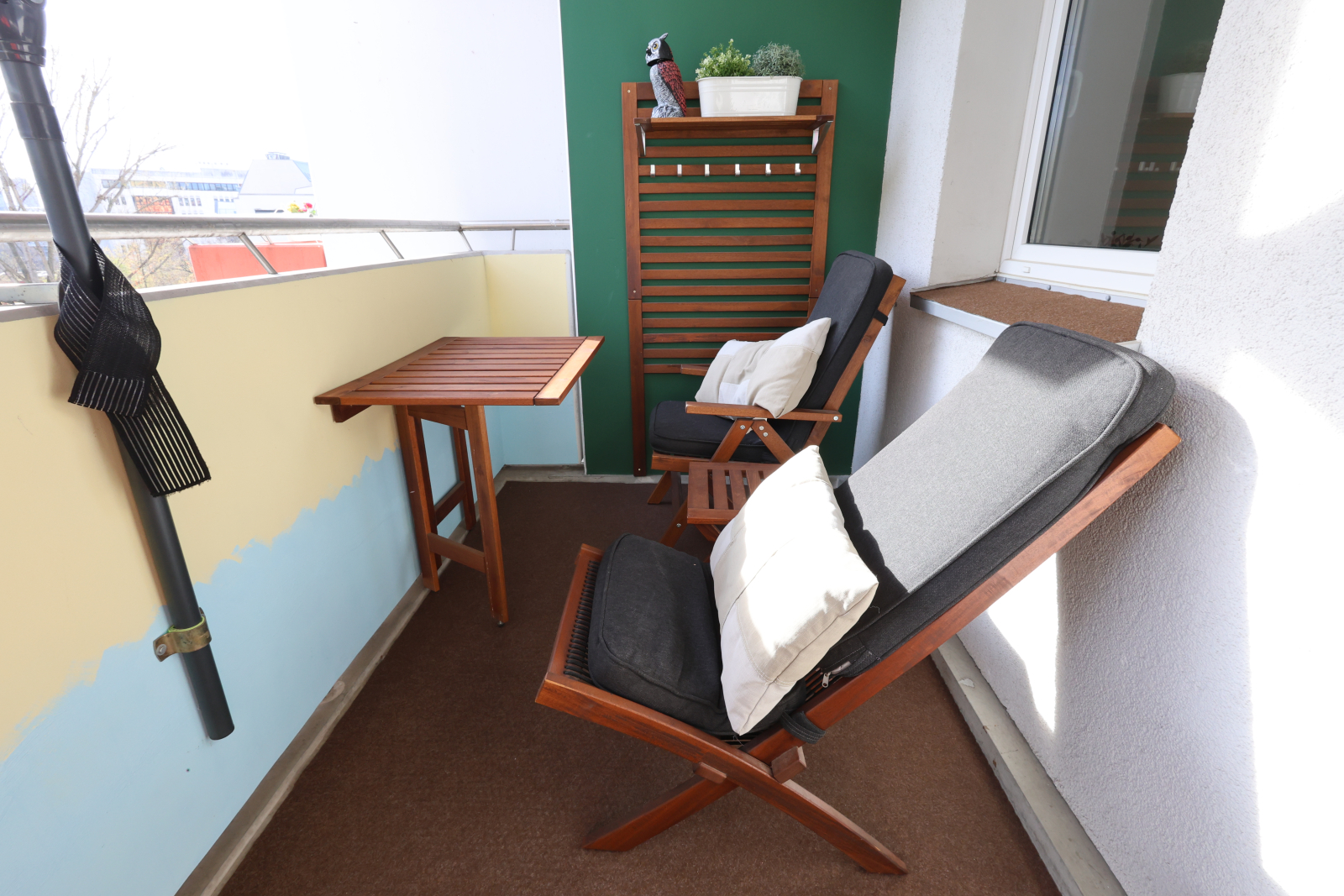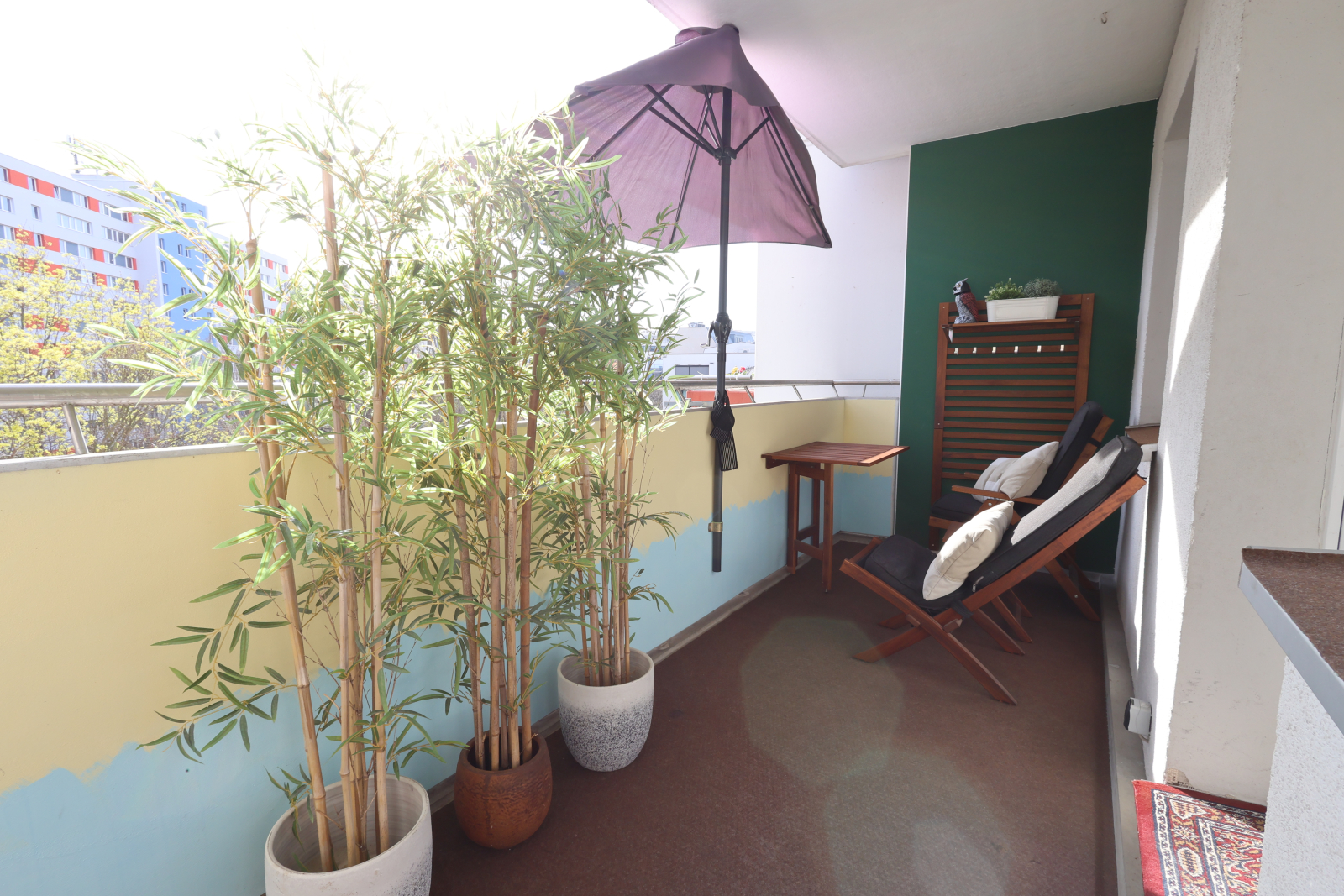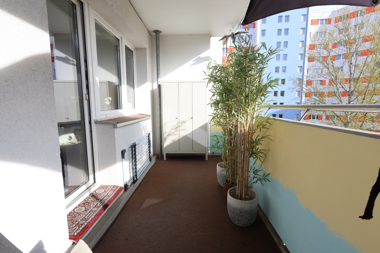 Step outside to a large balcony with a seating area, sun umbrella, and just enough space to sip coffee, scroll through travel pics, and judge pigeons like a true Berliner.