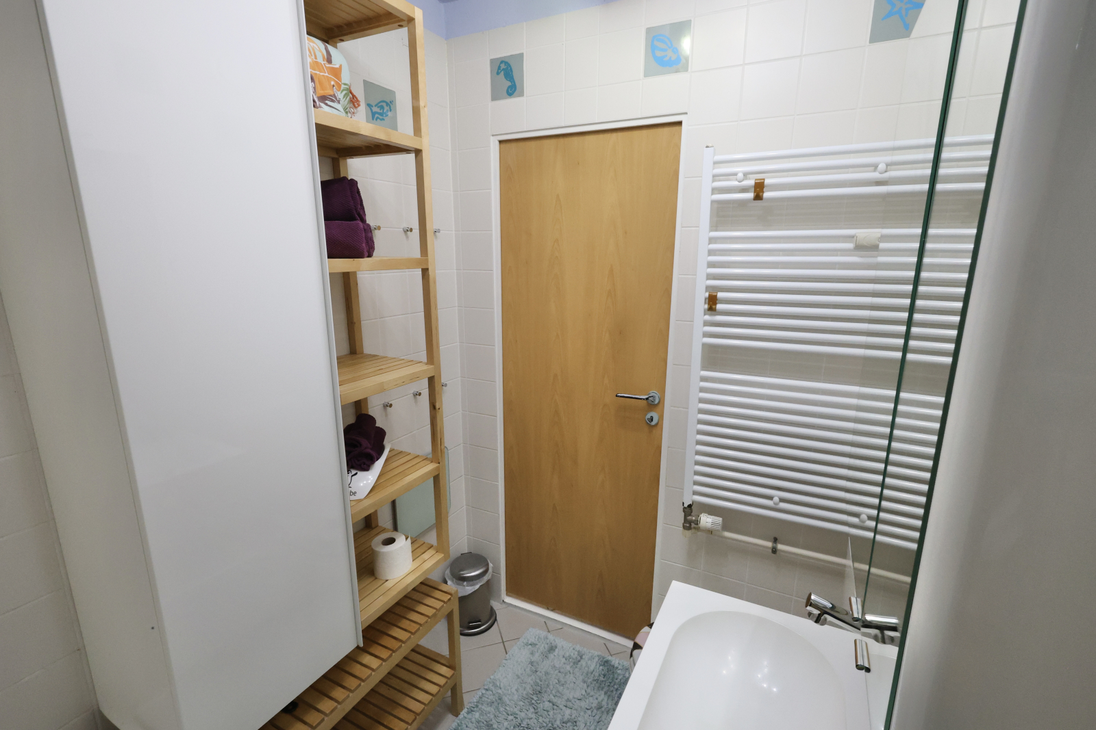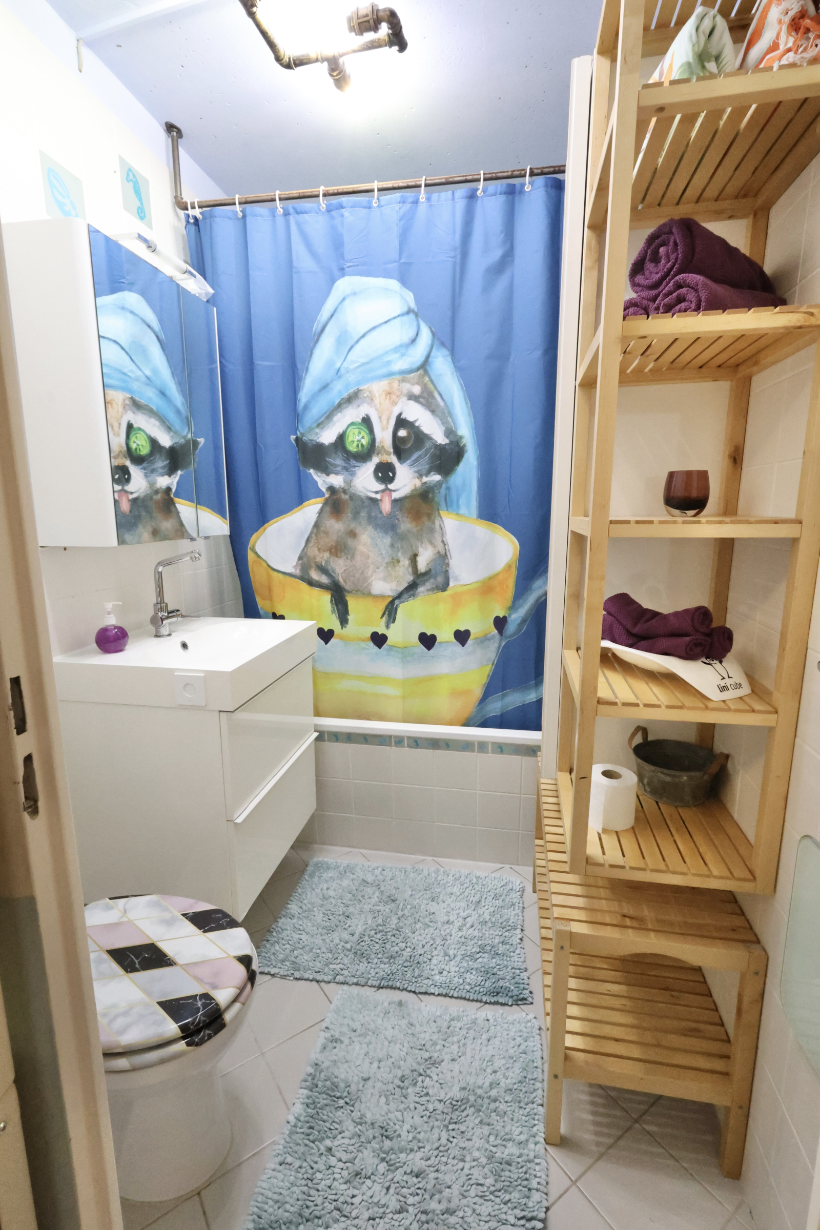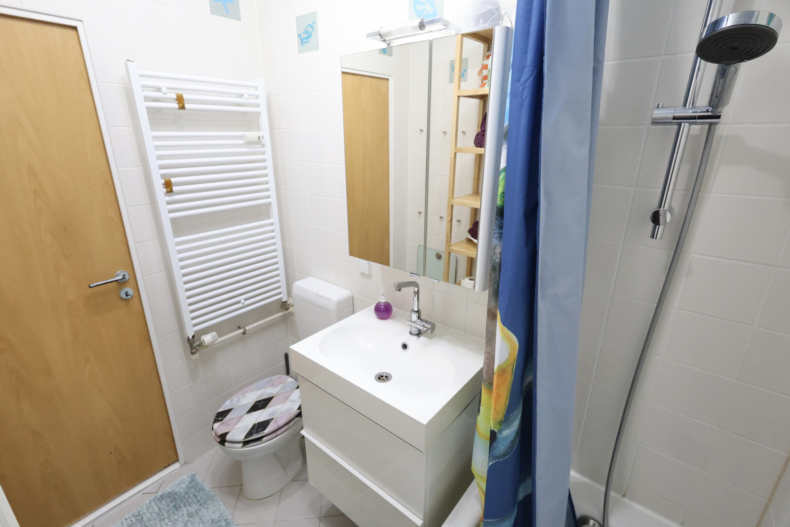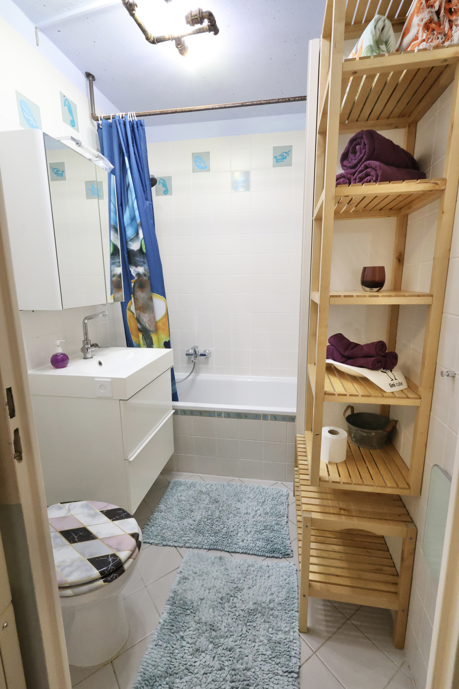 The bathroom is compact but has everything you need, including a bathtub with shower head. Because who says functional can’t be fab?
