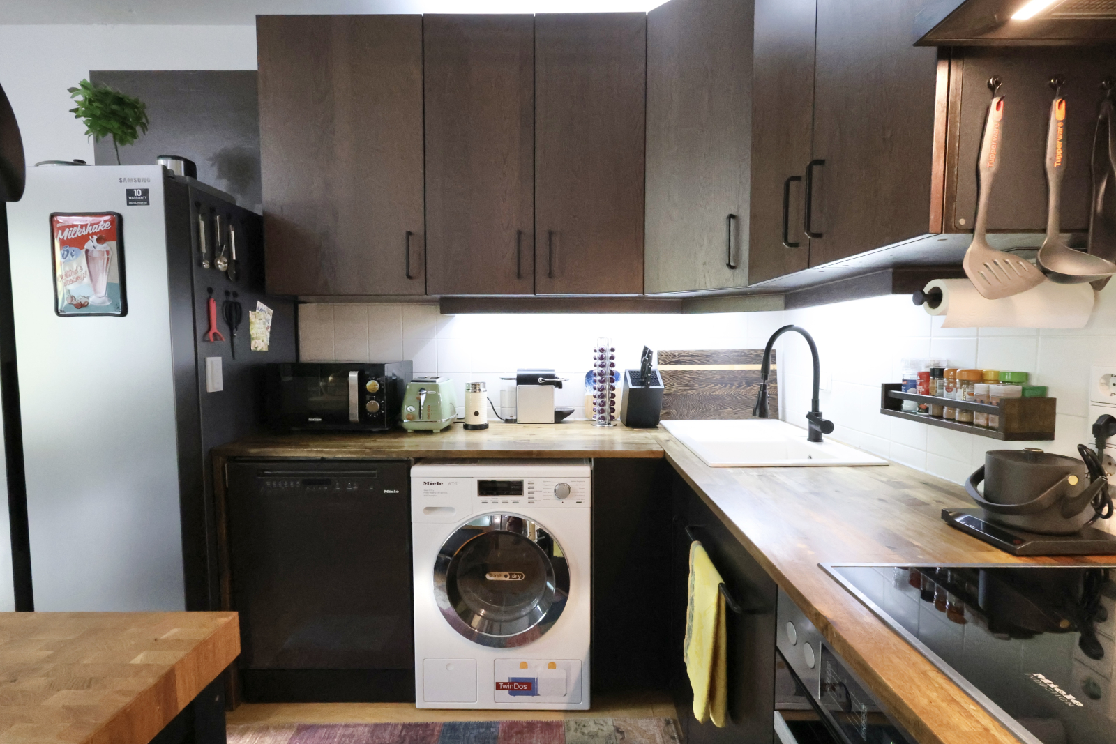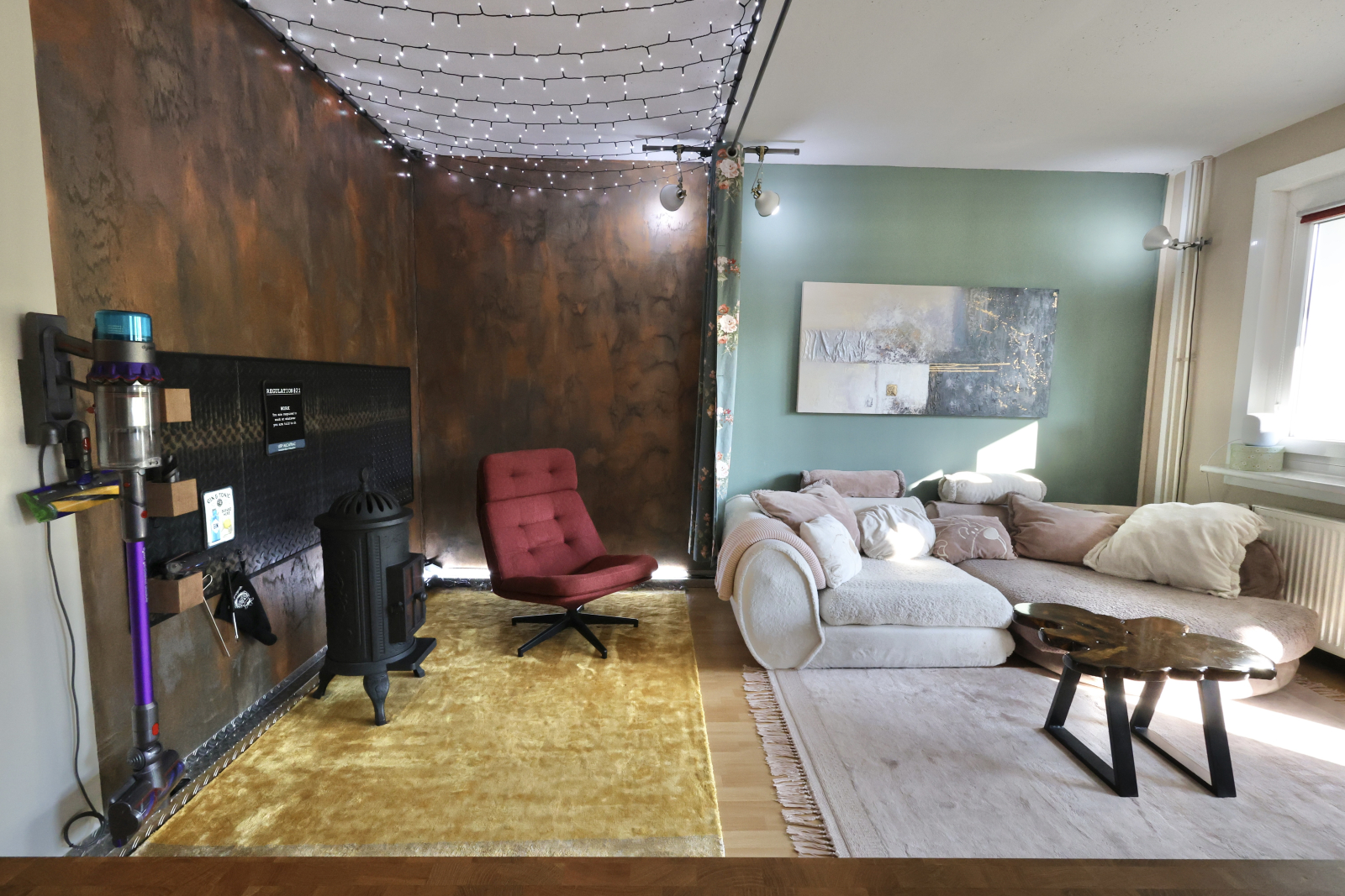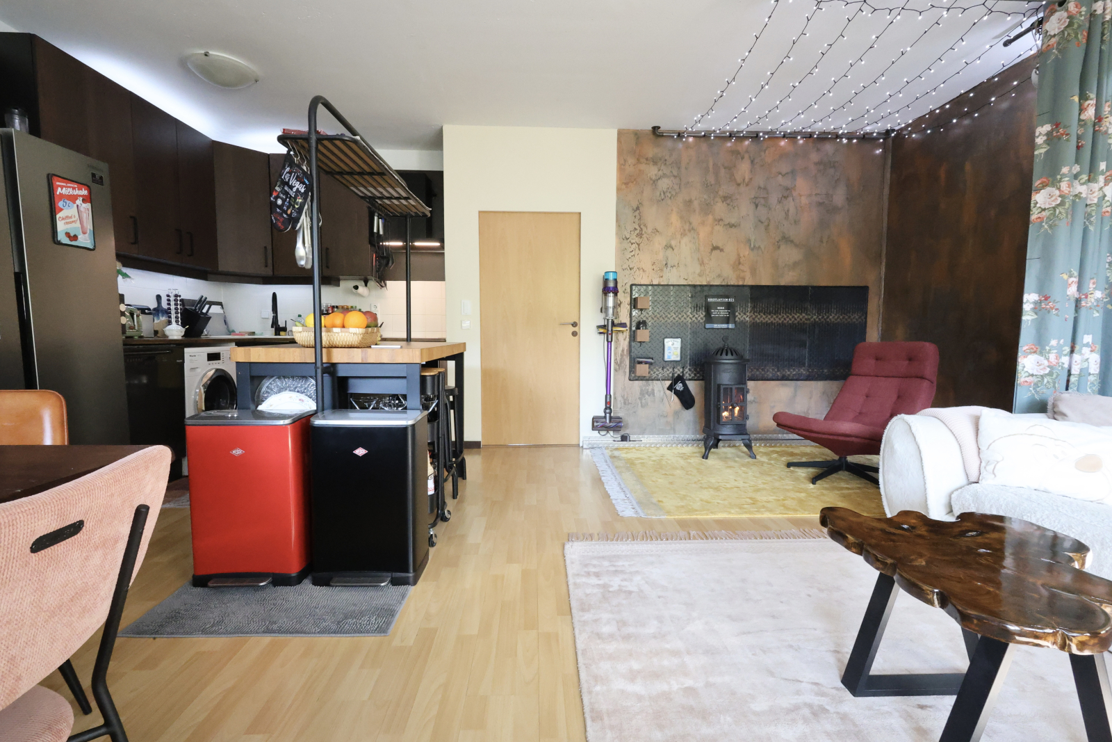 Then there’s the heart of the home: our open-plan kitchen and living space, complete with an ethanol fireplace for instant winter coziness and a projector for movie nights in. The kitchen’s kitted out with Miele, Samsung, and enough gadgets to satisfy even picky foodies.