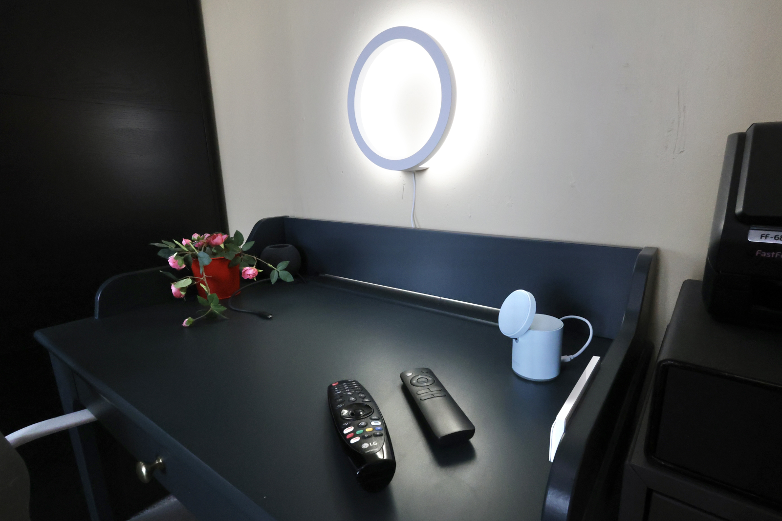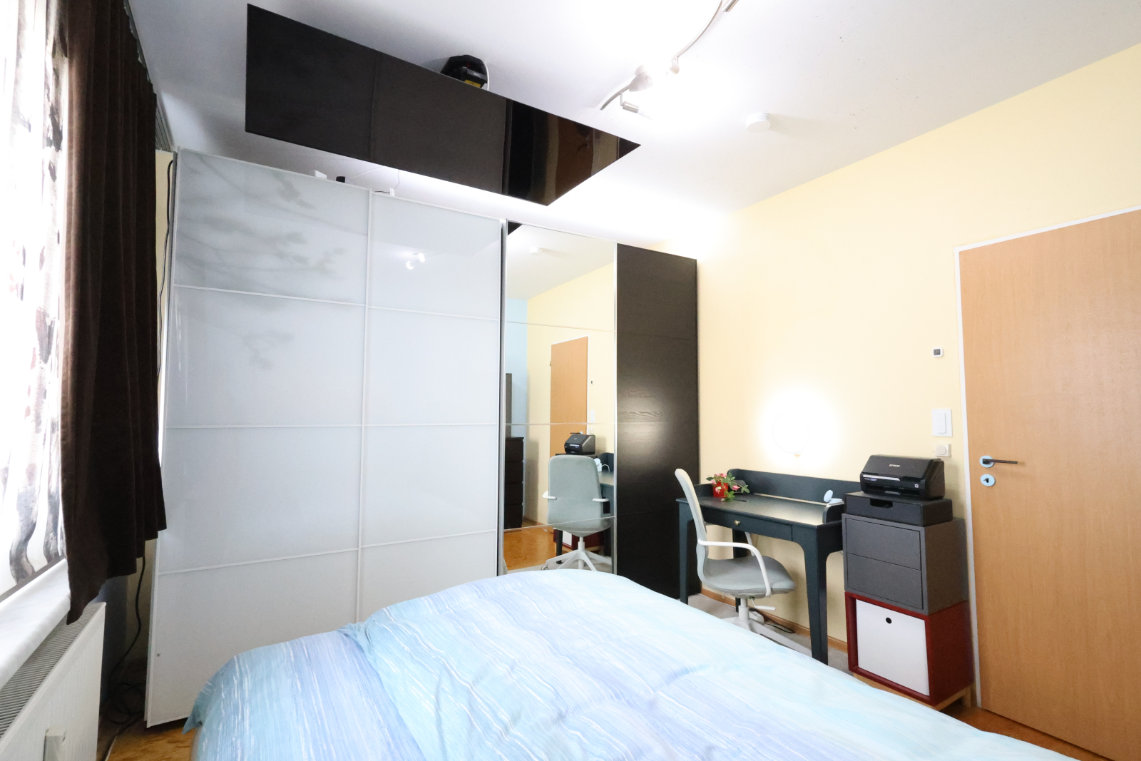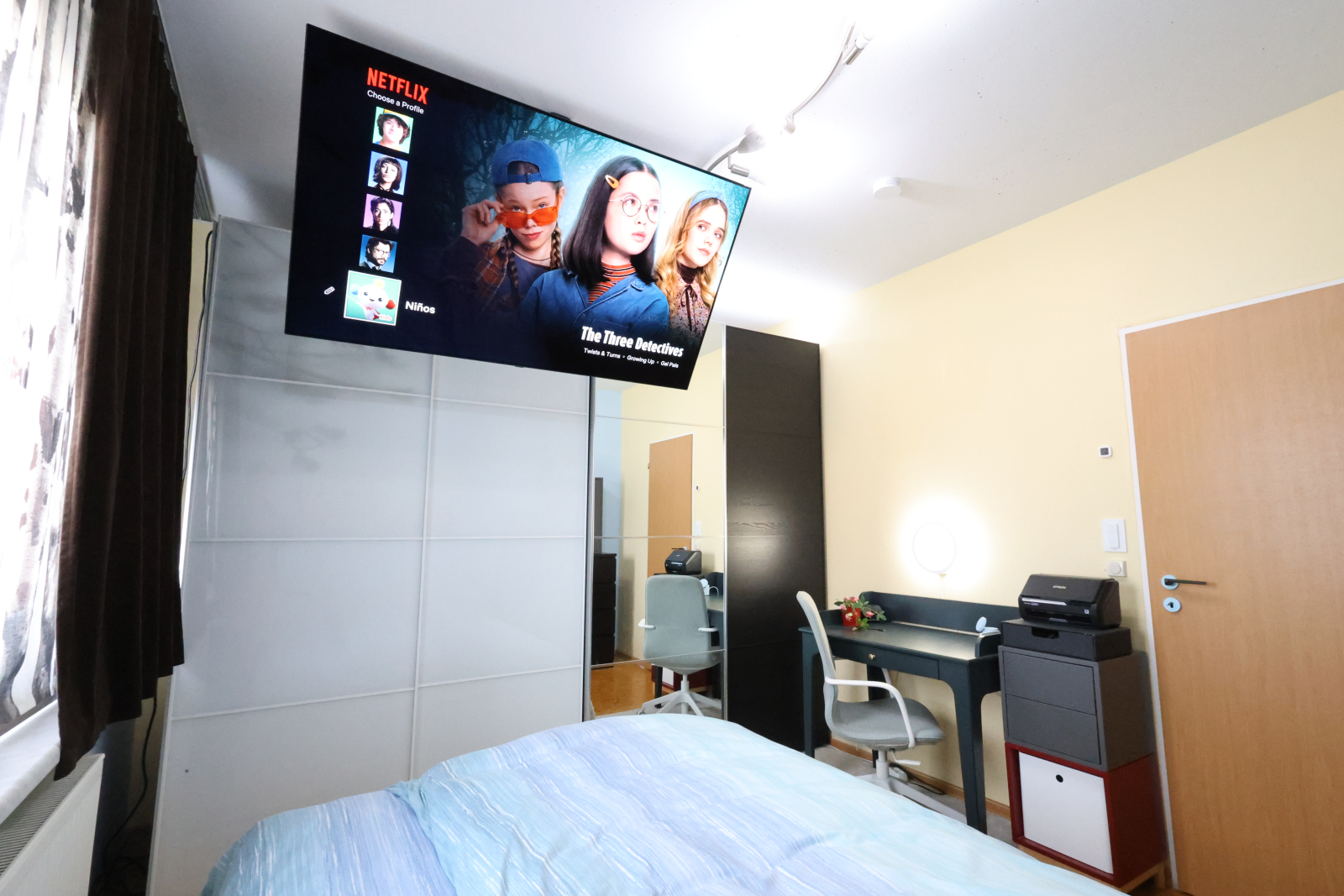 • A master bedroom with a 140cm bed, wardrobe, and a work desk… and oh, did we mention the 65” ceiling-mounted TV that drops down like magic for your own cinema night?