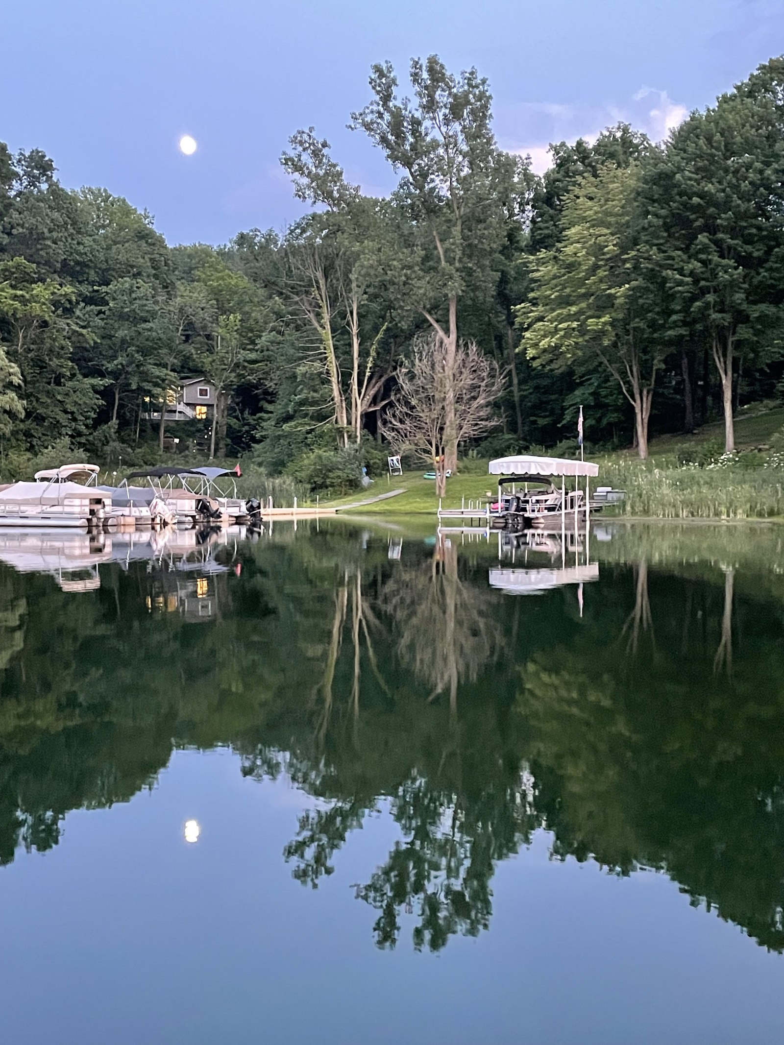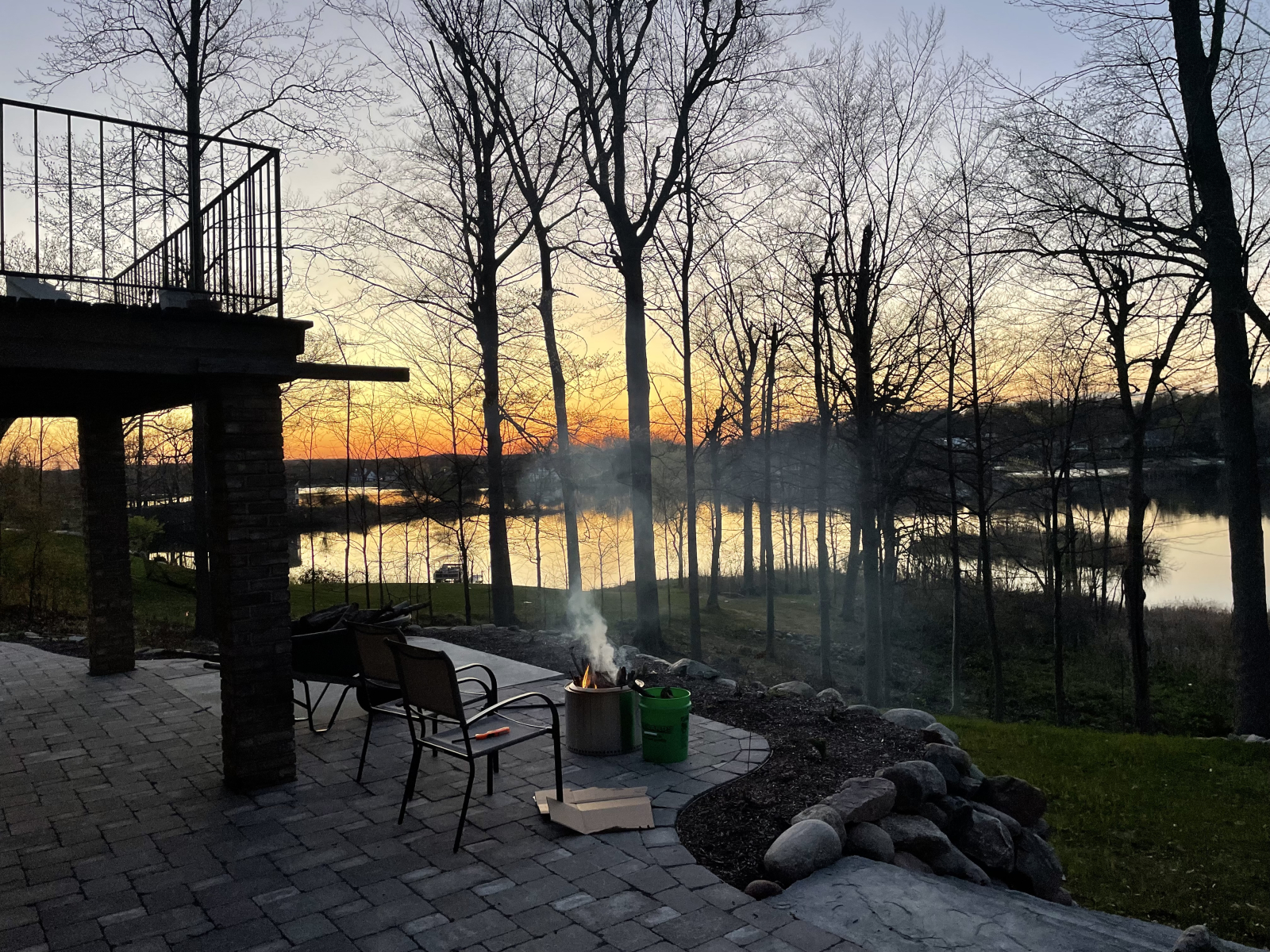 A backyard patio with sunset views and access to the lake, kayaks, and community beach and park. Older, established neighborhood with year around residents and mature trees.