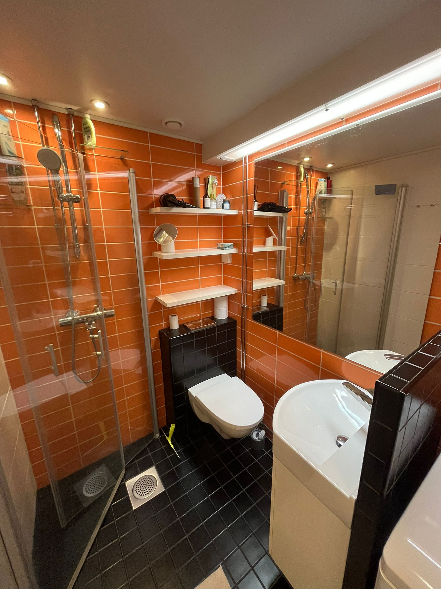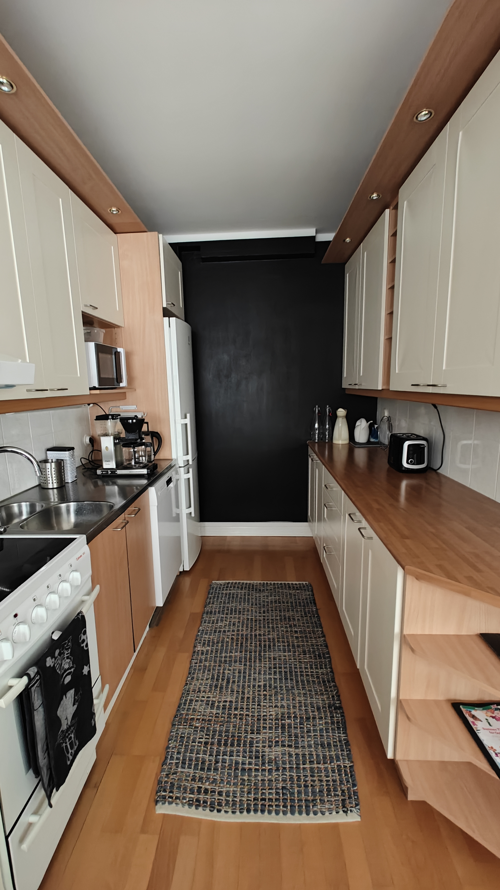 The kitchen is fully equipped with a dishwasher, Moccamaster coffee maker, kettle, toaster, tableware, cleaning supplies, coffee essentials, and spices.