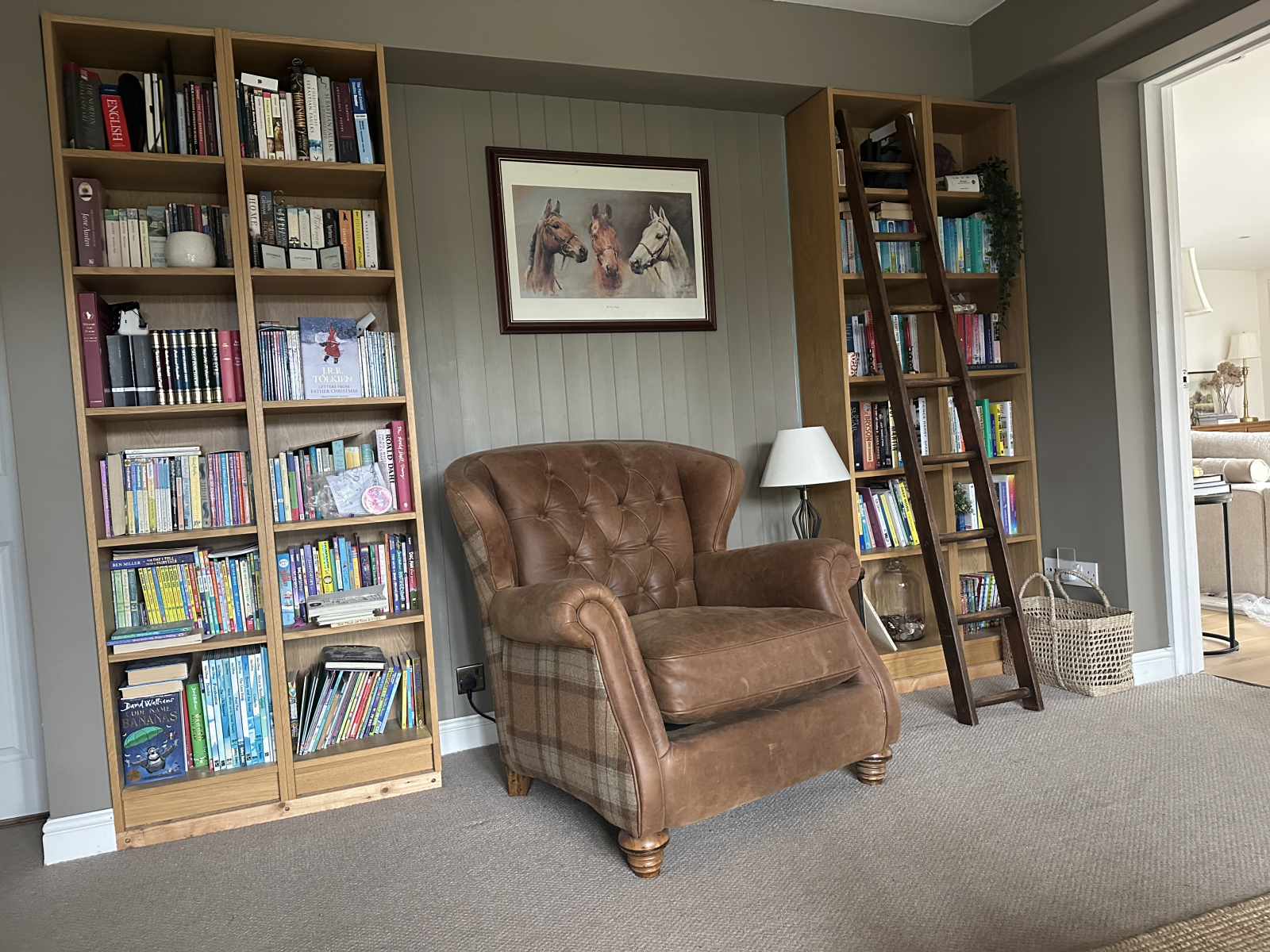 In our cosy snug is a wood burning fireplace, with recliner sofa and library shelves which you’re welcome to browse and borrow books from. This room too has French double doors out to the garden.
