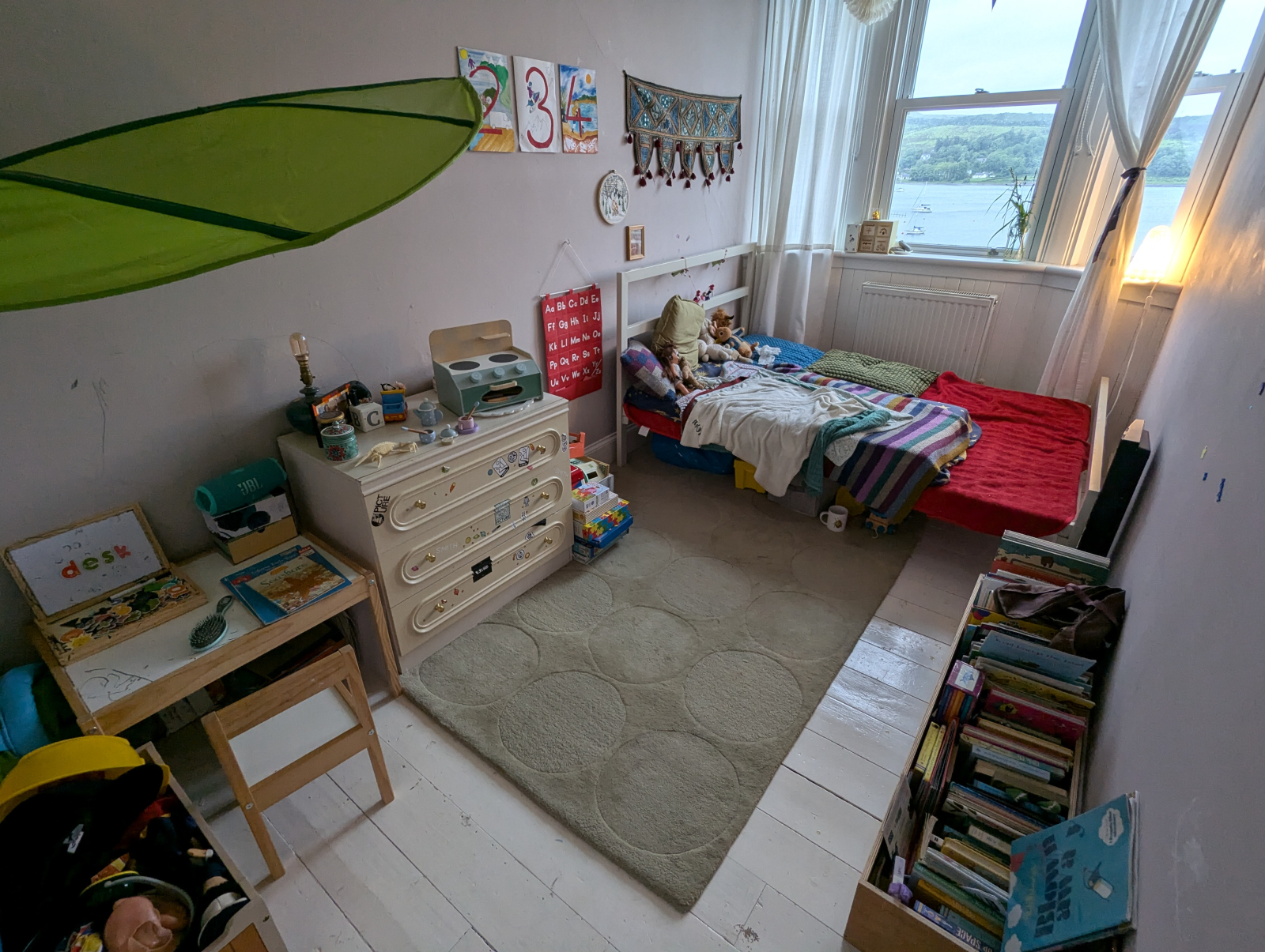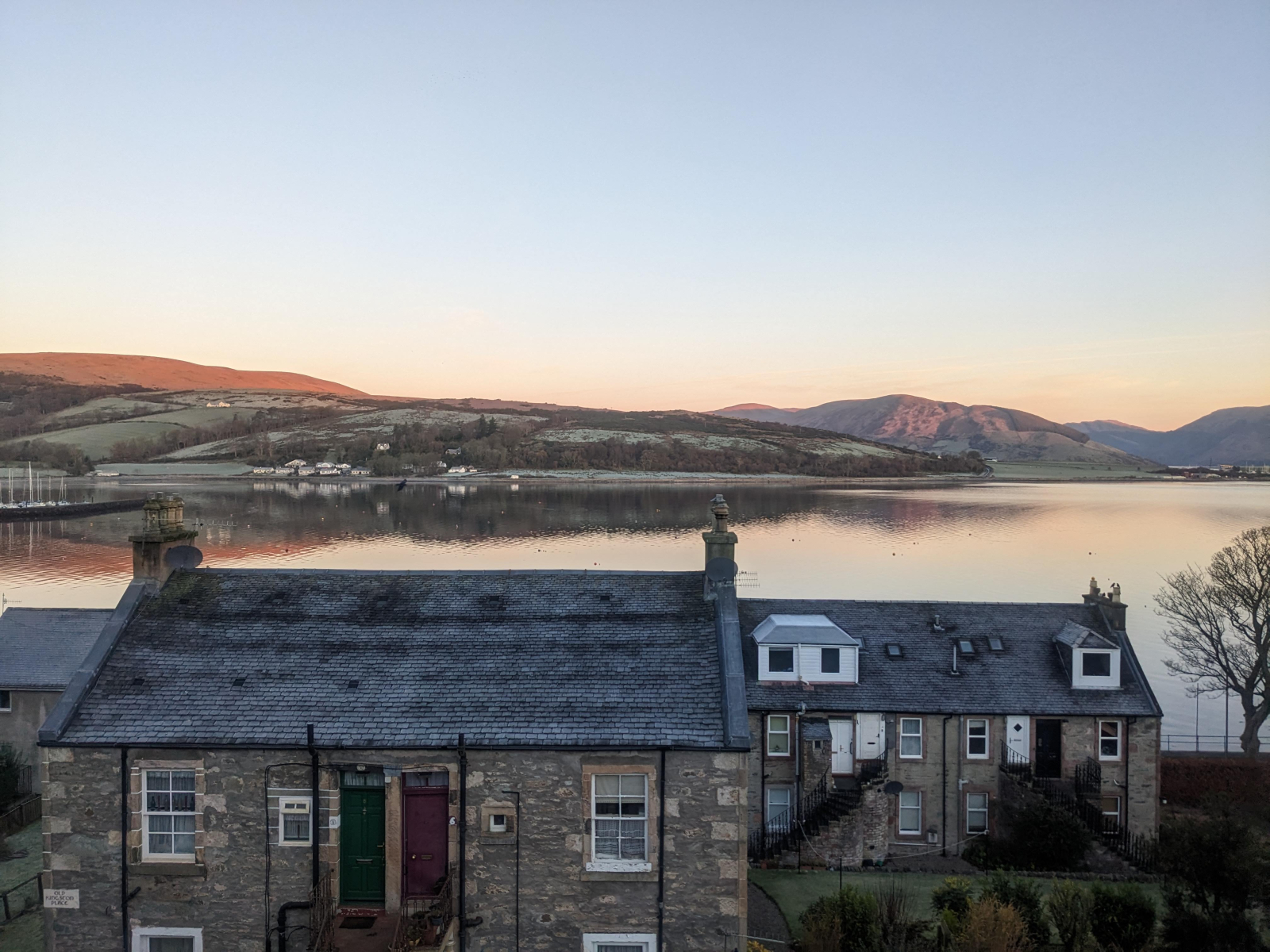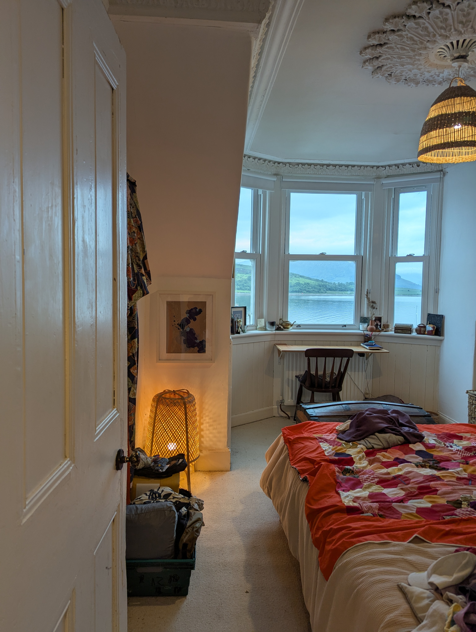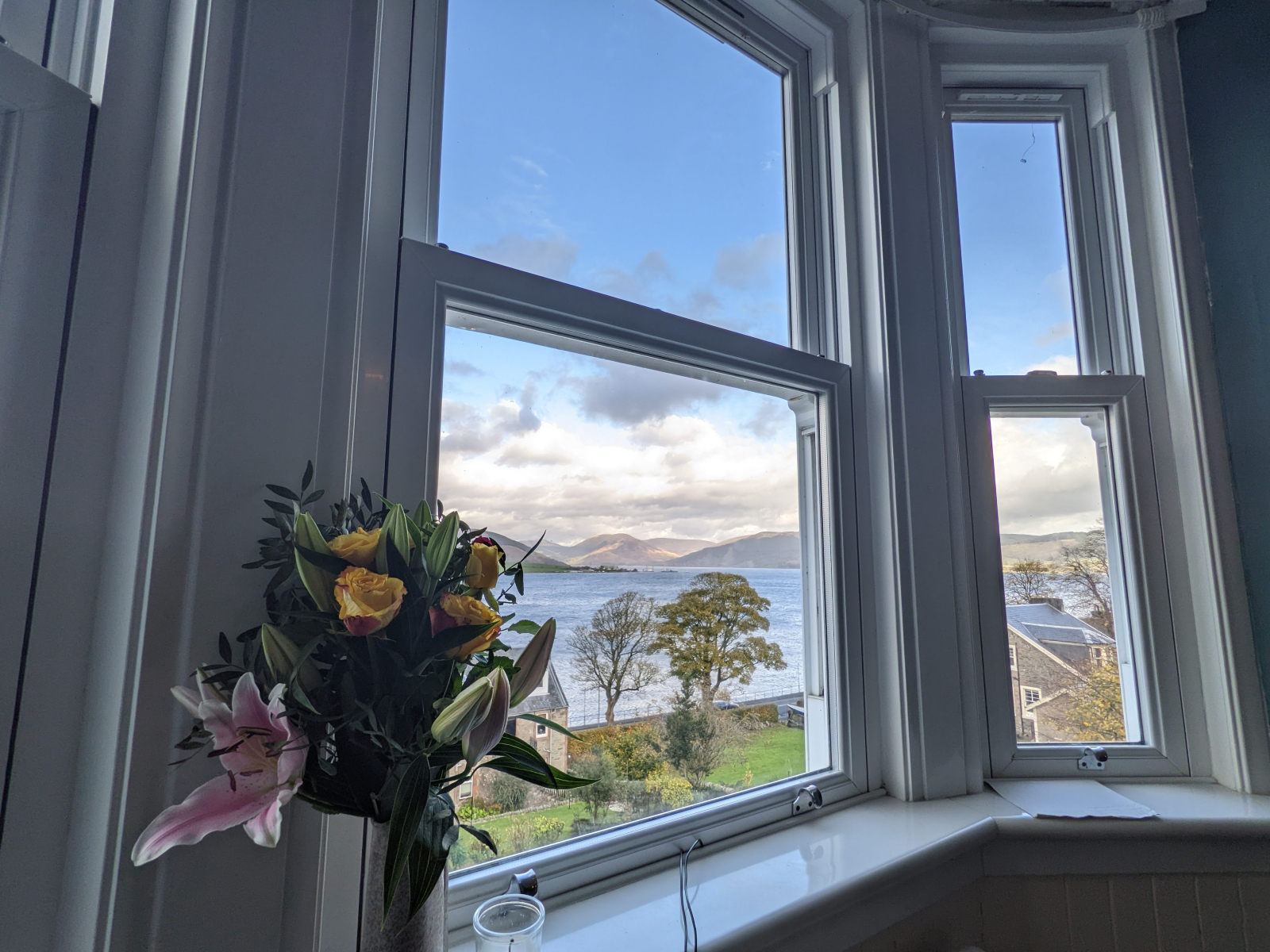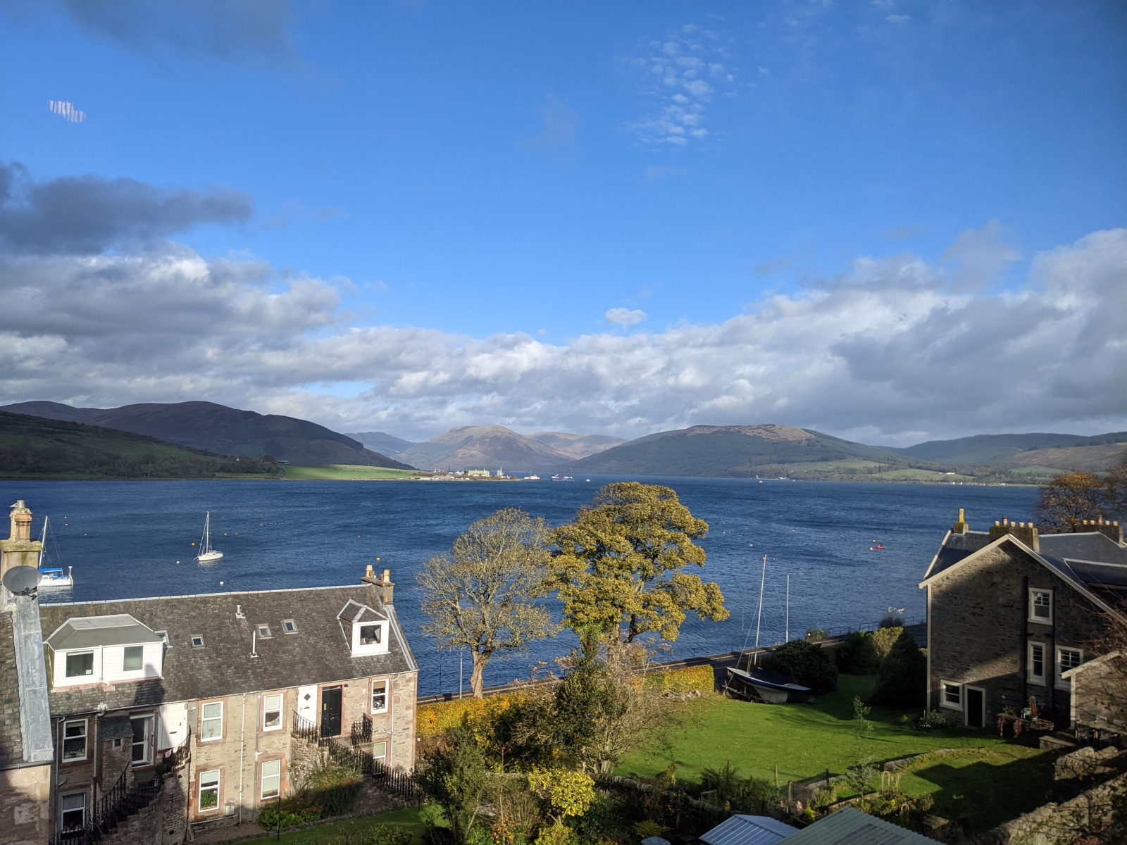 The flat is called the Crow's Nest. It is on the top floor of a traditional Scottish tenement building, giving unobstructed views across the Kyles of Bute.