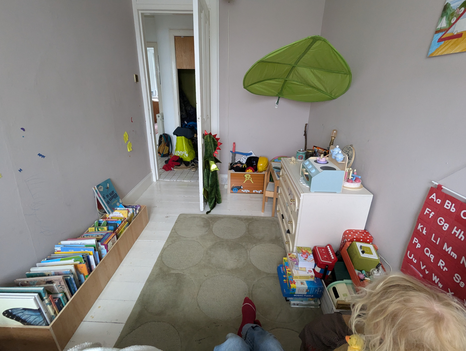 There are 2 bedrooms with 2 double beds and one sofa bed in the living room. We are planning on making our daughters room more distinctly into a child's bedroom soon, so it wouldn't be appropriate for an adult, despite the double bed.