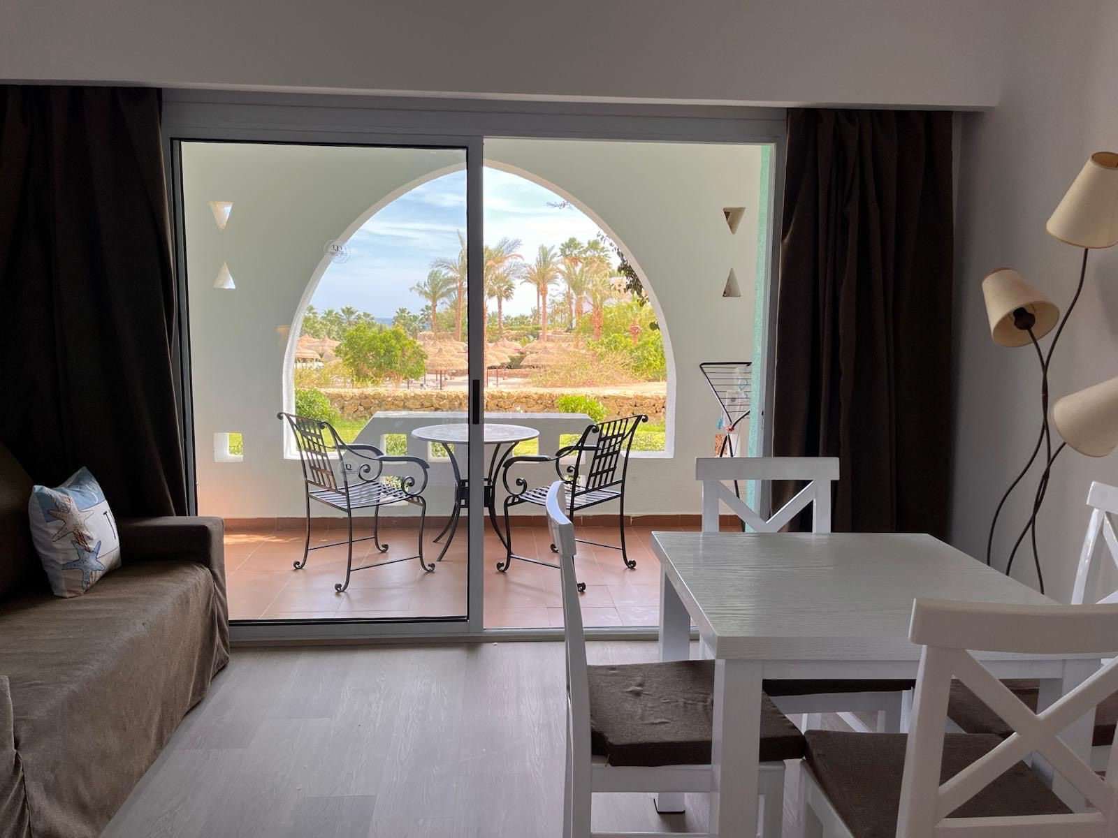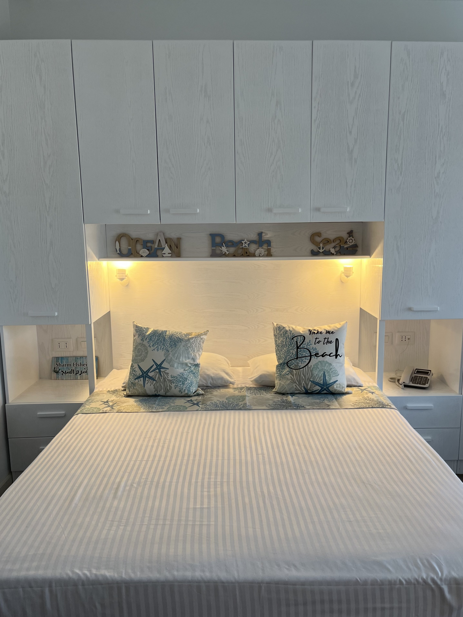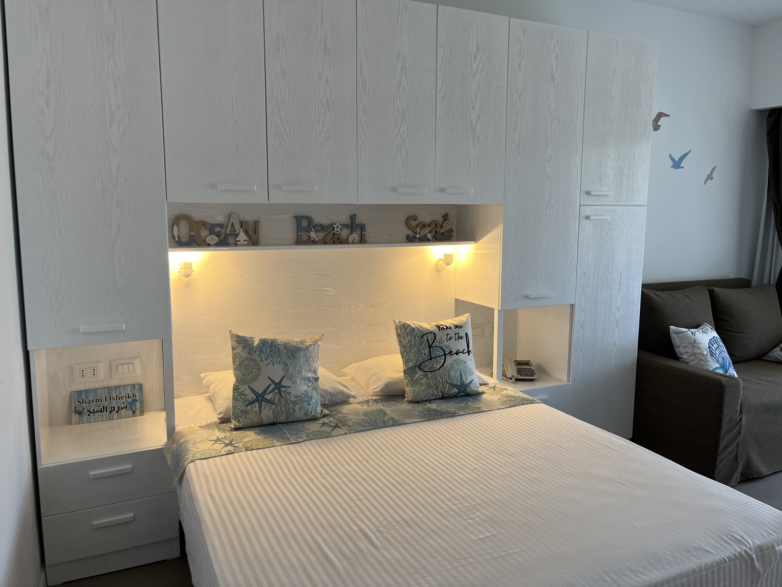 Welcome to our bright studio apartment in Sharm el Sheikh, a corner of paradise with beautiful views of the sea and the pool. The house is air-conditioned, spacious and welcoming, furnished with a modern and marine style that immediately transmits relaxation and comfort, perfect for moments of relaxation.