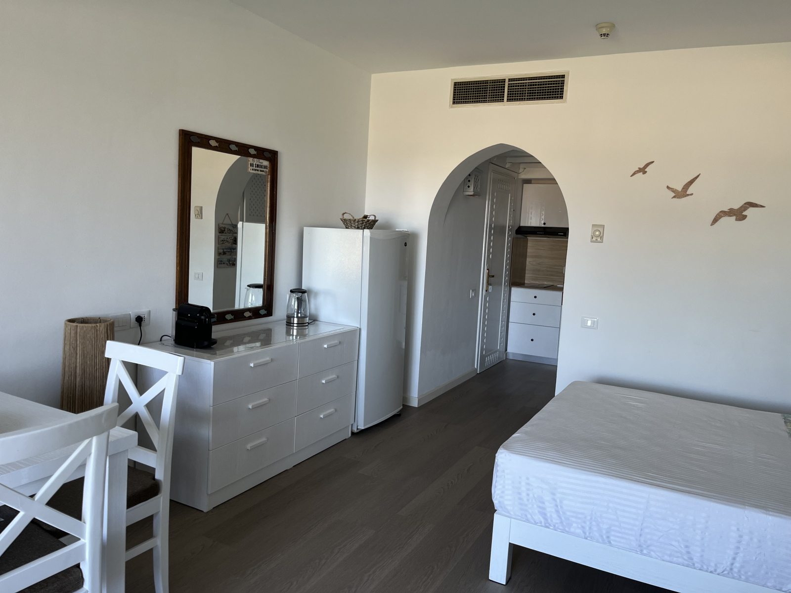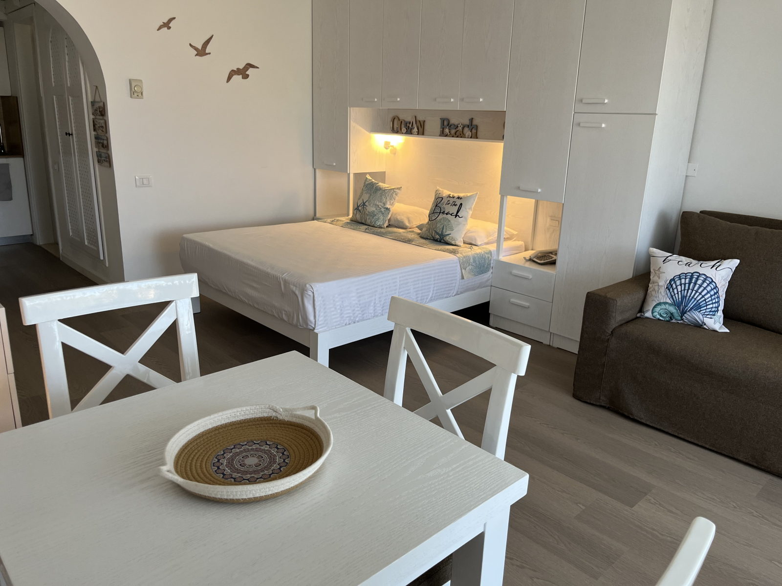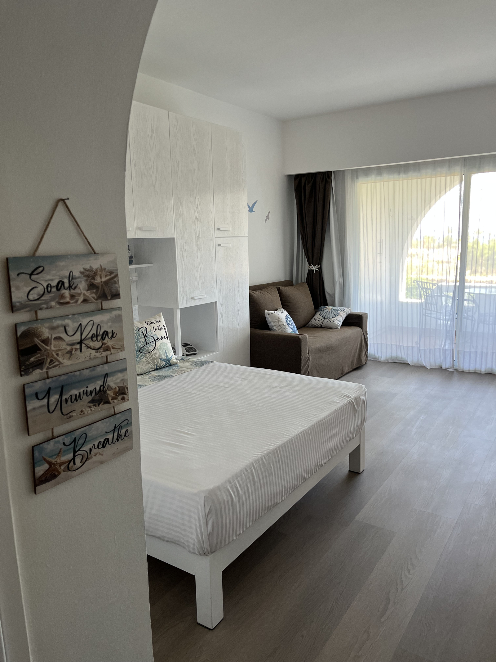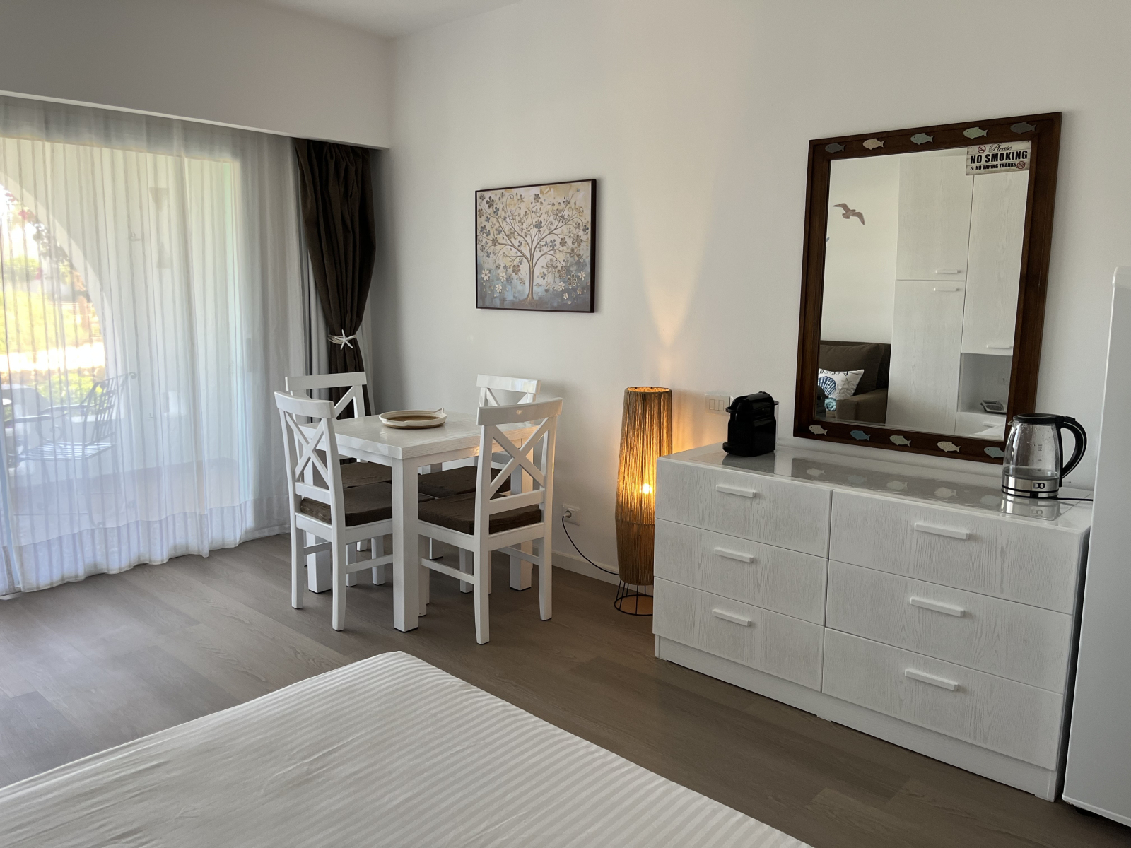 Large studio apartment with a fully equipped kitchenette and a modern bathroom with a comfortable shower. The apartment opens onto a terrace overlooking the sea and pool.