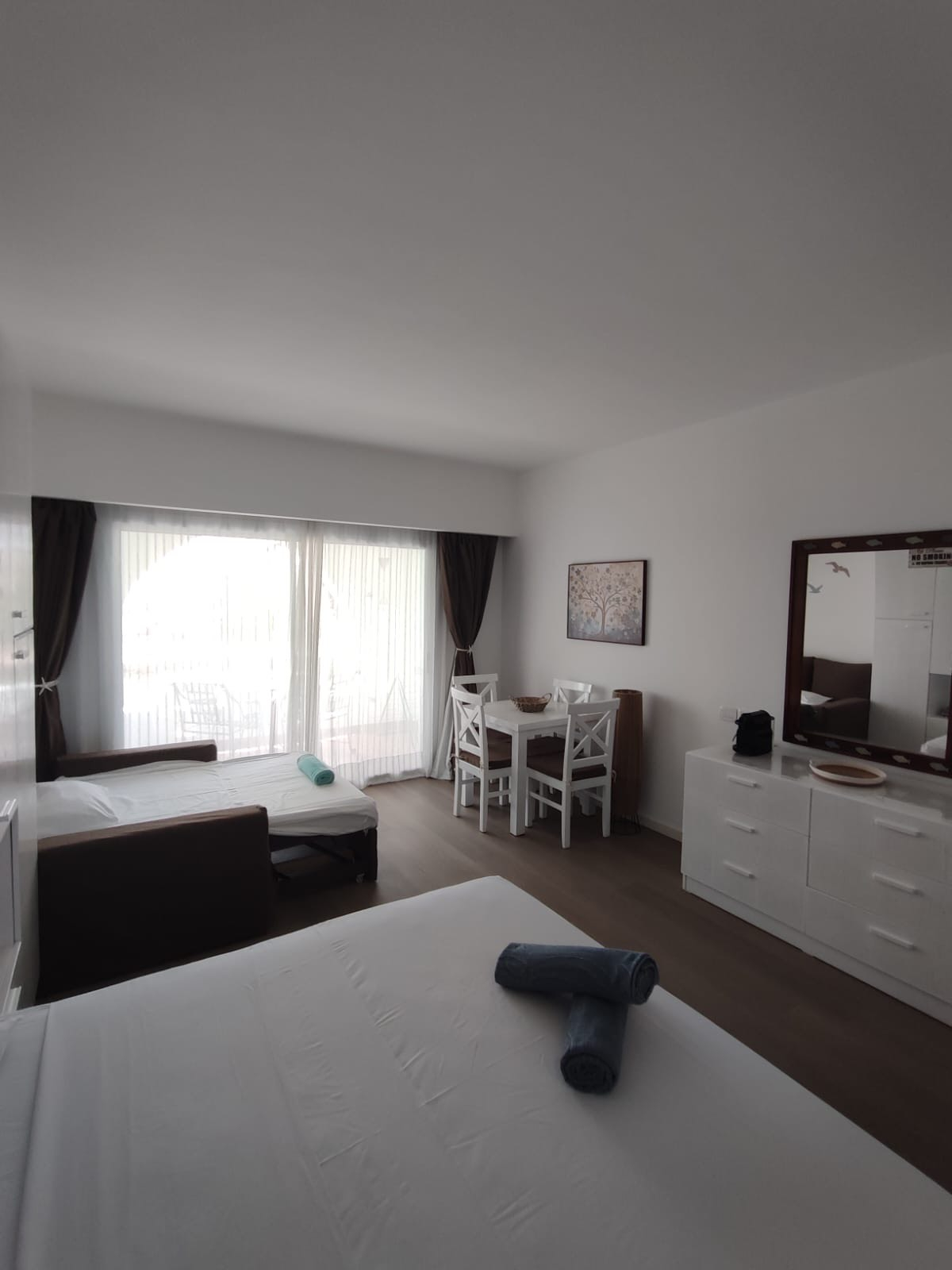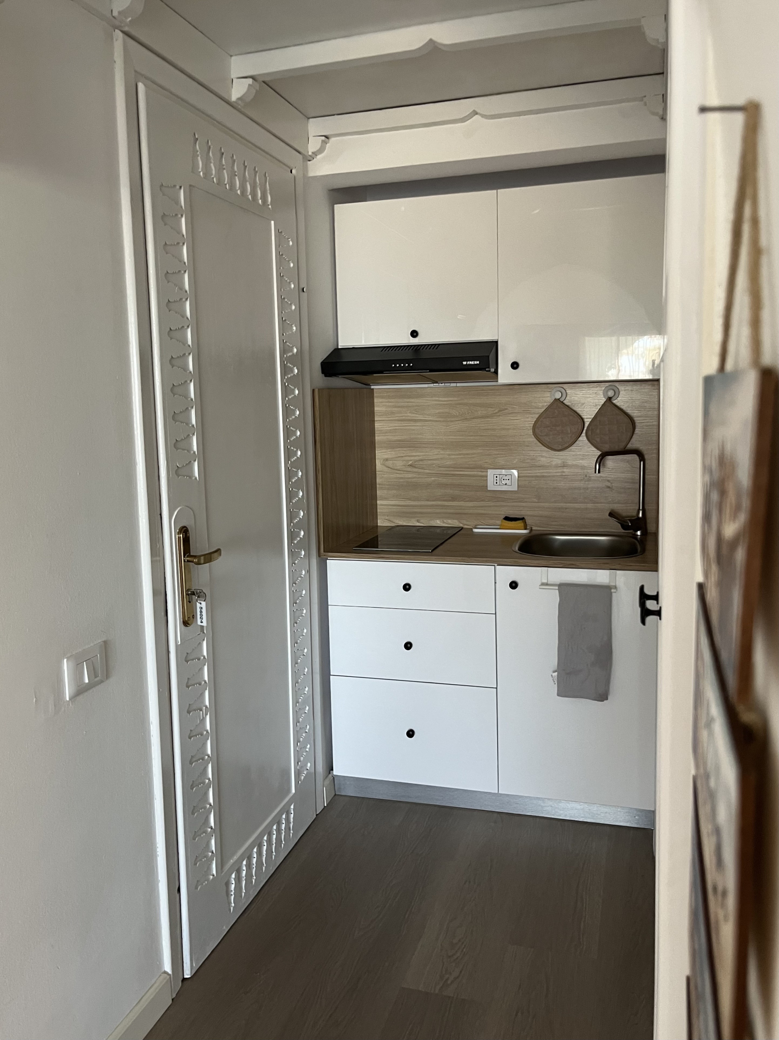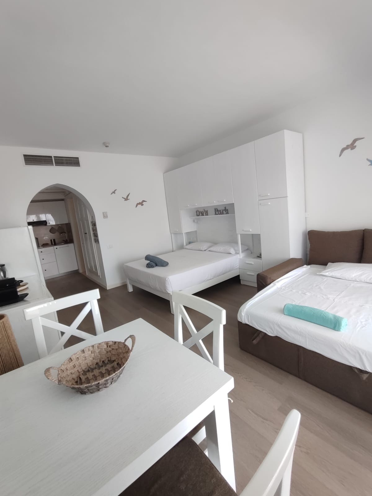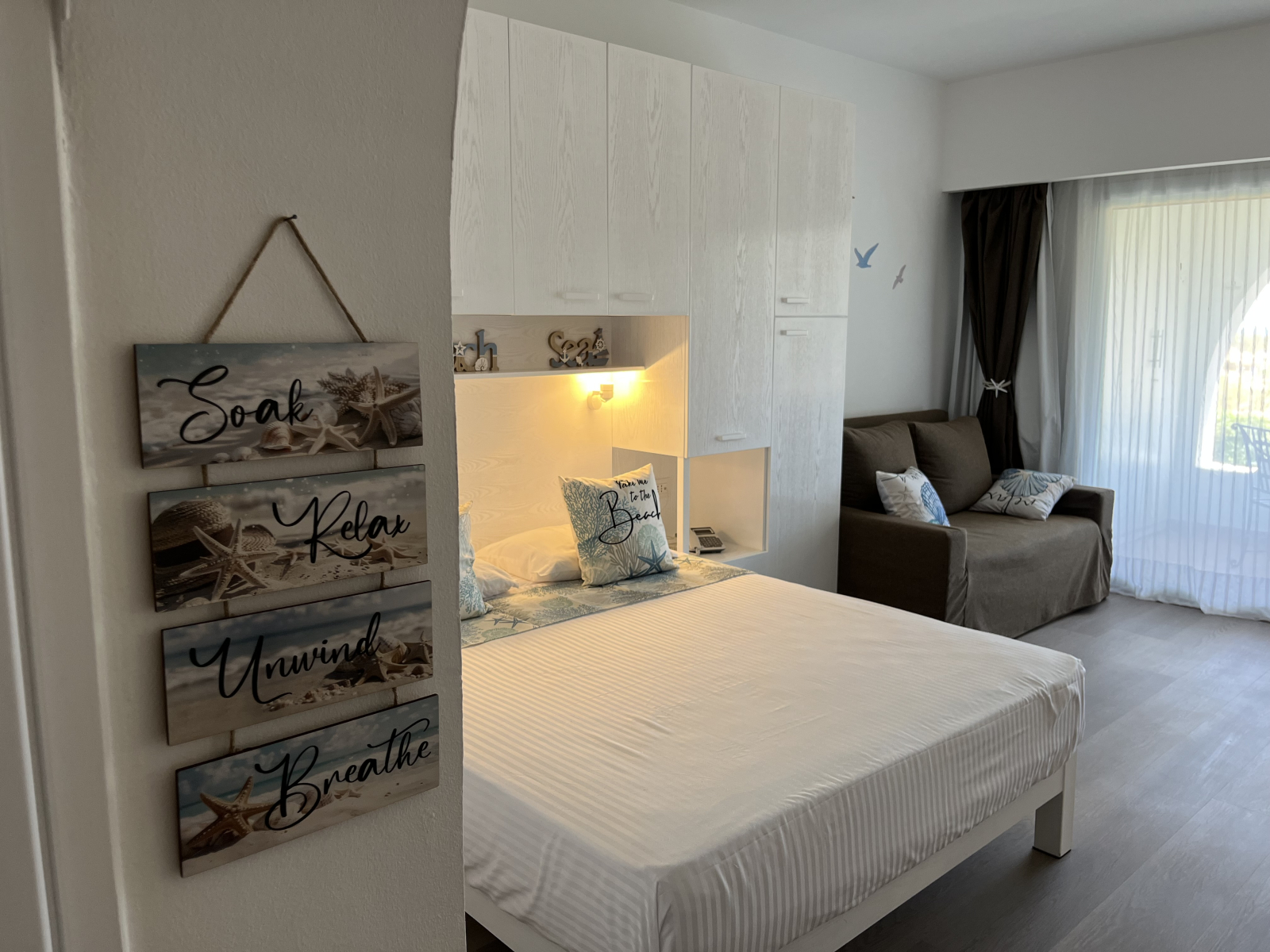 Large studio apartment with a fully equipped kitchenette and a modern bathroom with a comfortable shower. The apartment opens onto a terrace overlooking the sea and pool.
