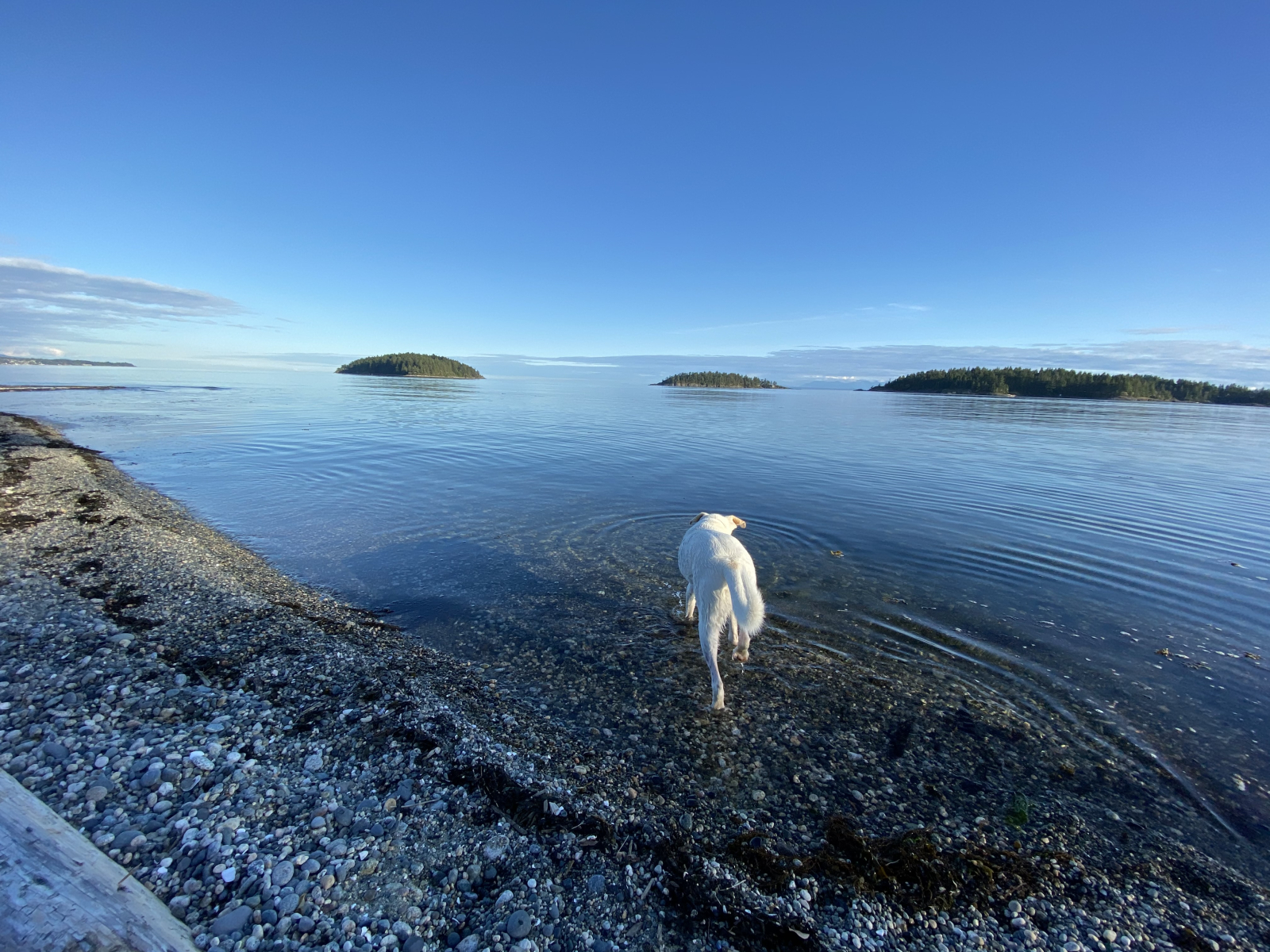 Rocks arranged as steps from the lawn to the beach. The Trail Islands a short paddle away. There are homes on each of these and a small collection of rock outcrops nearby that seals have made their home.