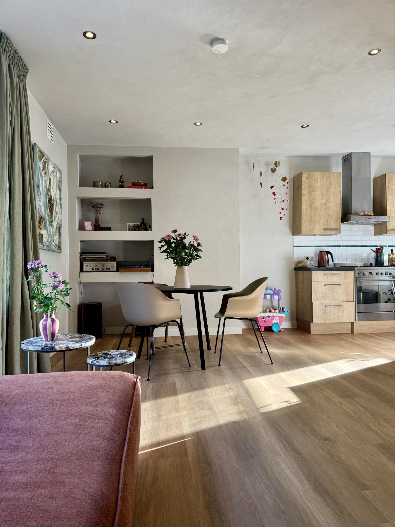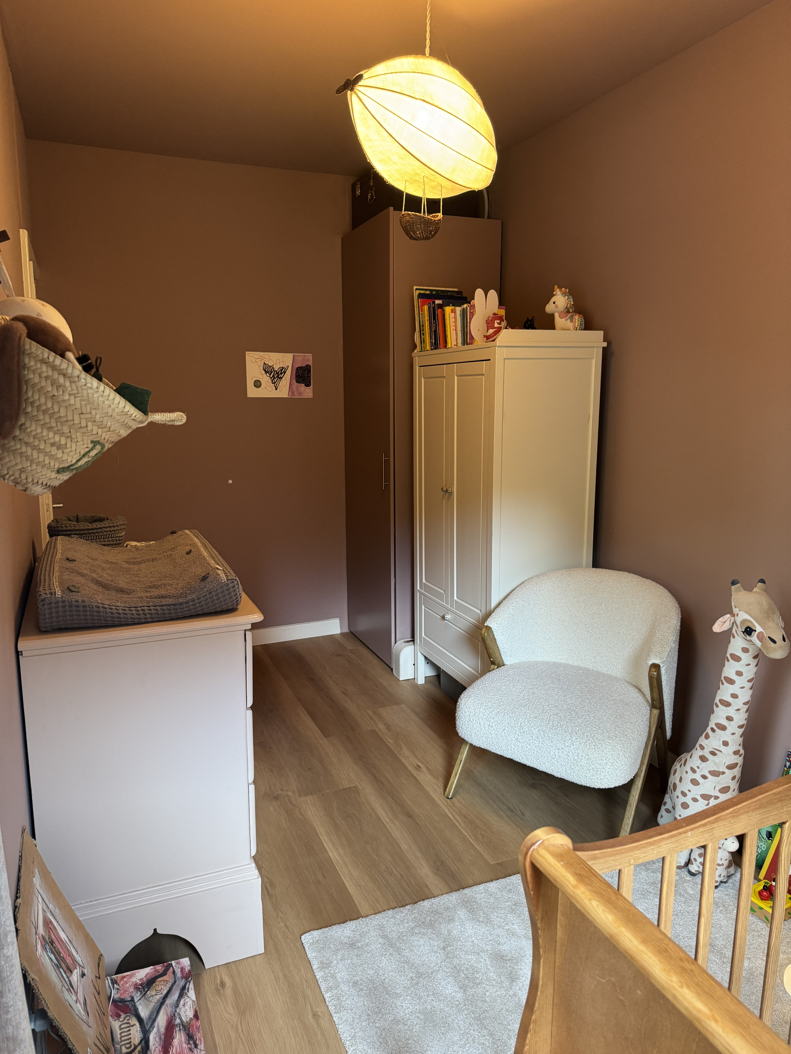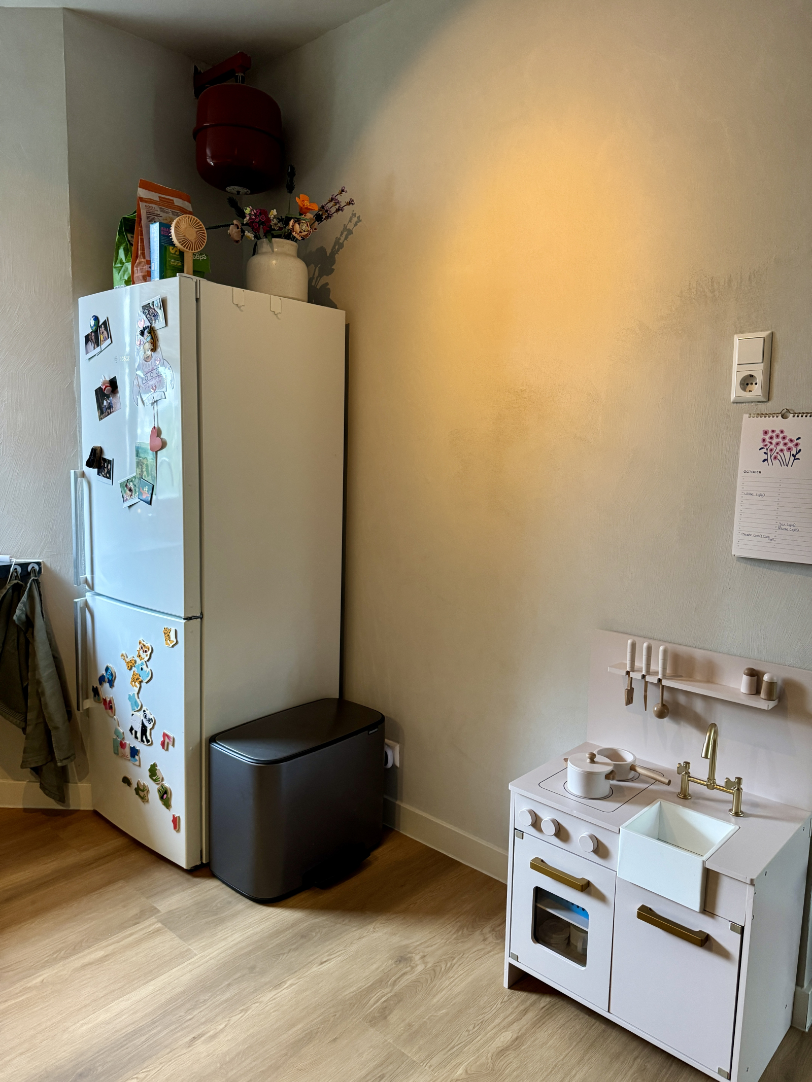 The hall gives access to two bedrooms. One for a baby/toddler (bed 60x120cm) and one for adults with a double bed (160x200cm). There is a storage space where practical things are stored, such as the vacuum cleaner, mop and a drying rack. The bathroom can also be reached from the hall. This has a bath, toilet, sink and a machine with washer-dryer combination. Finally, there is a door to the spacious living room with sitting area and dining table. There is also an open kitchen, including a mini kitchen for the little ones.