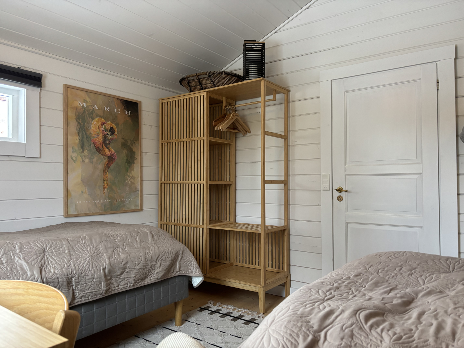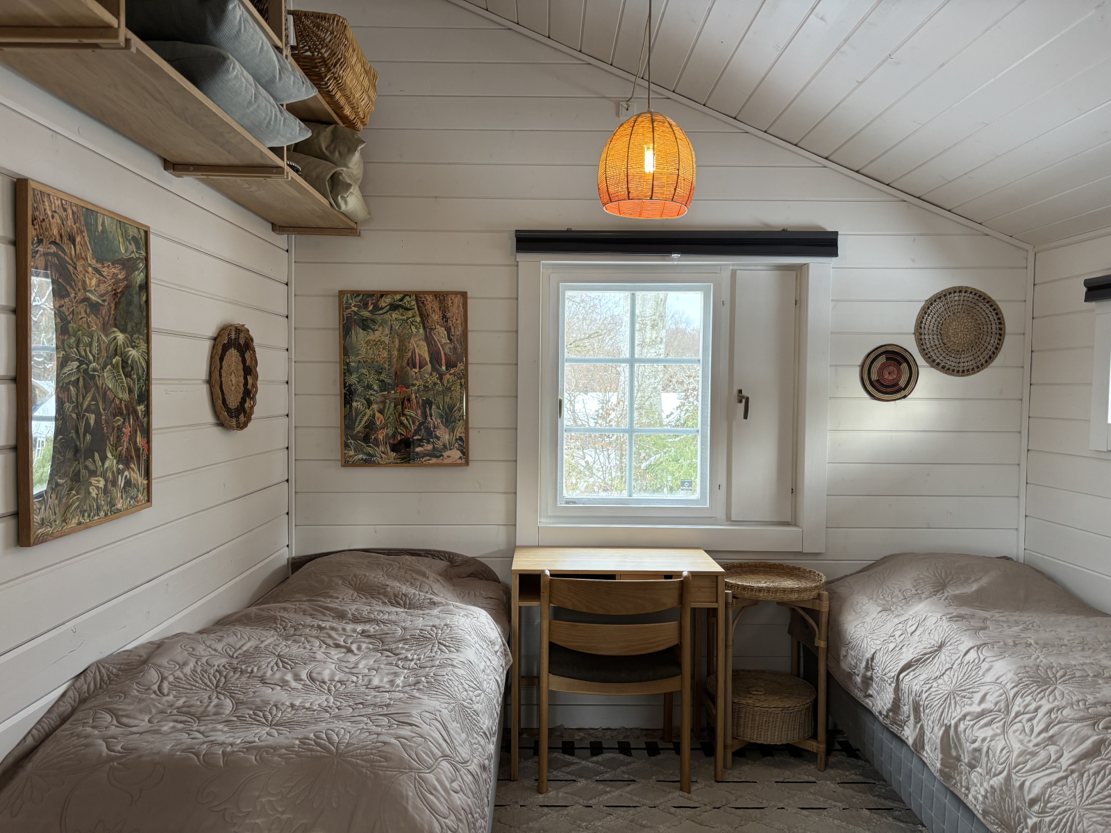 - A sleeping loft with two proper mattresses on the floor (80 cm wide each) and a foldable mattress of 140 cm wide).