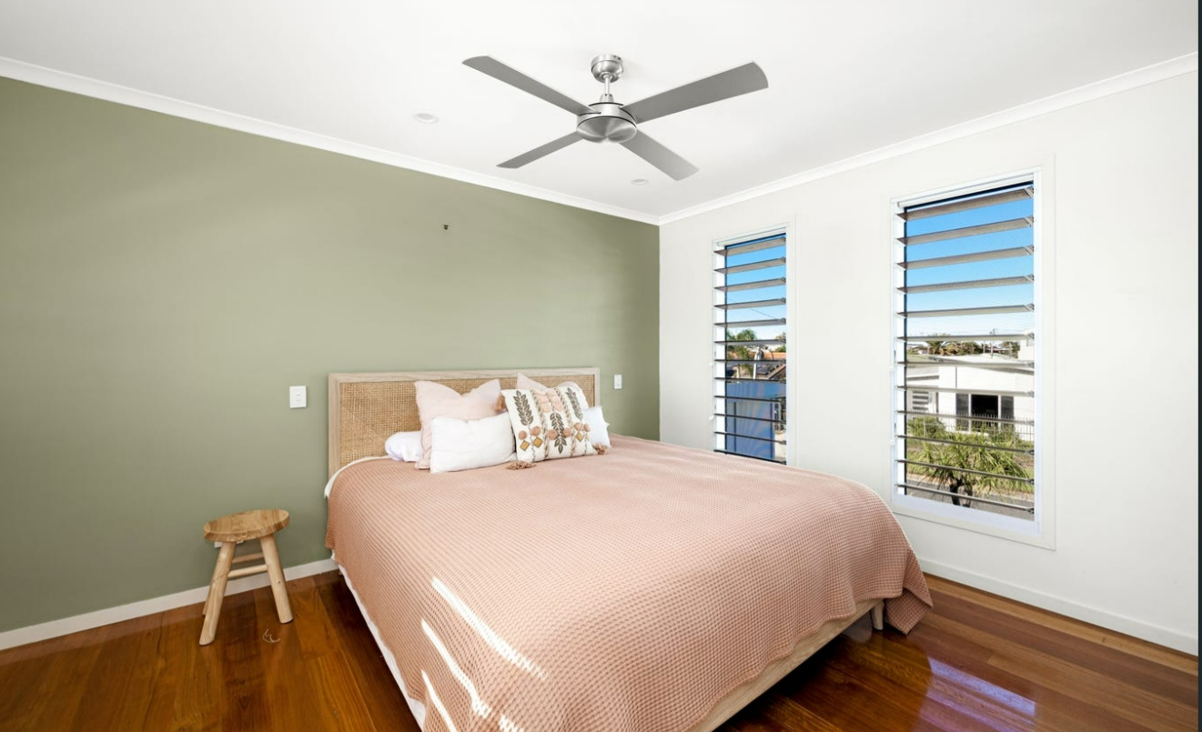 The home features air-conditioning, high raked ceilings, and timber floors in the living areas. Louvred windows capture the refreshing ocean breezes.
