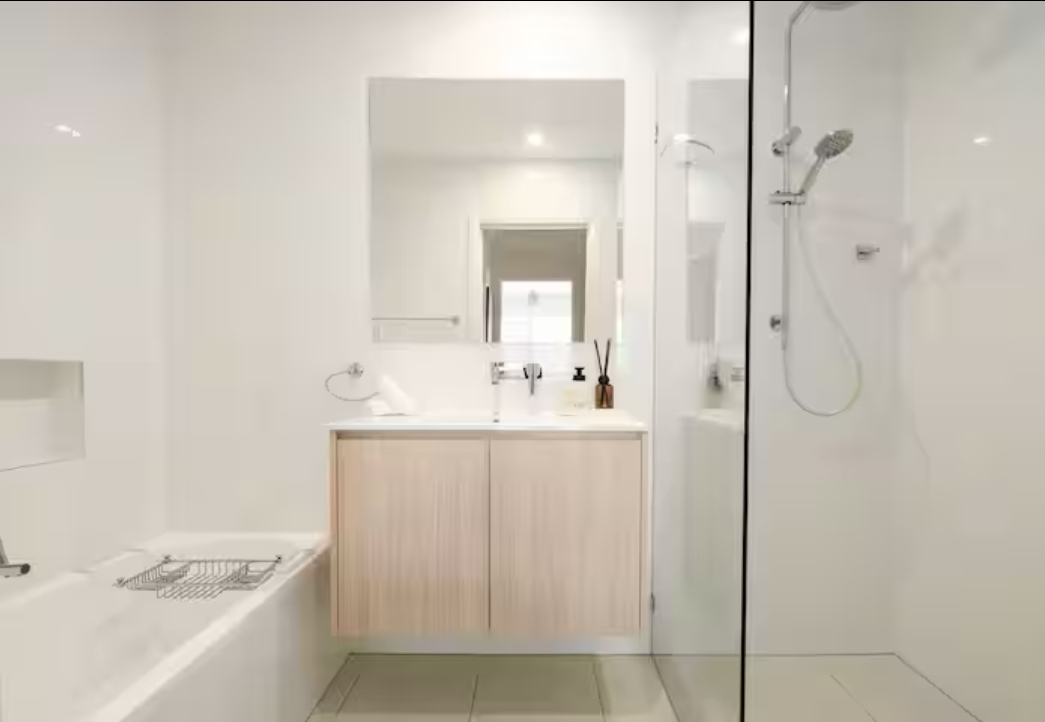 Downstairs has a living with open style kitchen and a powder room. The living space opens to a small undercover srea and open space. Upstairs has 2 bedrooms with 2 bathrooms and a small tv area.
