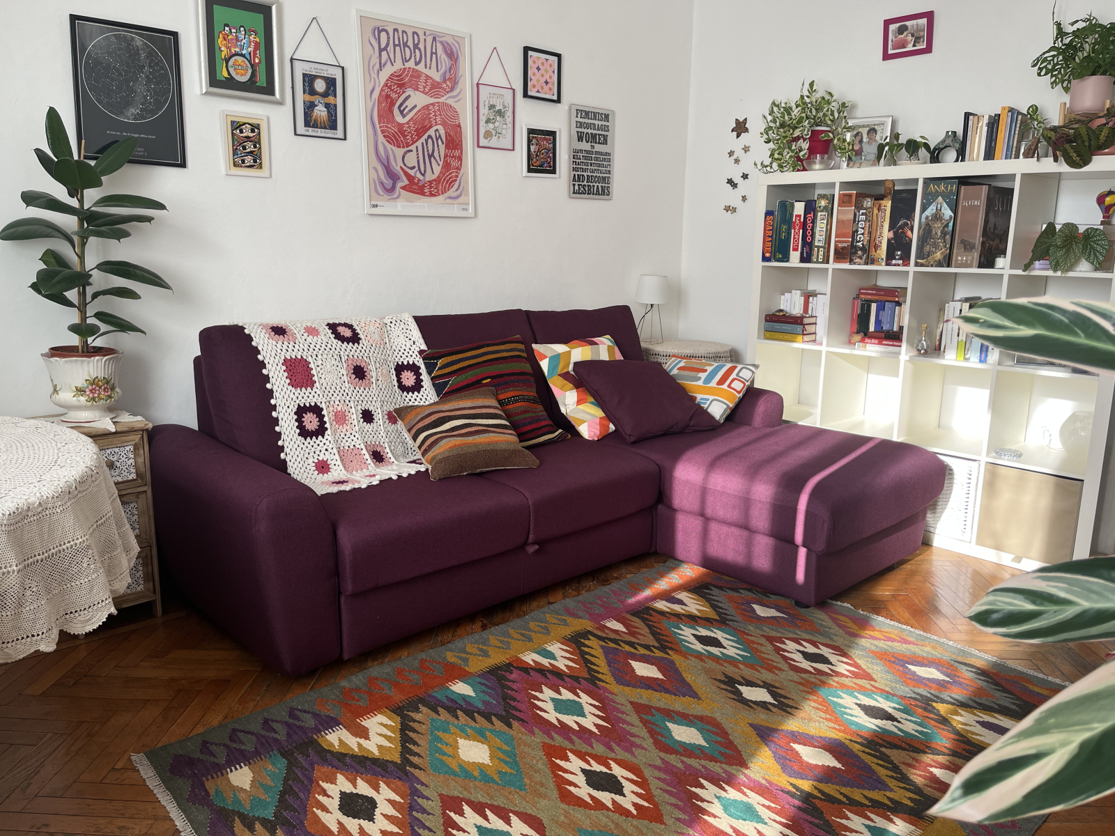 The apartment is 65 m², one bedroom with a double bed, living room with a big sofa-bed, small balcony, kitchen, bathroom and a cabinet. It's full of plants and bright colours!