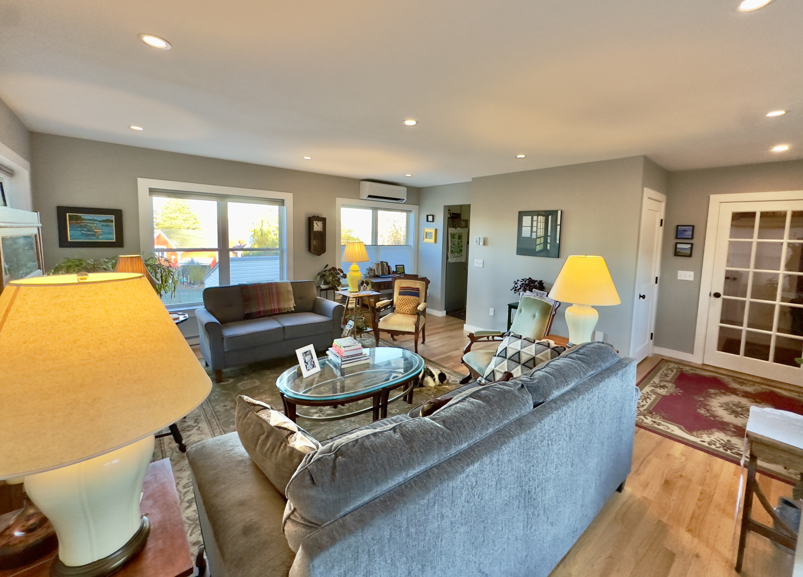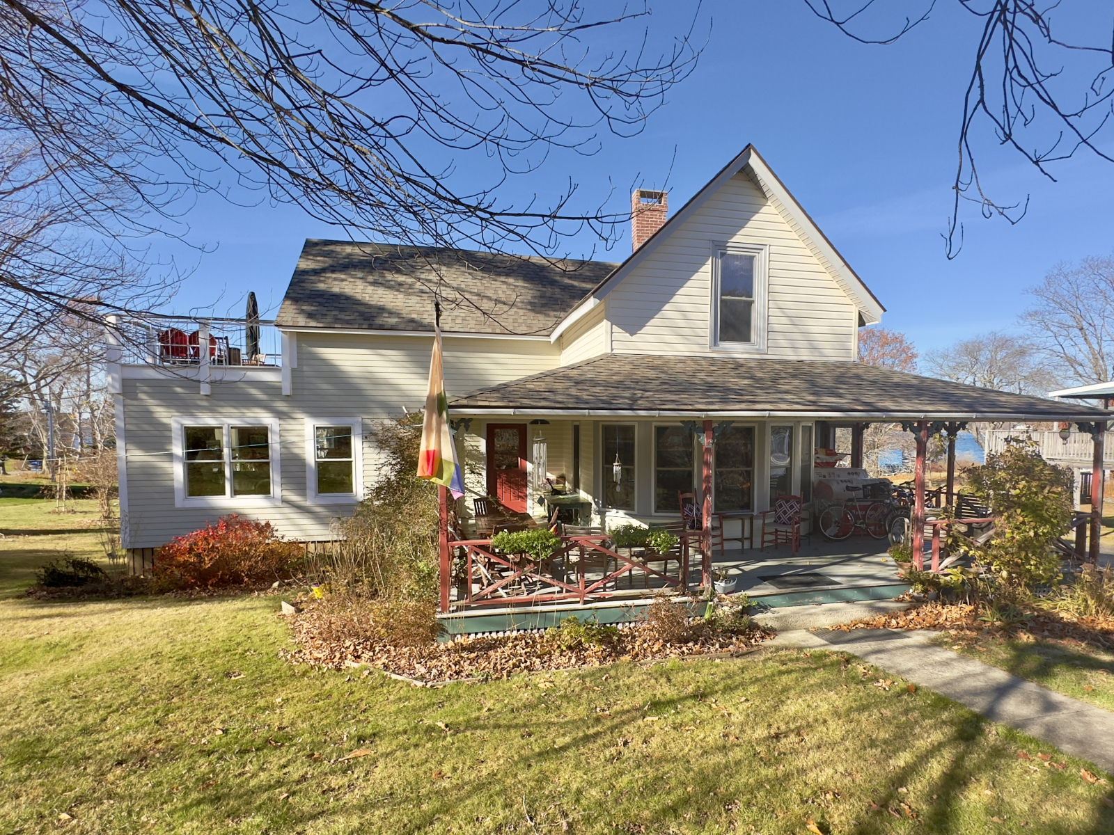 On the first floor is the sunny living room (natural light is important to one of us!) The kitchen is well equipped (we enjoy cooking). There are two full baths. We spend most of our time on the large front porch or upstairs deck in the warmer weather because we enjoy being outside whenever possible. The eat-in-kitchen and dining room are also on the first floor. We have two bedrooms upstairs, both with queen beds. The main bedroom has some limited waterviews in the summer and much better views once the leaves come down. There is a full bath with a tub on the second floor. The first floor bathroom has a walk in shower. In addition to the front porch, there is a deck on the back for those who enjoy basking in the sun.