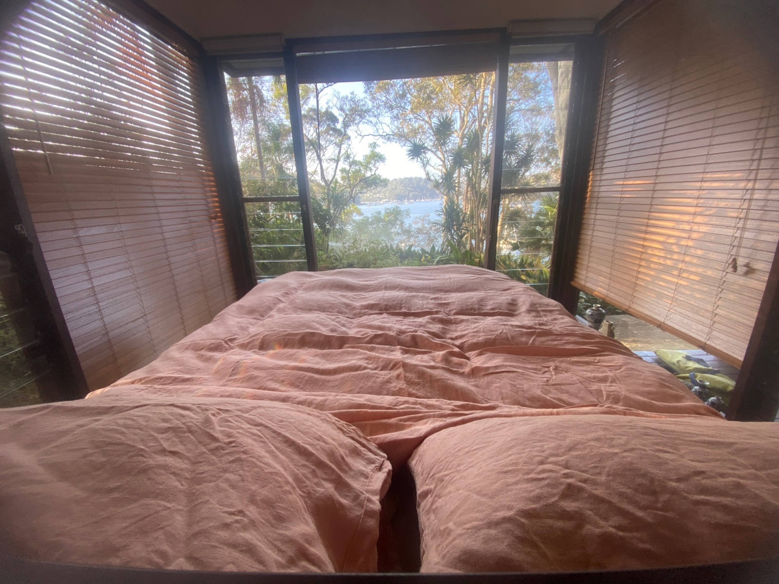 The Upstairs is the living space with kitchen, dining, lounge and wrap around balcony..all with a fantastic view over Pittwater. Downstairs are the 2 Bedrooms with a queen bed in each. 60 stairs to waterfront boathouse with lounge charis.