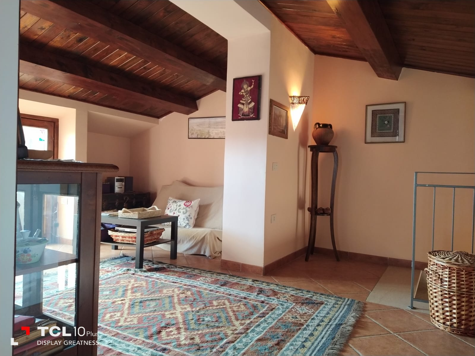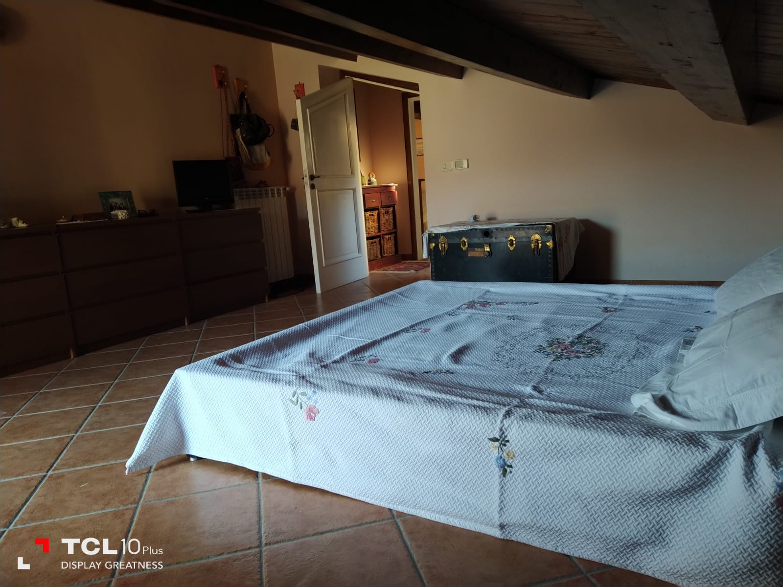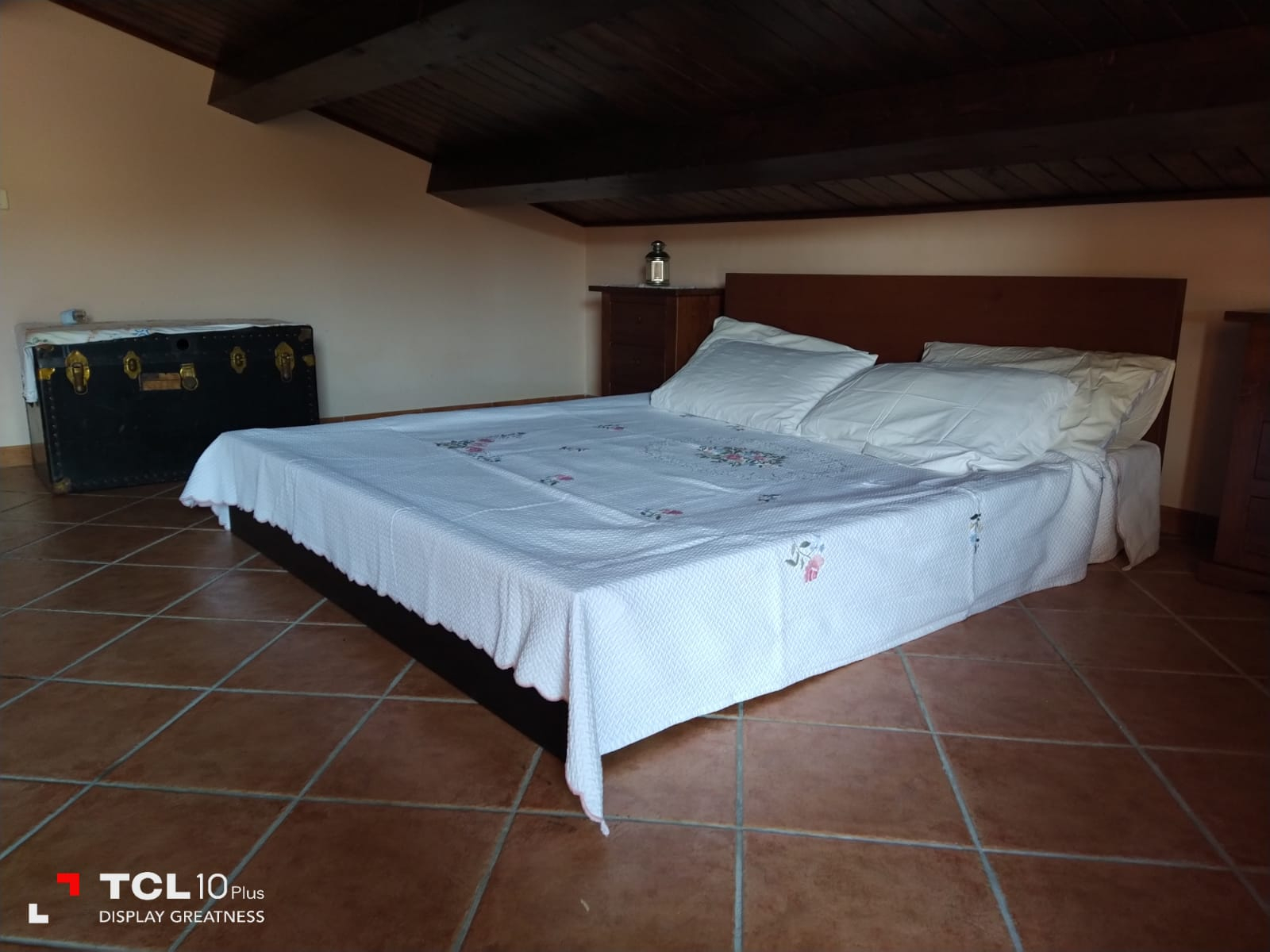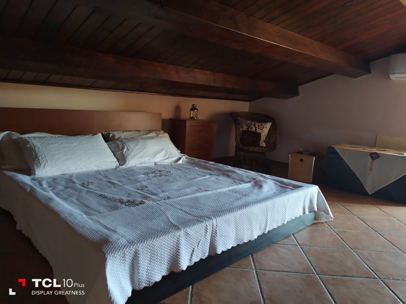 Thick wooden beam ceilings and terracotta tiles cover the 150 square foot attic. There is large air conditioned bedroom is furnished with dressers, a queen size bed, bathroom with tub, small living room, equipped kitchen, refrigerator and a large bookshelf with travel guides and historical novels based on the southern Italian region. There are two small terraces off the living room and a larger terrace off the bedroom and kitchen overlooking the large backyard and sweeping mountain views.