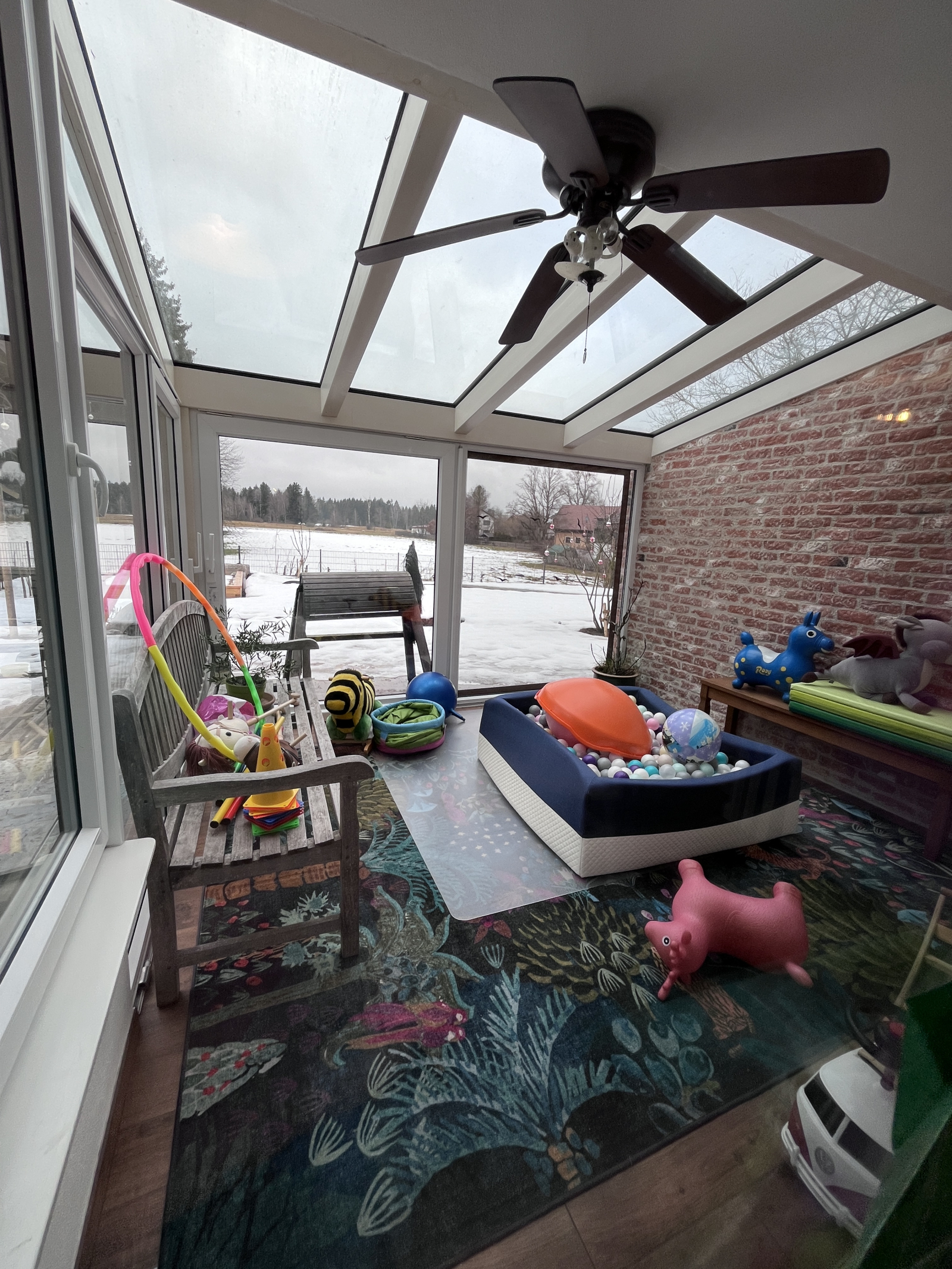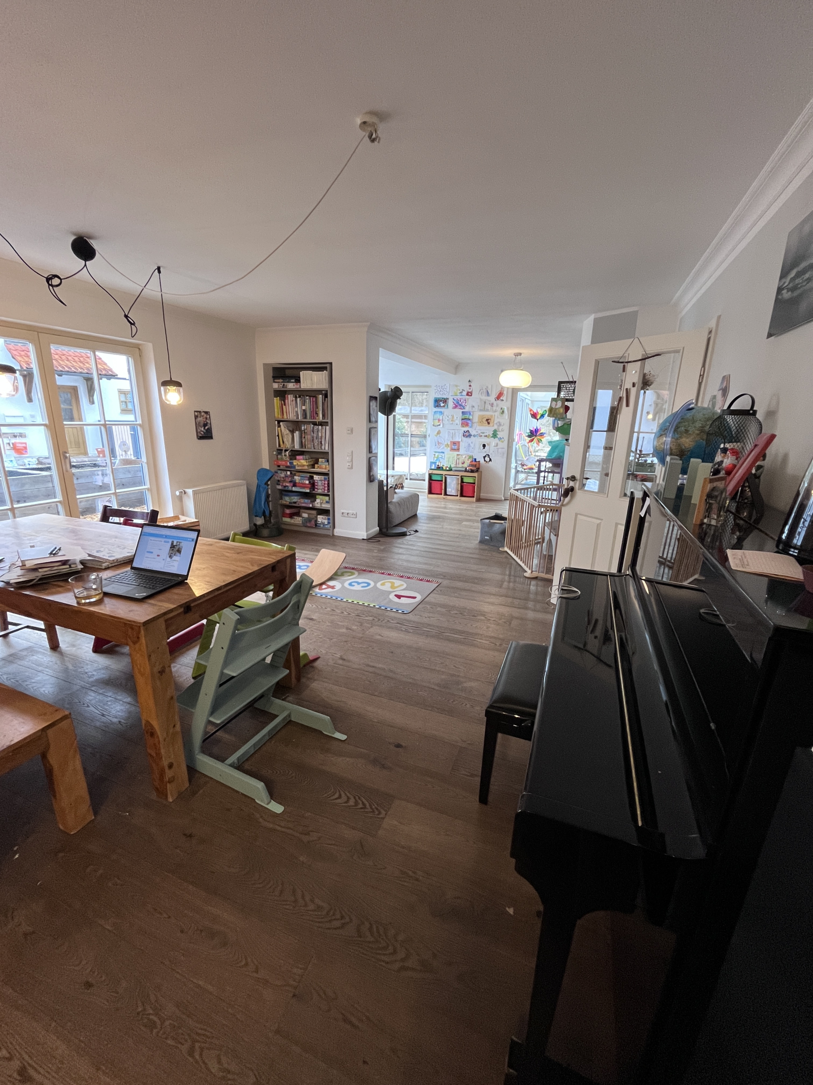 The house has a large combined kitchen and living room with a fireplace (child safe), piano, winter garden and access to the garden on the ground floor.