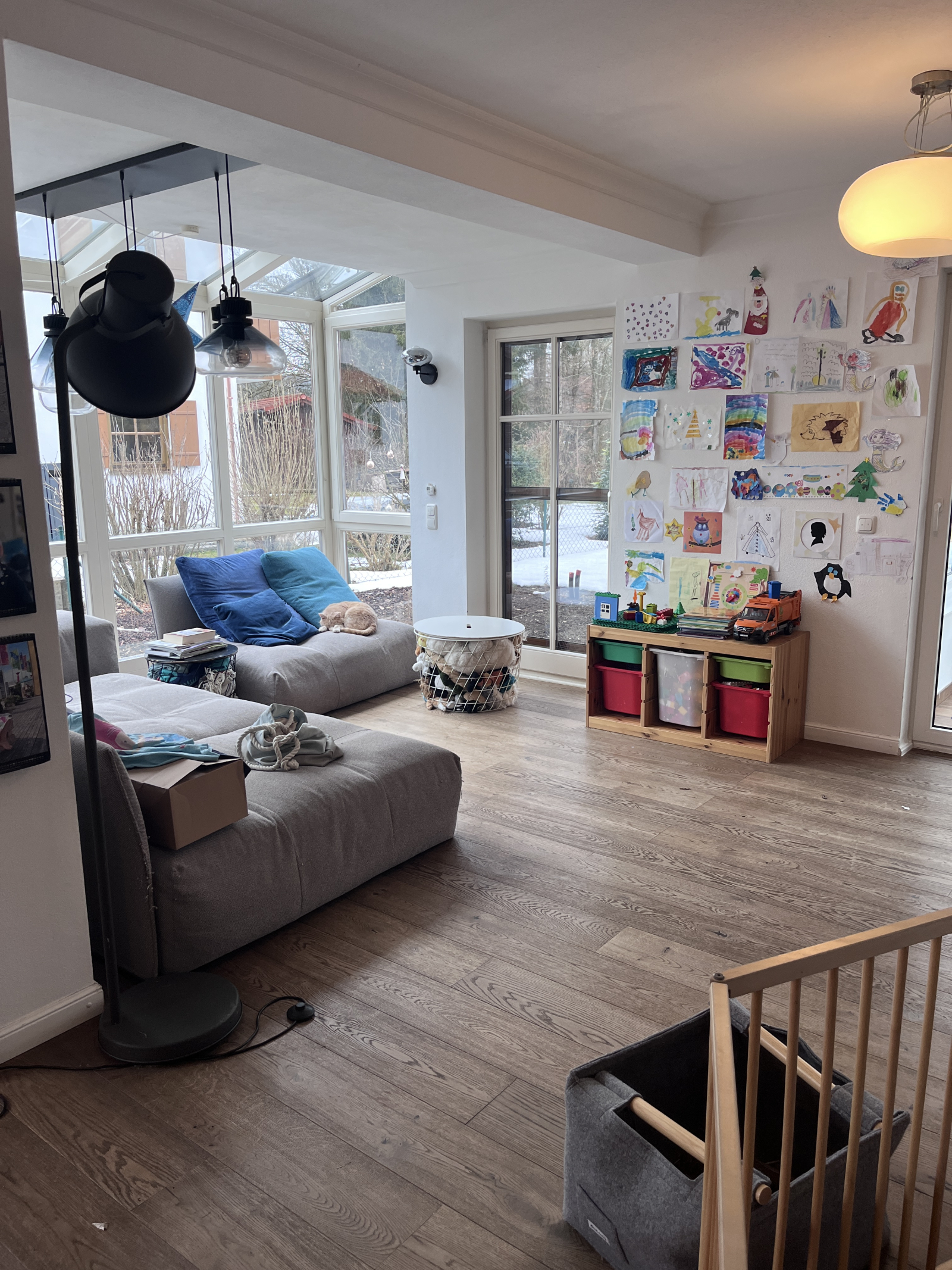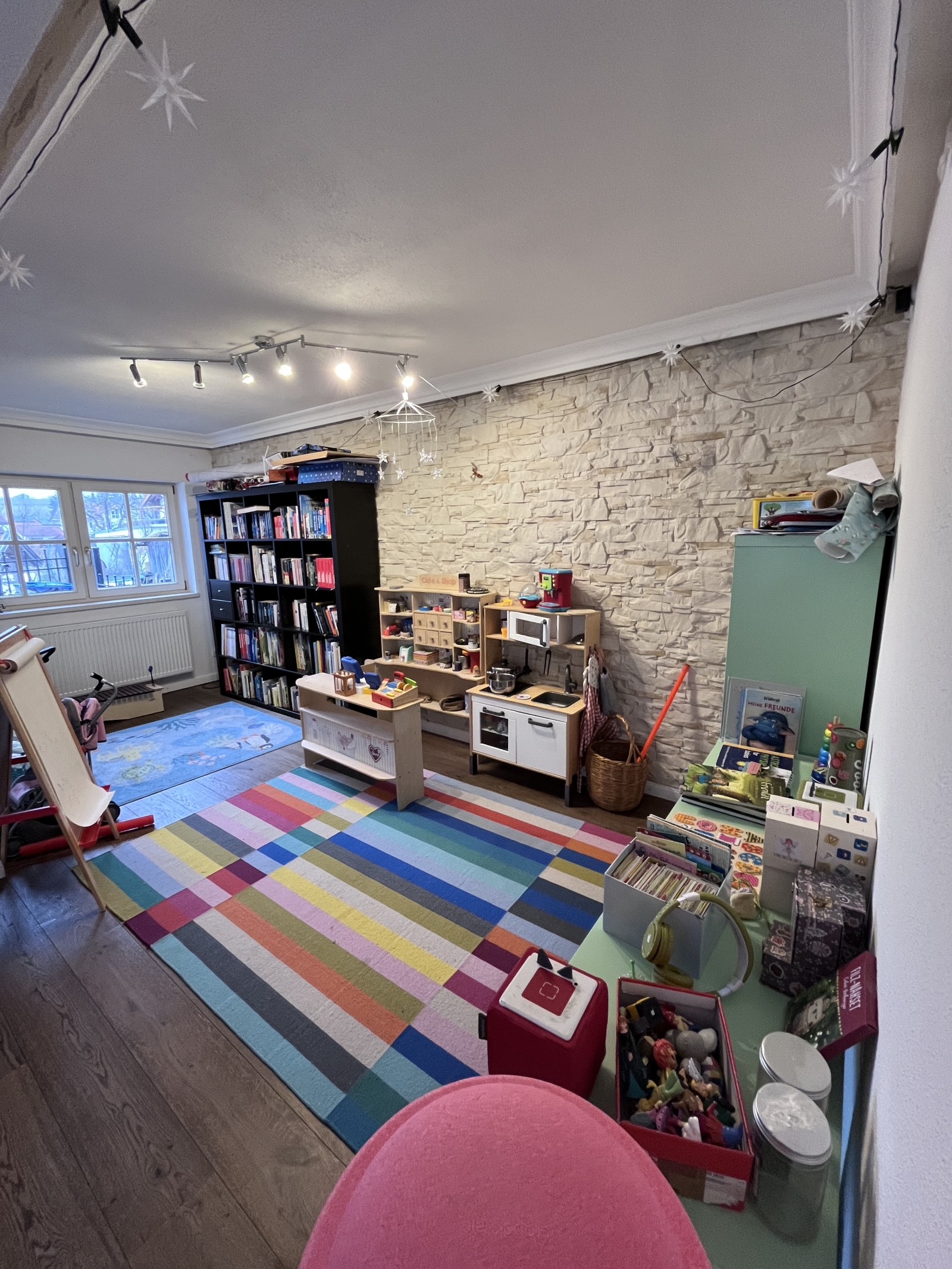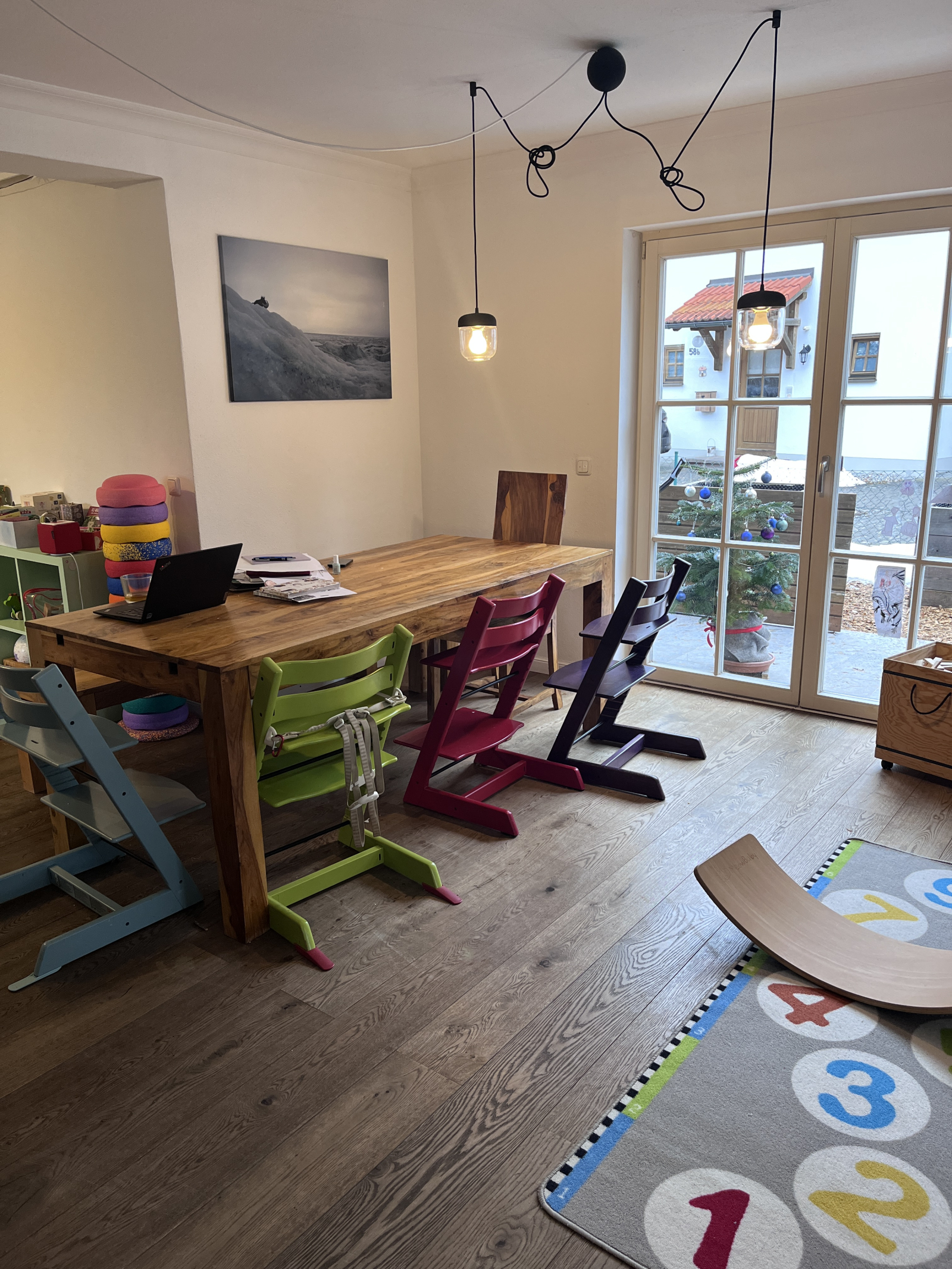 We live in a family home an hour outside of Munich in the countryside in Oberhausen, close to some lakes and an hour away from Garmisch-Partenkirchen and the Zugspitze. We have children age 3 to 7.