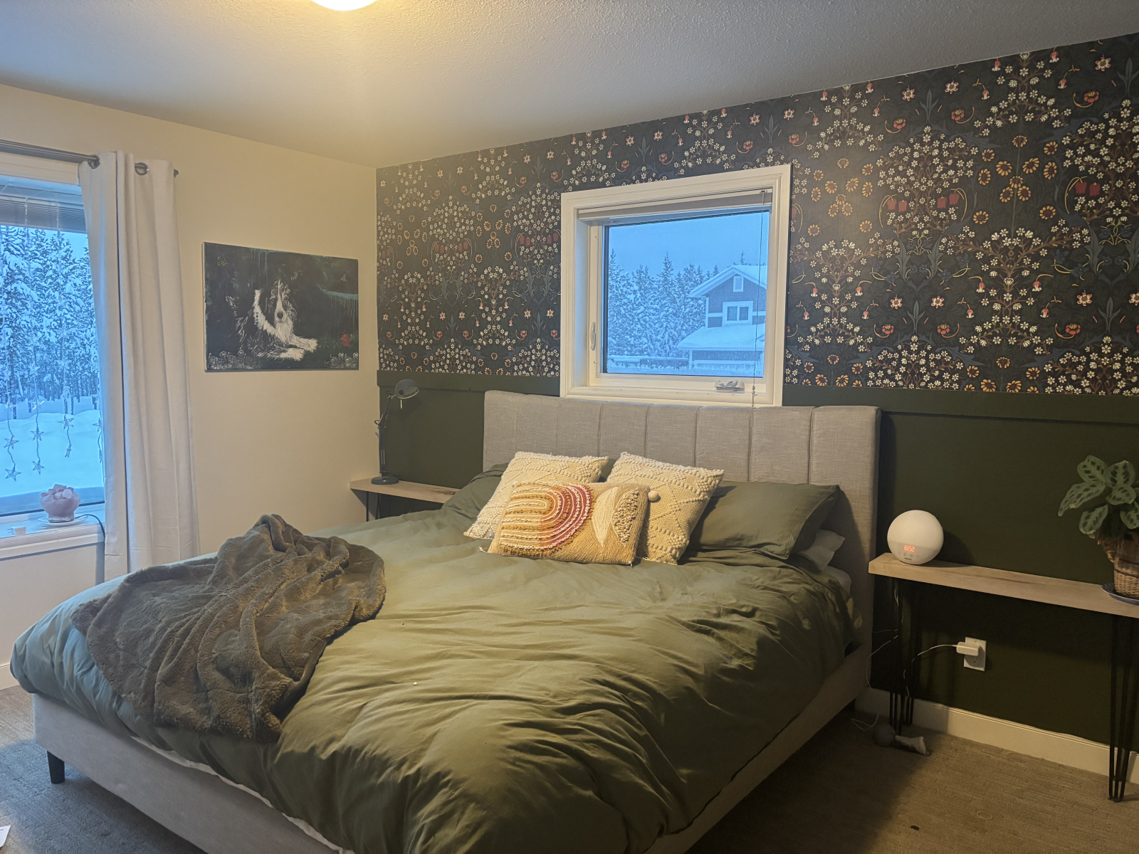Green master bedroom: King bed, organic cotton bed sheets and duvet cover, 2 windows with blackout curtains.