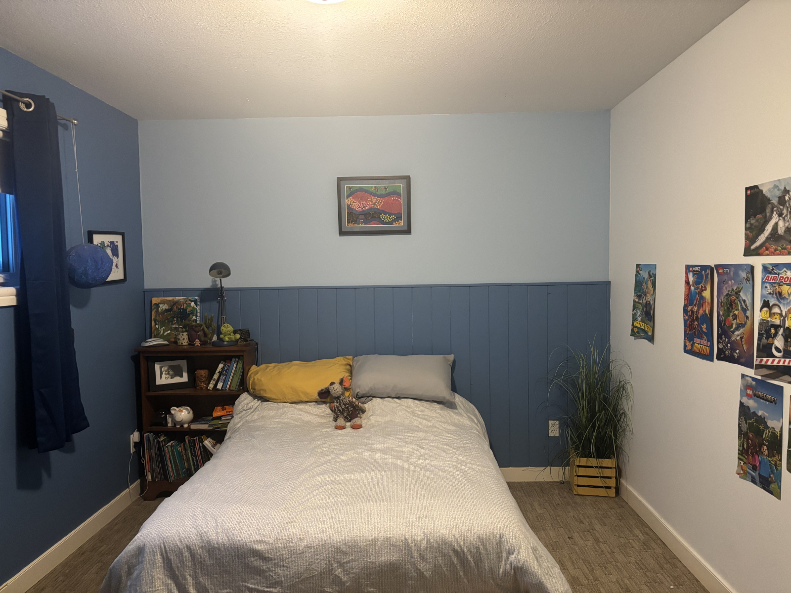Blue Kids room - double bed, c100% cotton sheets and duvet cover. Small desk and books. The room has one large window and a closet. Black out blind and curtains installed.