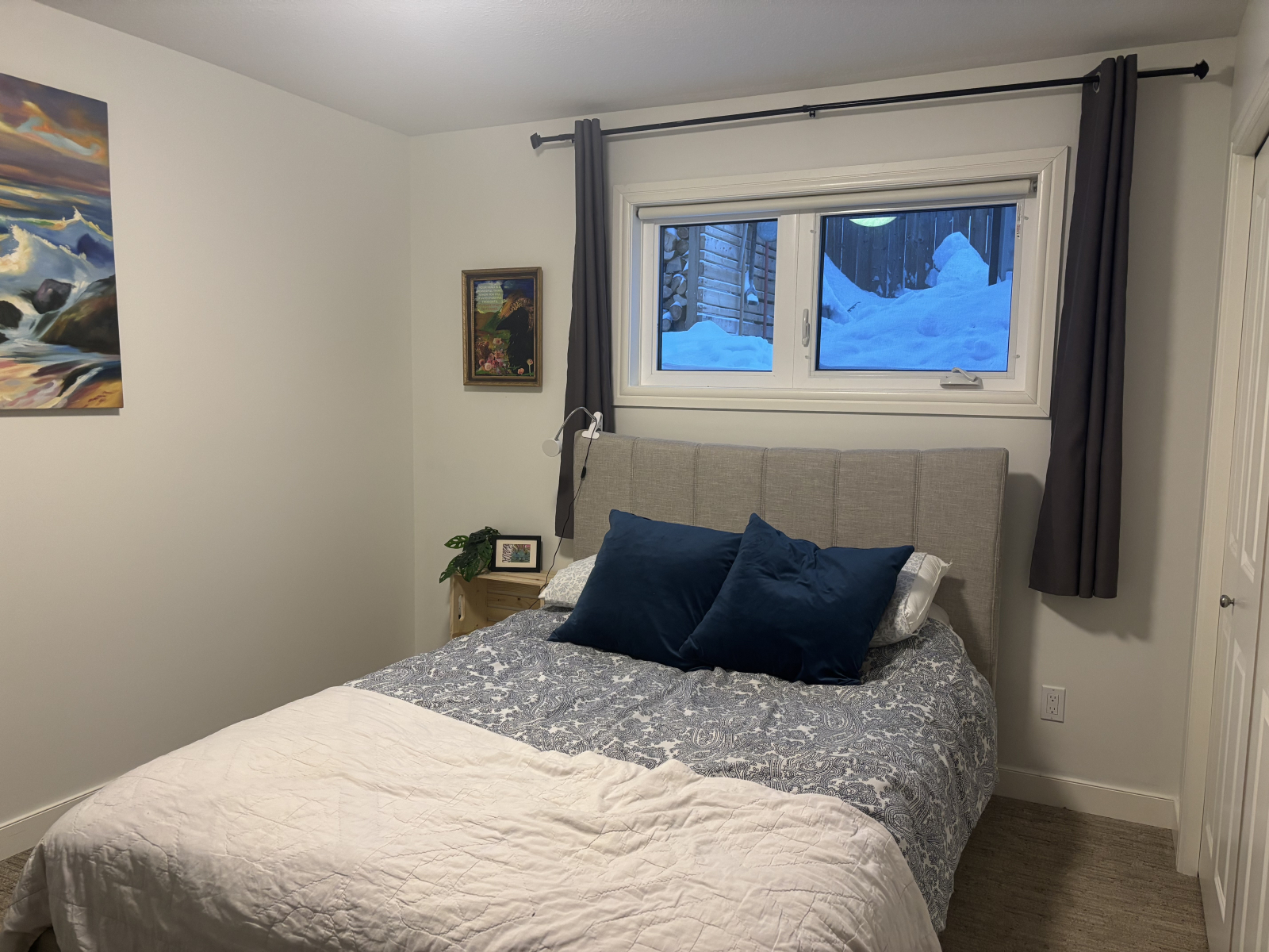 White wall room: Queen Bed with 100% cotton bedding. Small dresser and closet for storage. Window with blackout curtains.