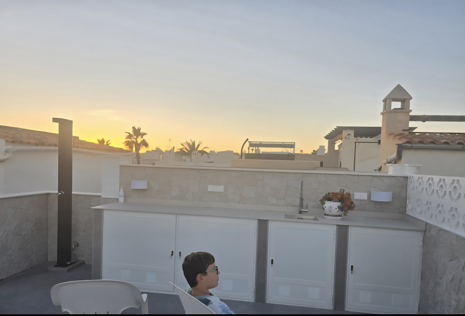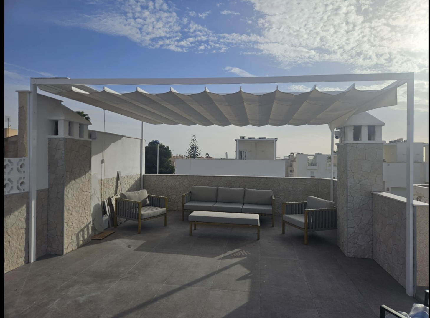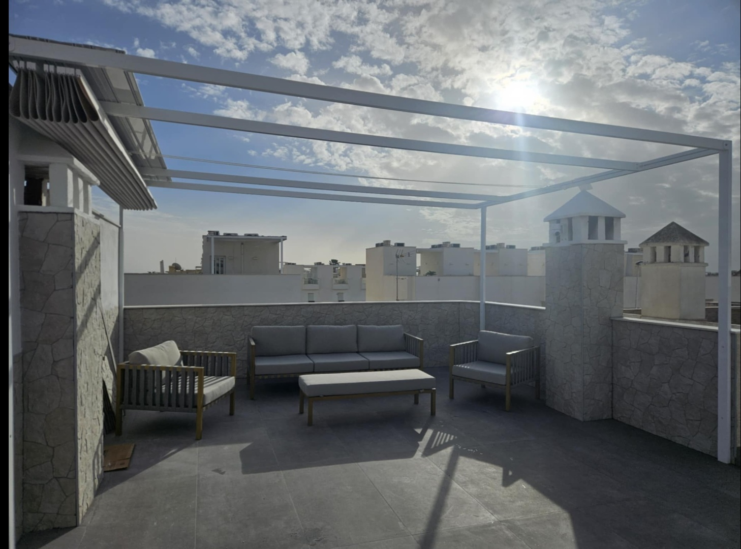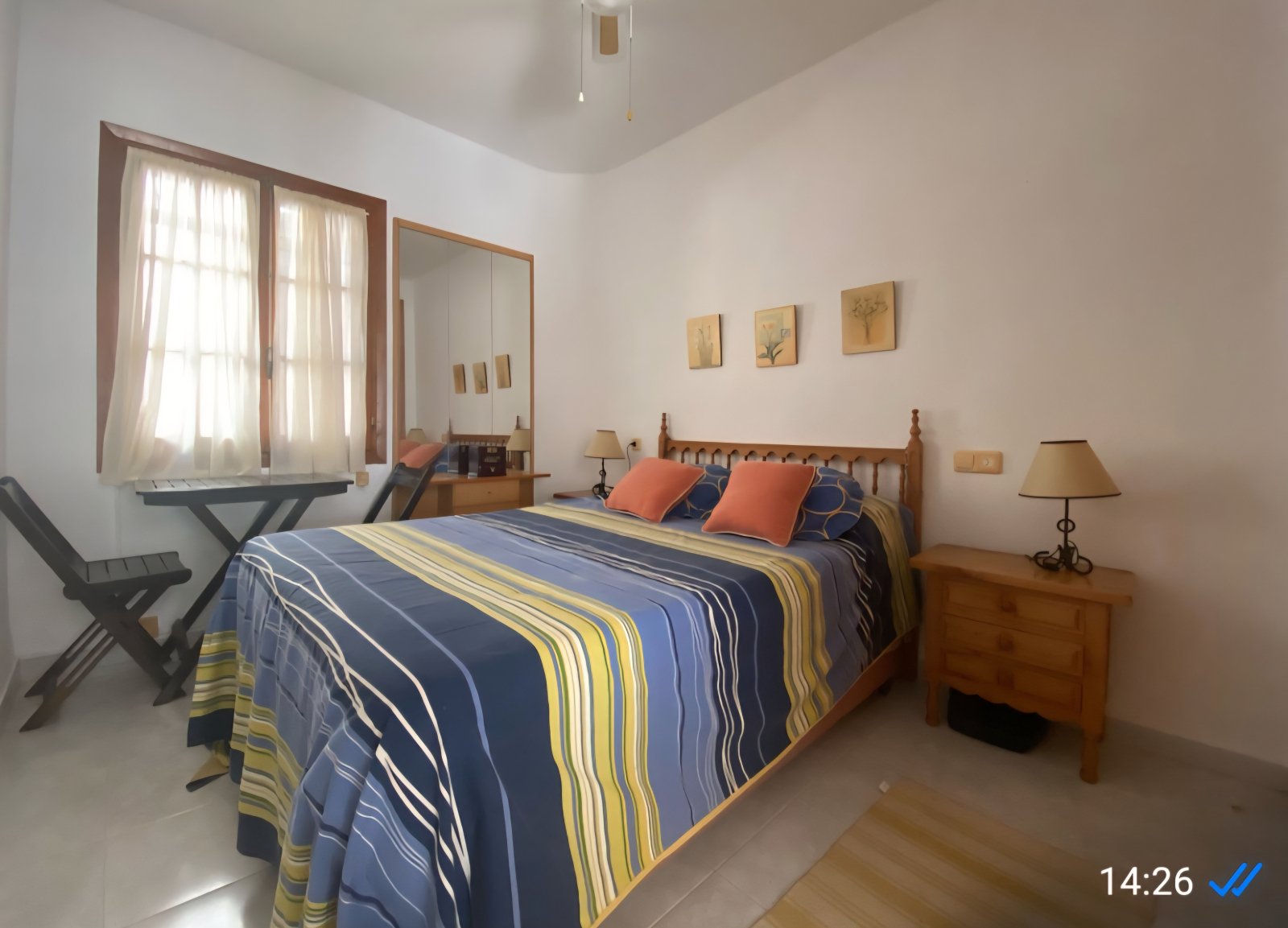 2 bedrooms and a sofa bed in the livingroom.The place has a nice solarium with an open kitchen and a nice comfortable sofa on the top.There is a communal pool .