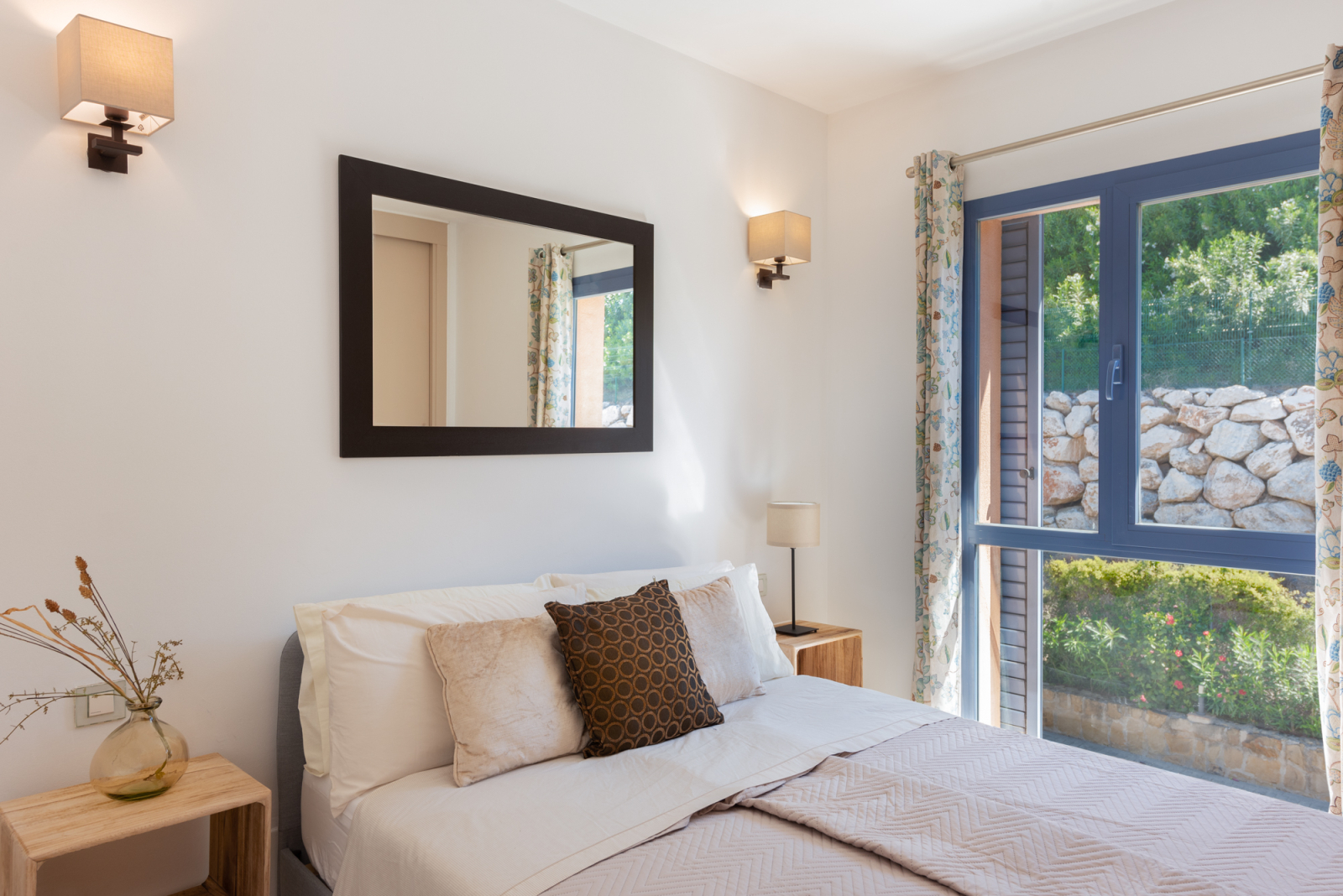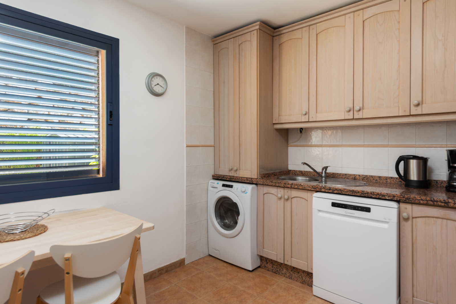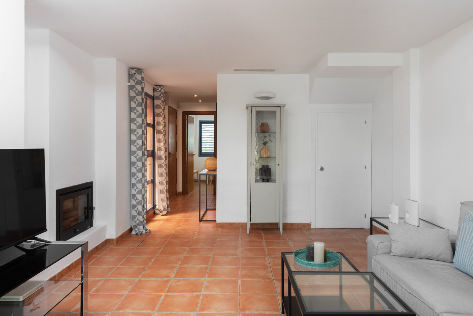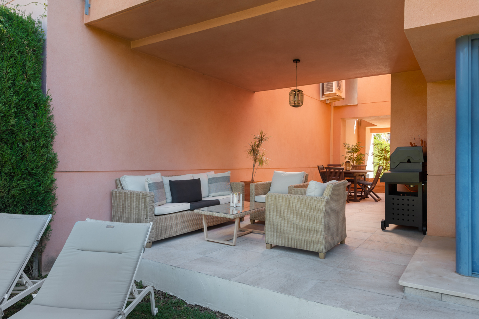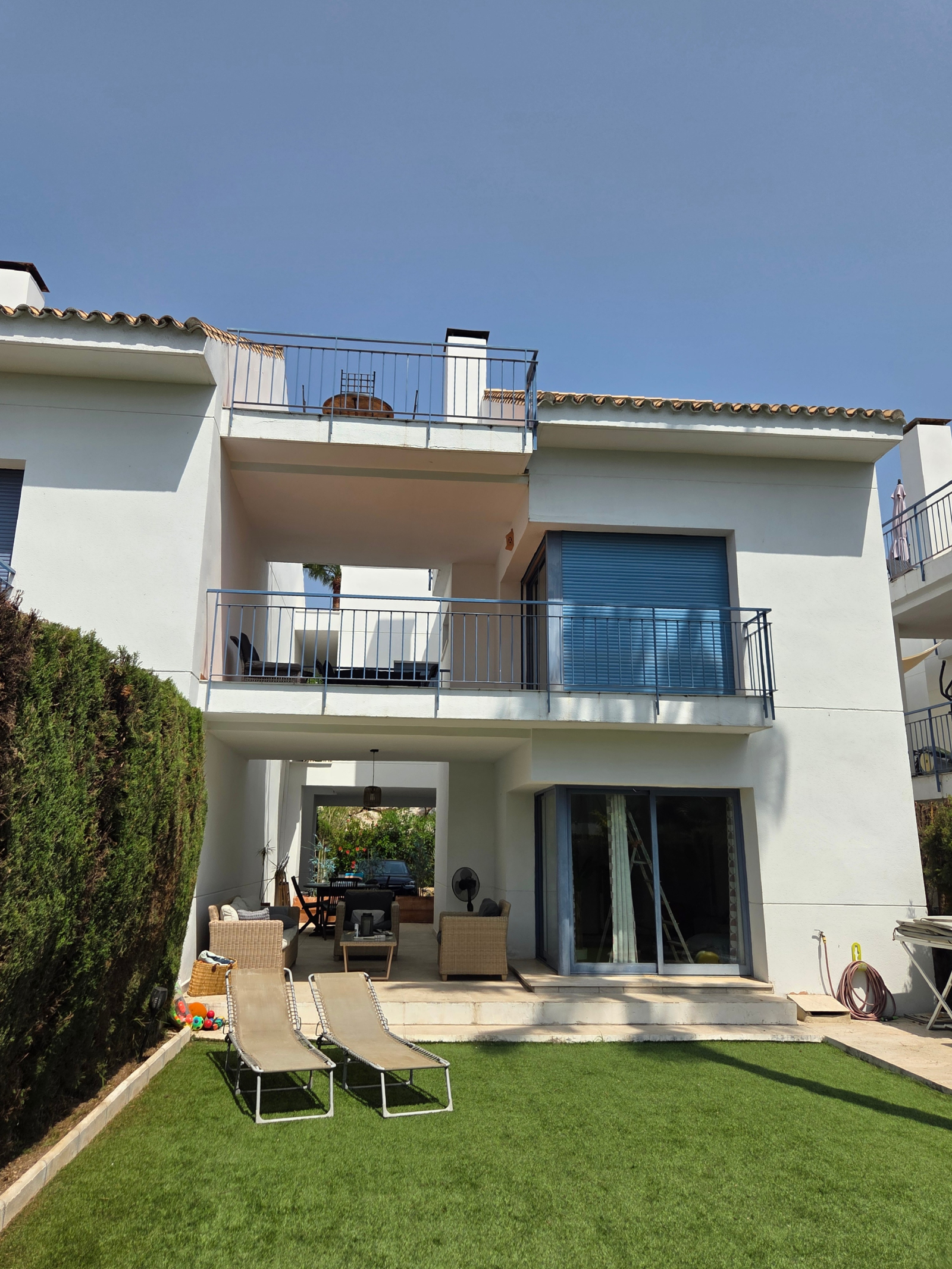 The ground level features a fully equipped kitchen, a bright living room, and a guest WC. Patio doors open to an outdoor dining space and private south-facing garden, overlooking beautifully landscaped communal gardens, a refreshing swimming pool, and a BBQ area – ideal for enjoying the Mediterranean lifestyle.