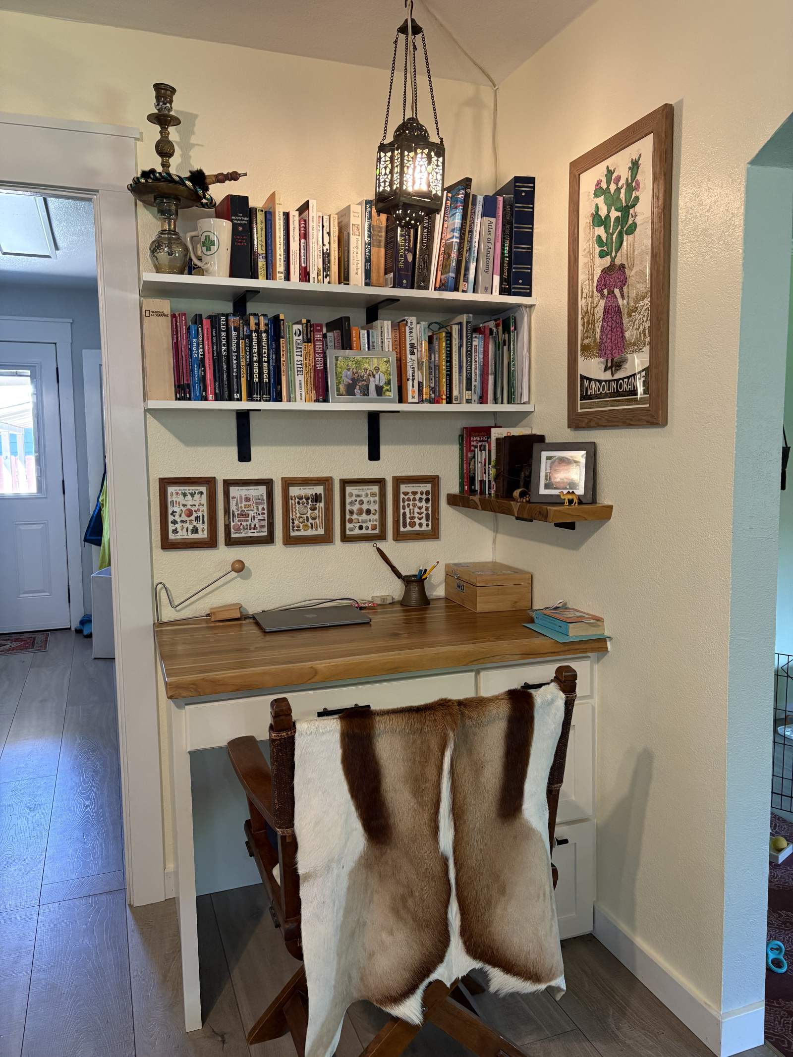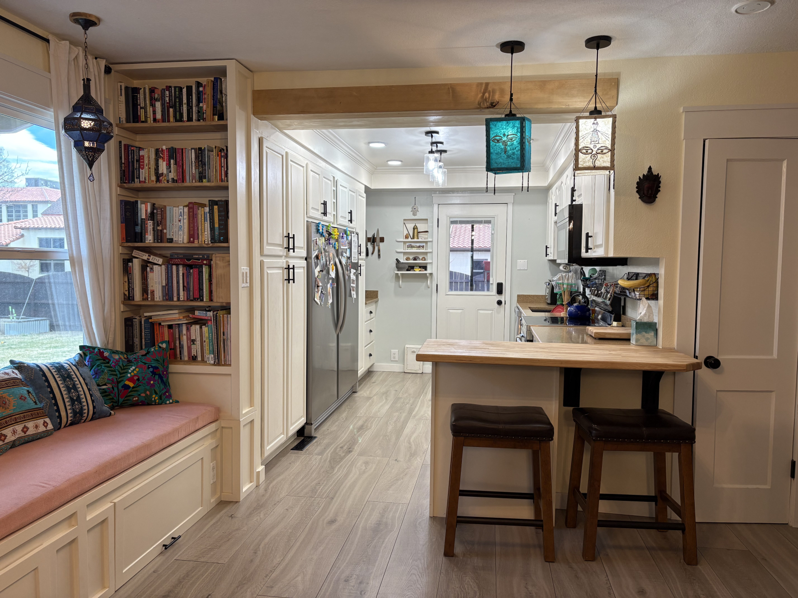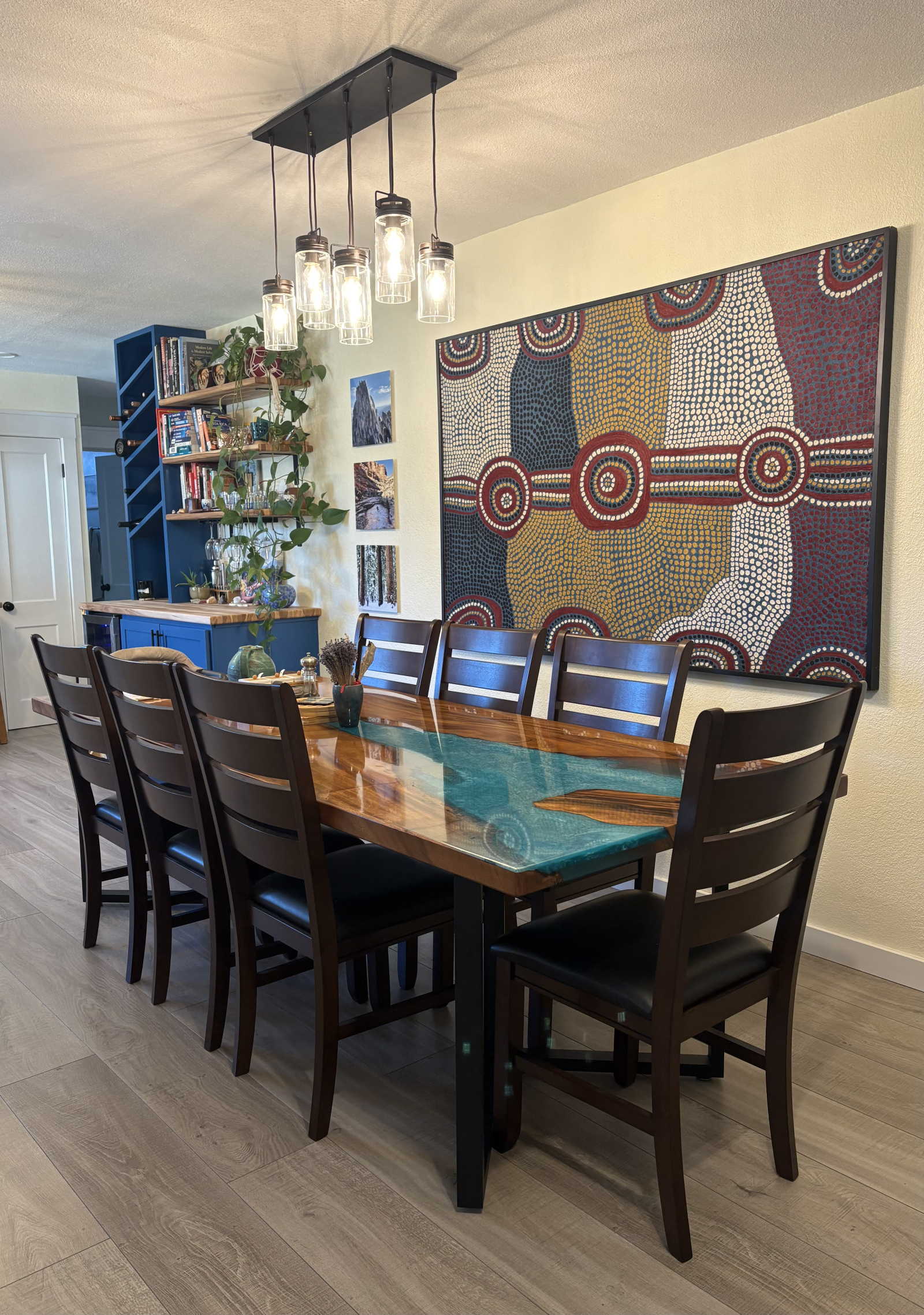 We love the huge live-edge dining room that can fit 8 comfortably - and more if needed!