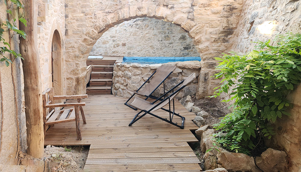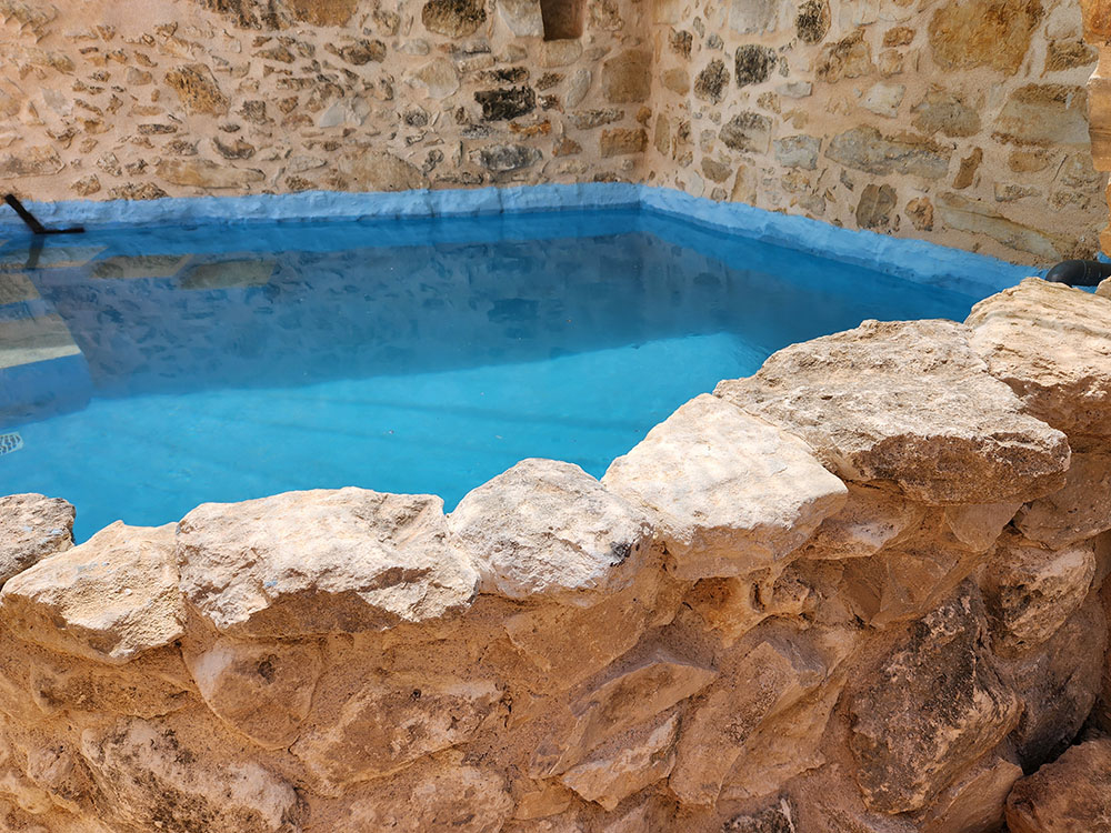 Un amplio cuarto de baño construido sobre una antigua prensa de vino, un pasillo entre habitaciones, escaleras al primer piso