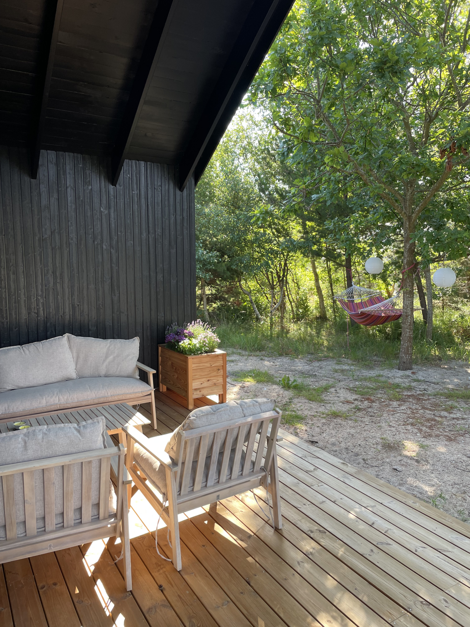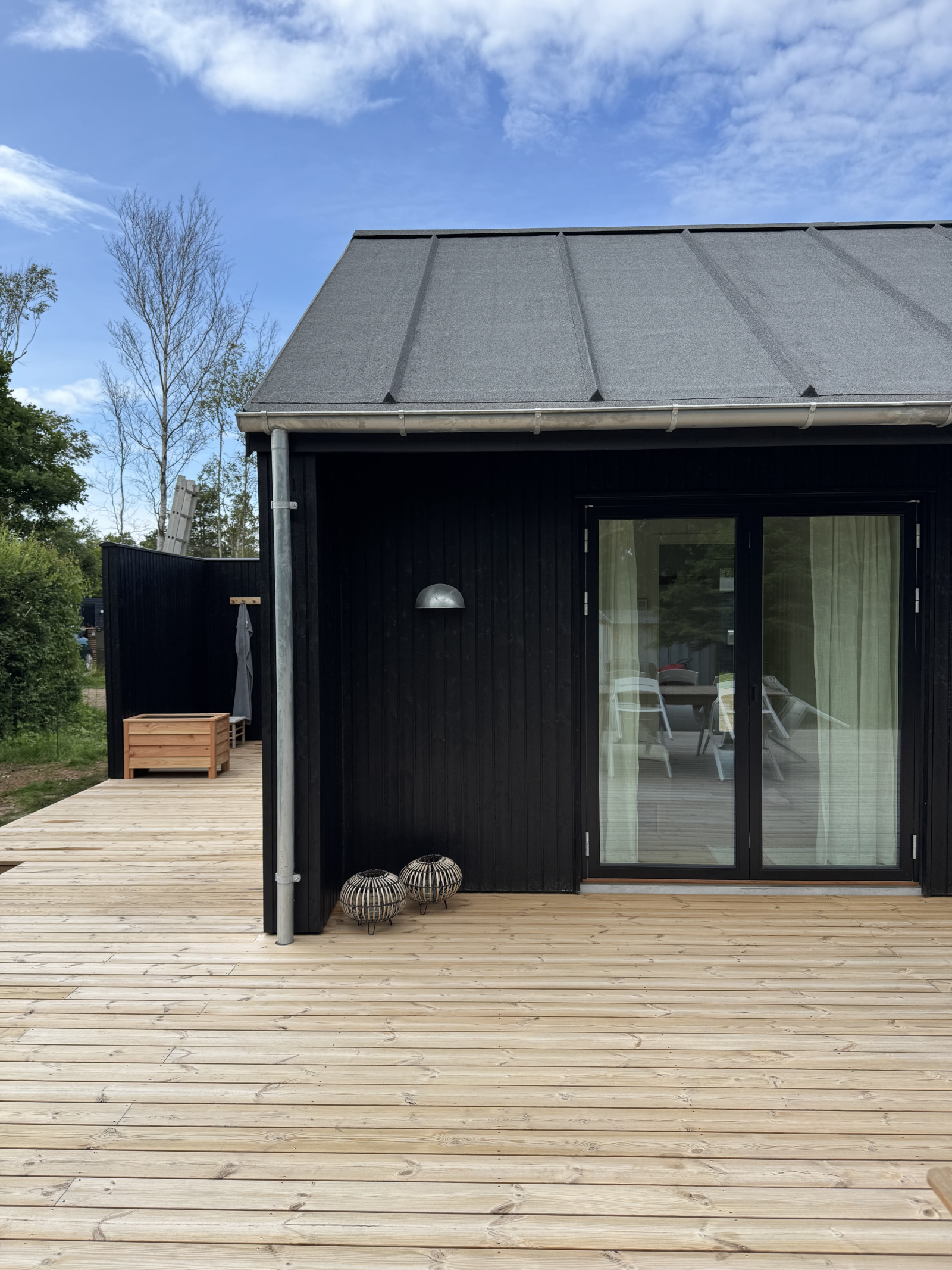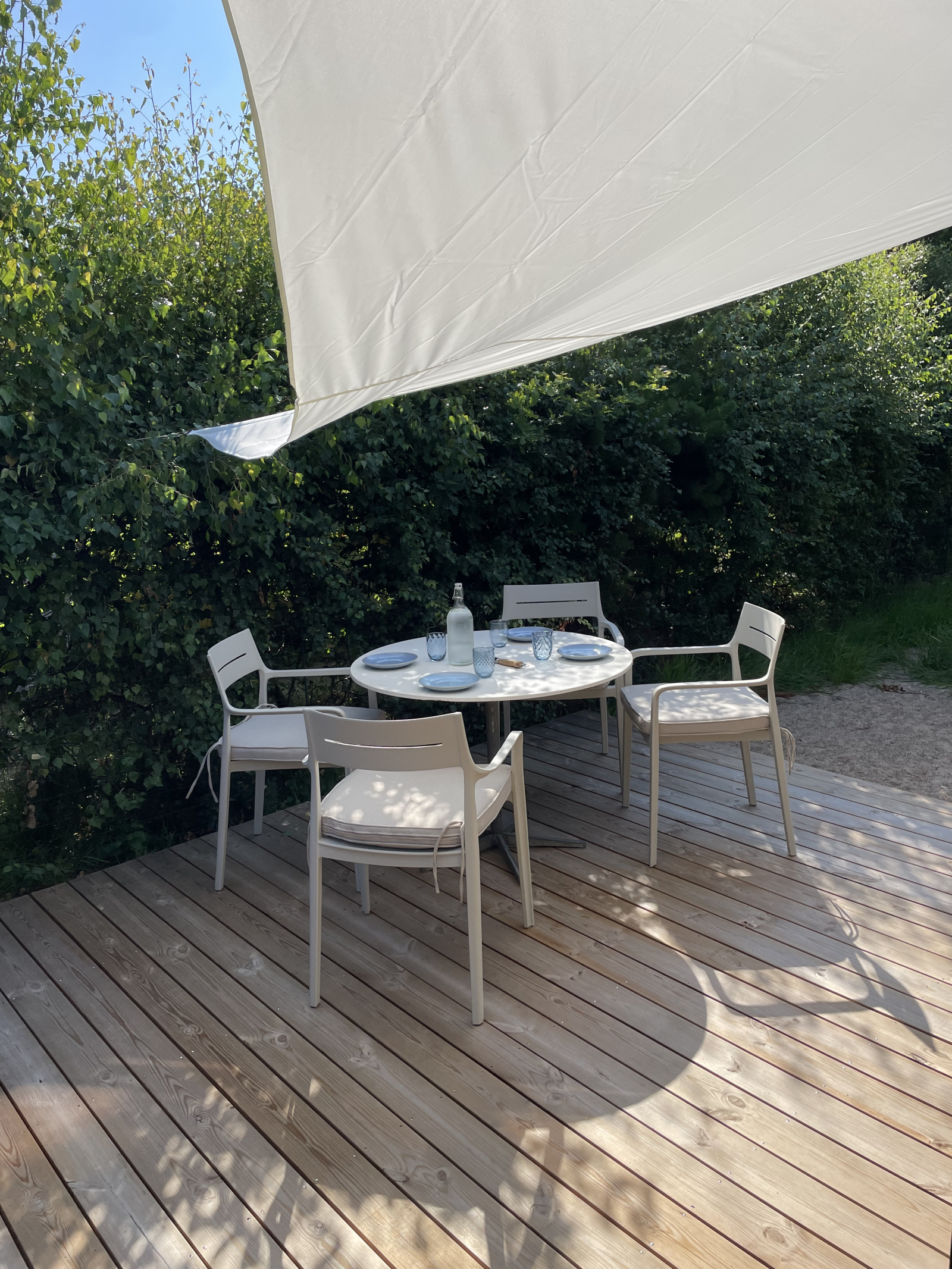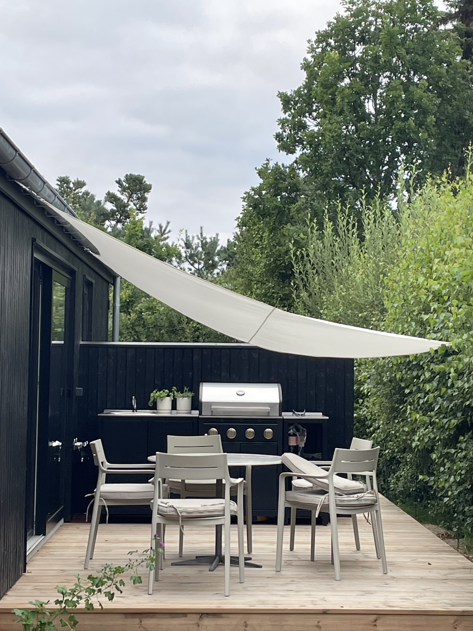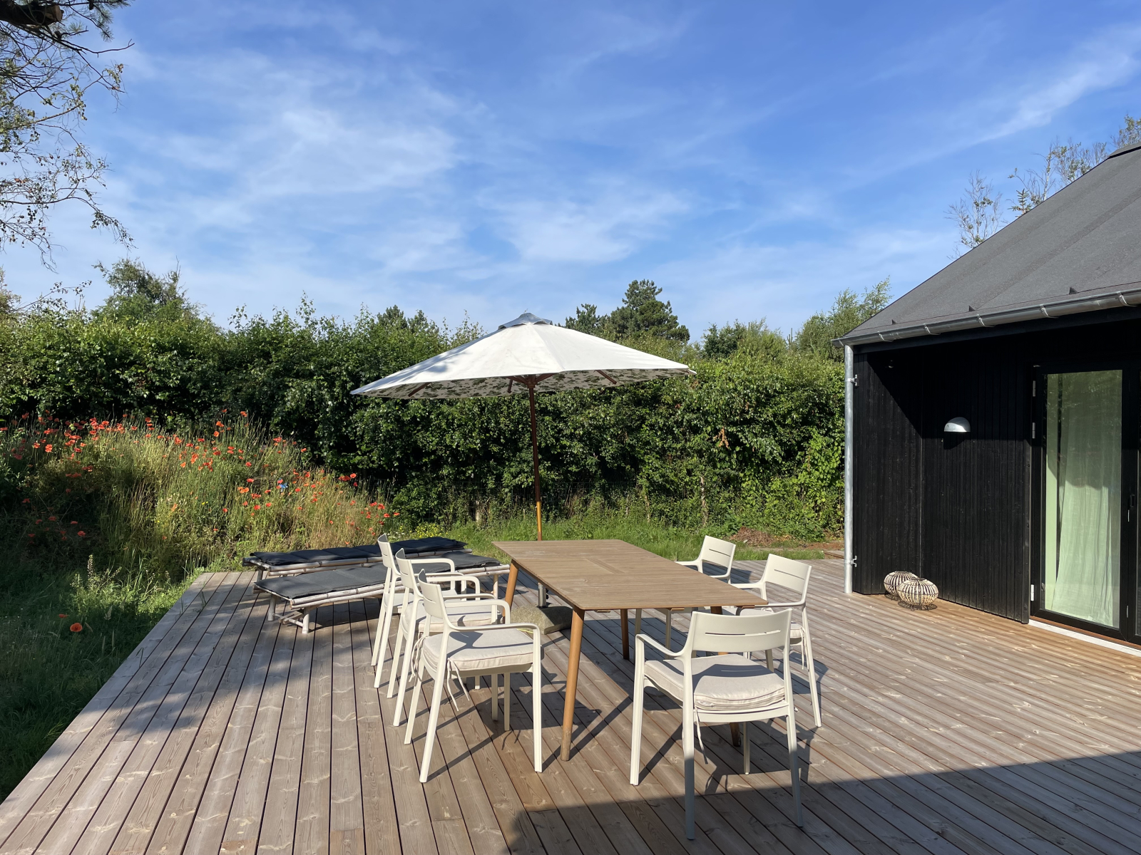 La casa desde el lado del jardín, con la sala de estar que tiene el acceso a la terraza cubierta y la zona de comedor al aire libre.
