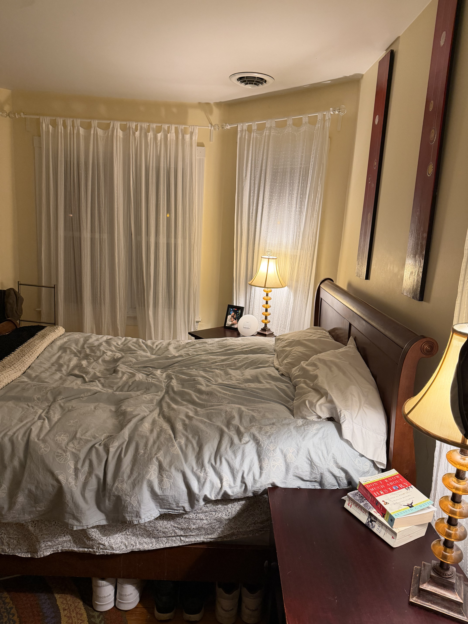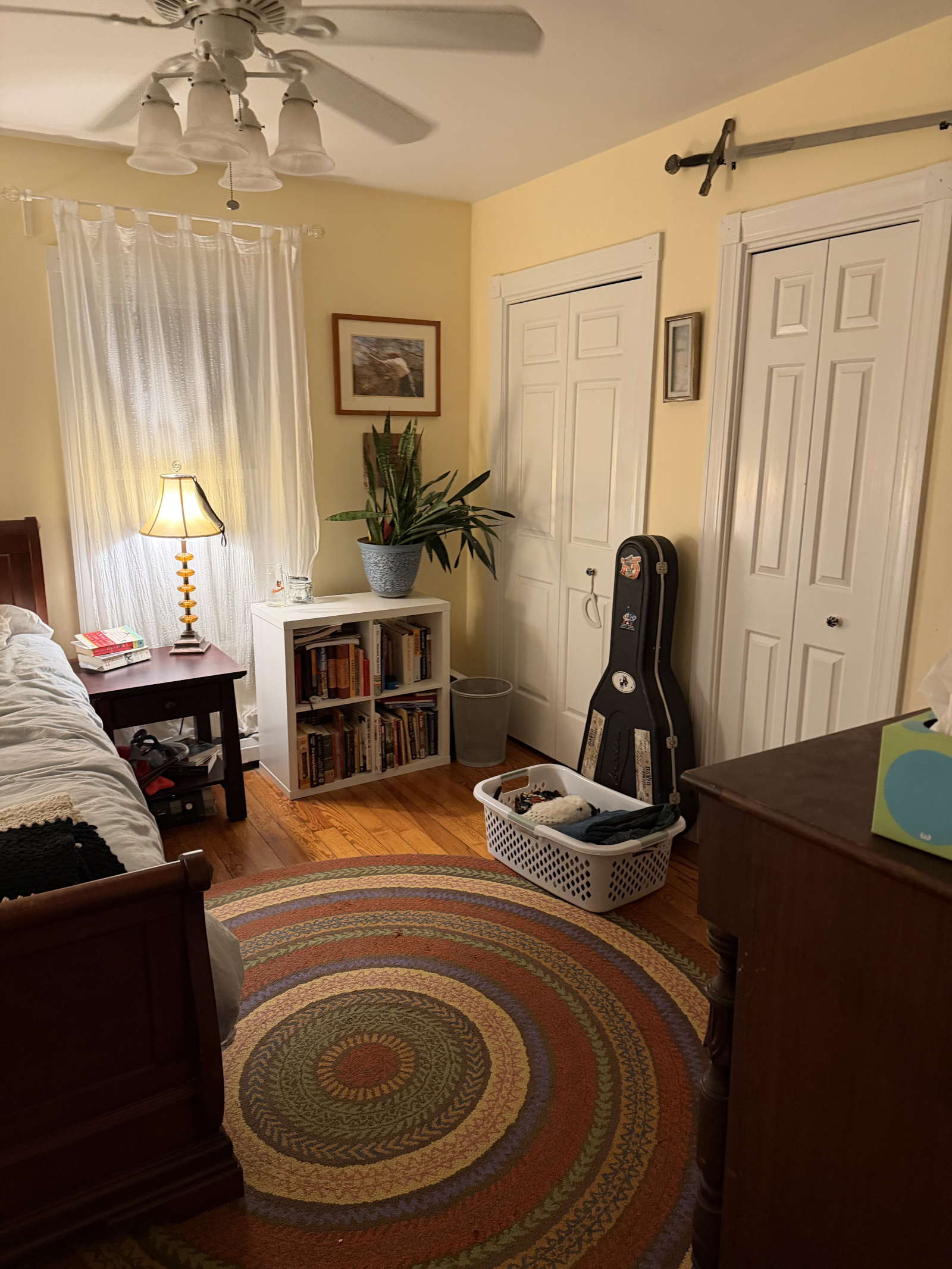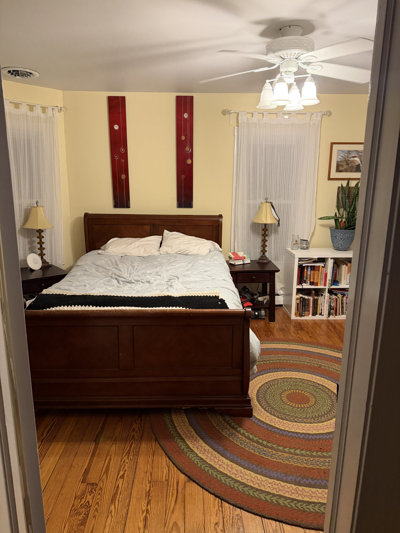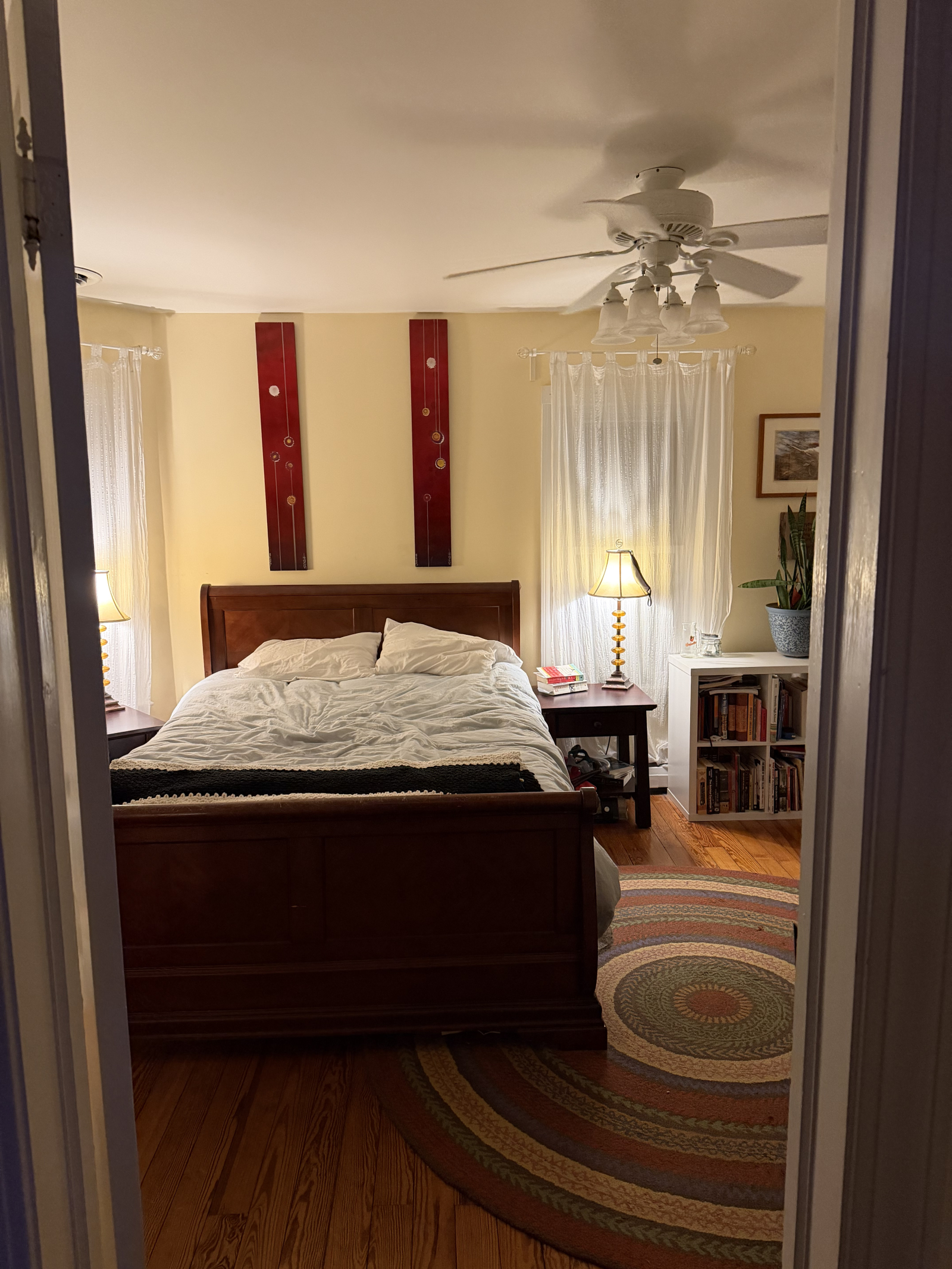 El dormitorio principal está en la parte delantera de la casa, con una ventana miradora y mucha luz. Vivimos en una calle muy tranquila (el tren pasa a unos 200 metros unas doce veces al día, pero uno se acostumbra muy rápido y apenas lo oímos ya).