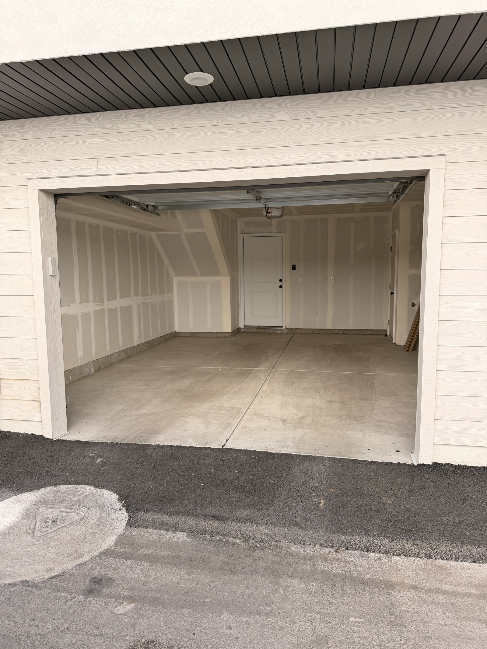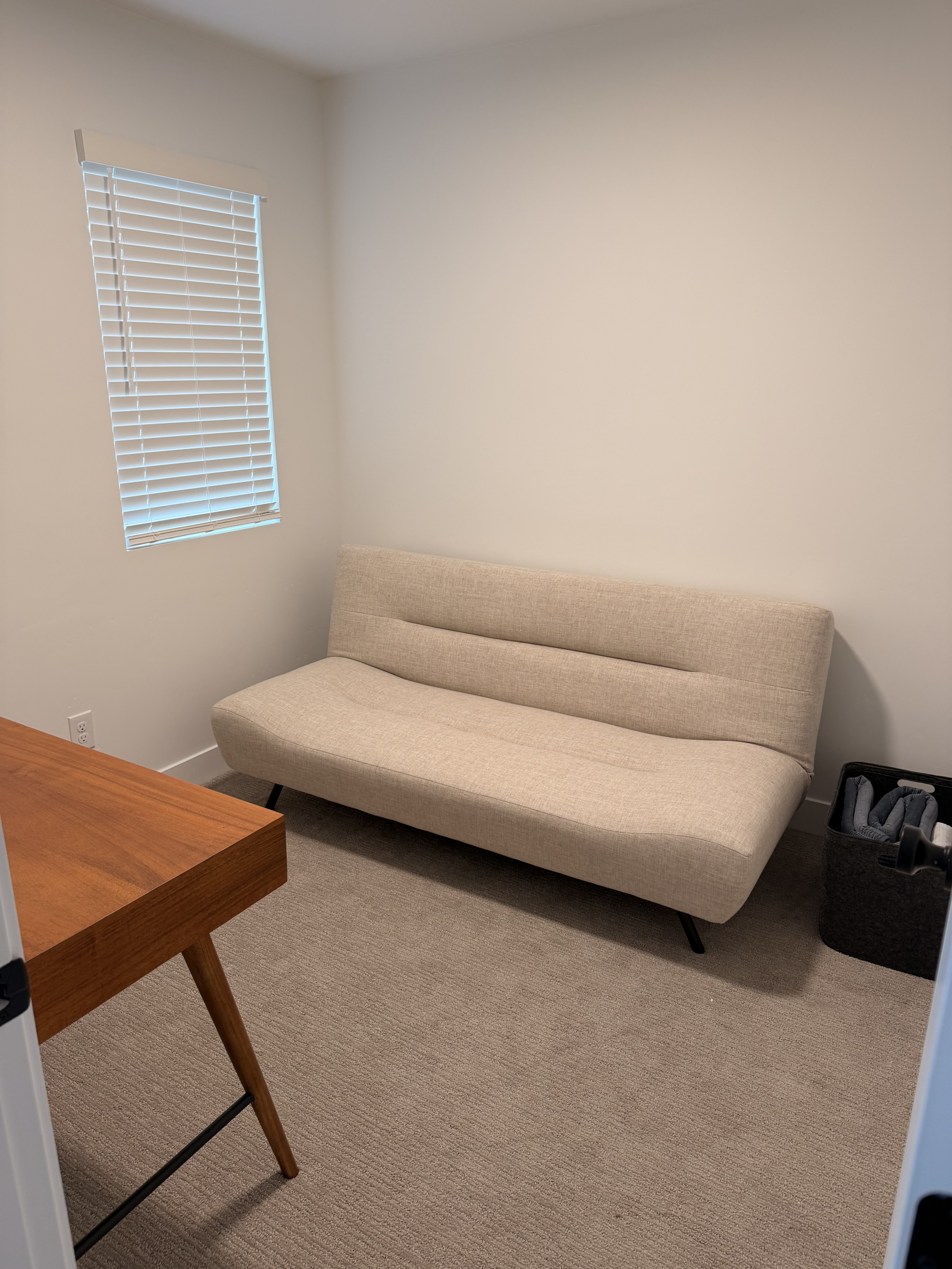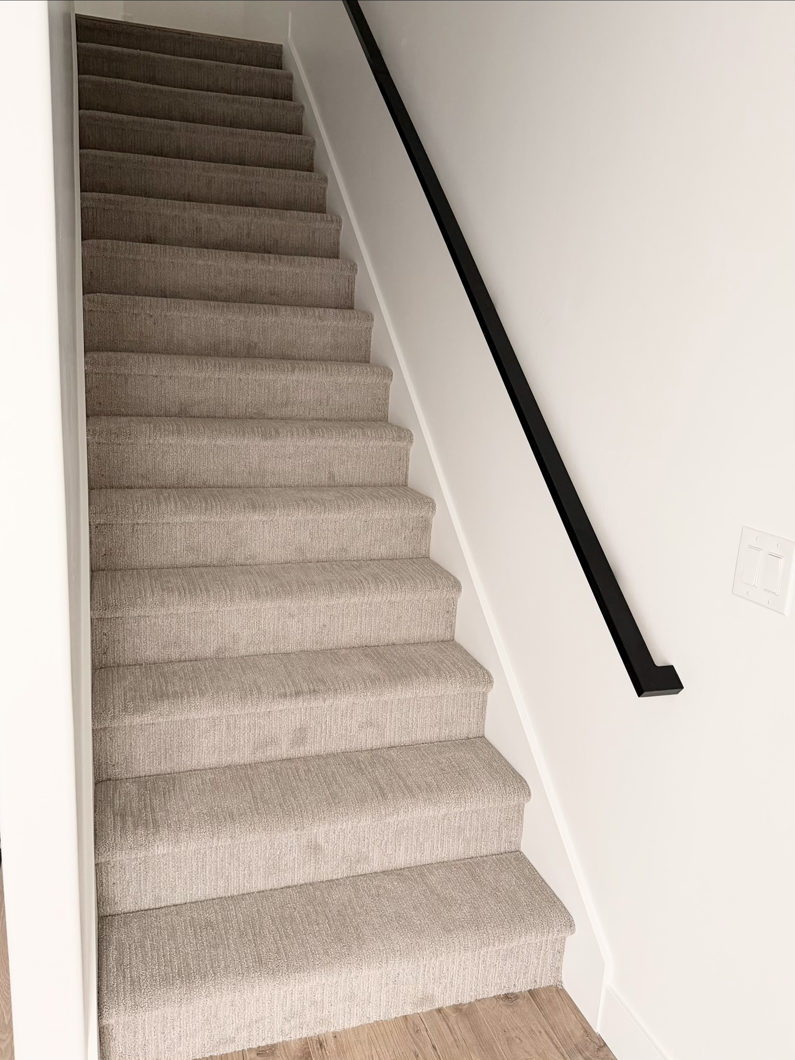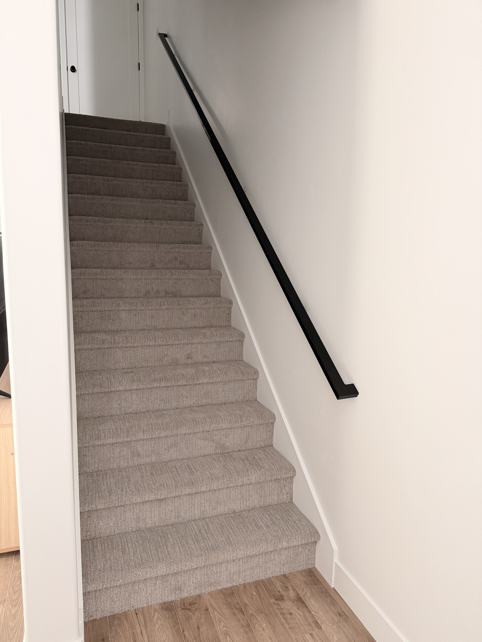 2 escaleras. En la planta baja está el garaje y una oficina/cama futón. La planta intermedia es la cocina y el espacio de estar. La planta superior tiene dos dormitorios y una lavandería