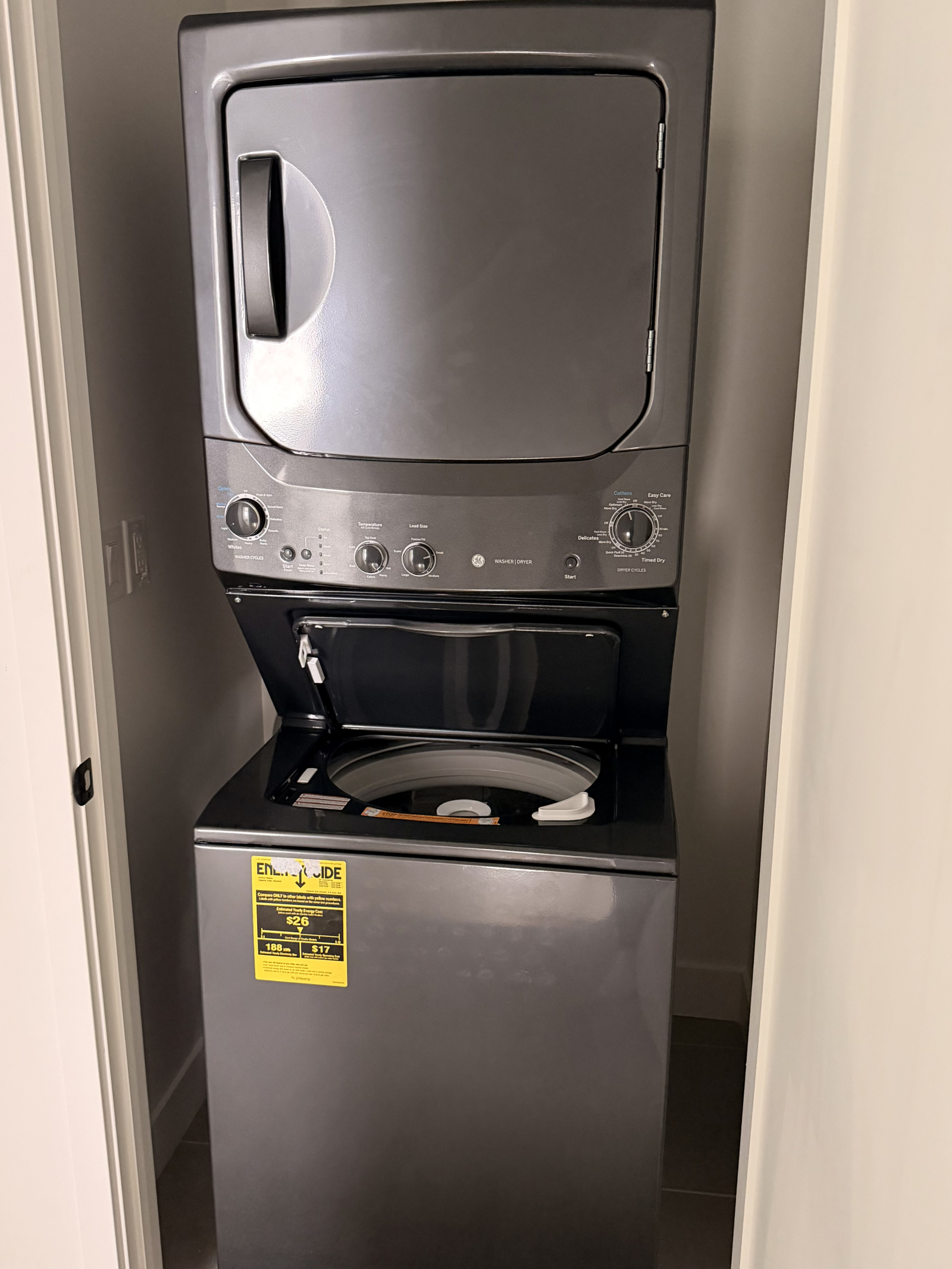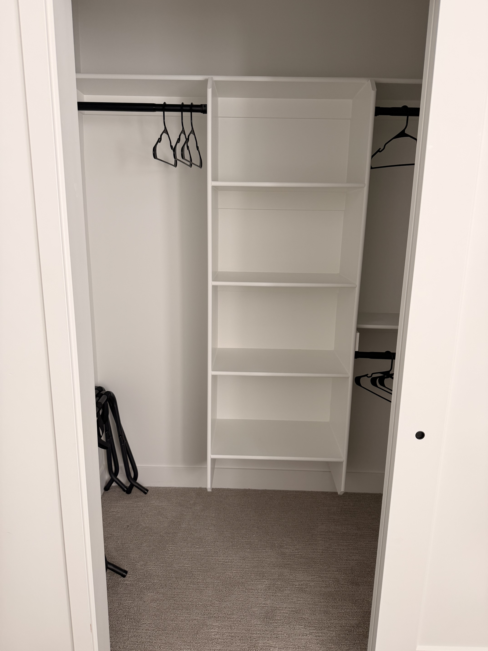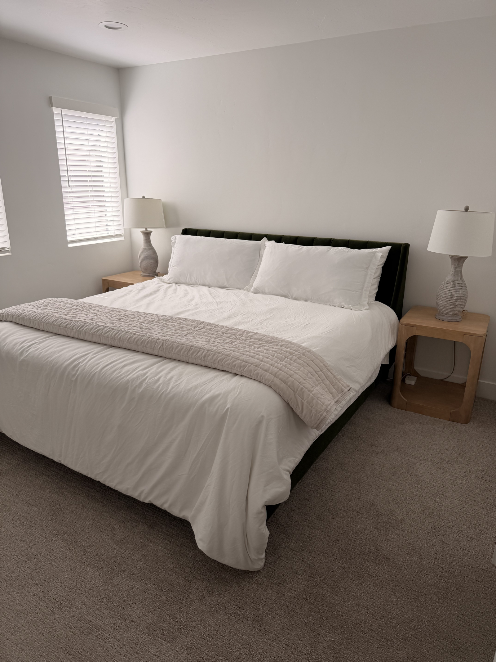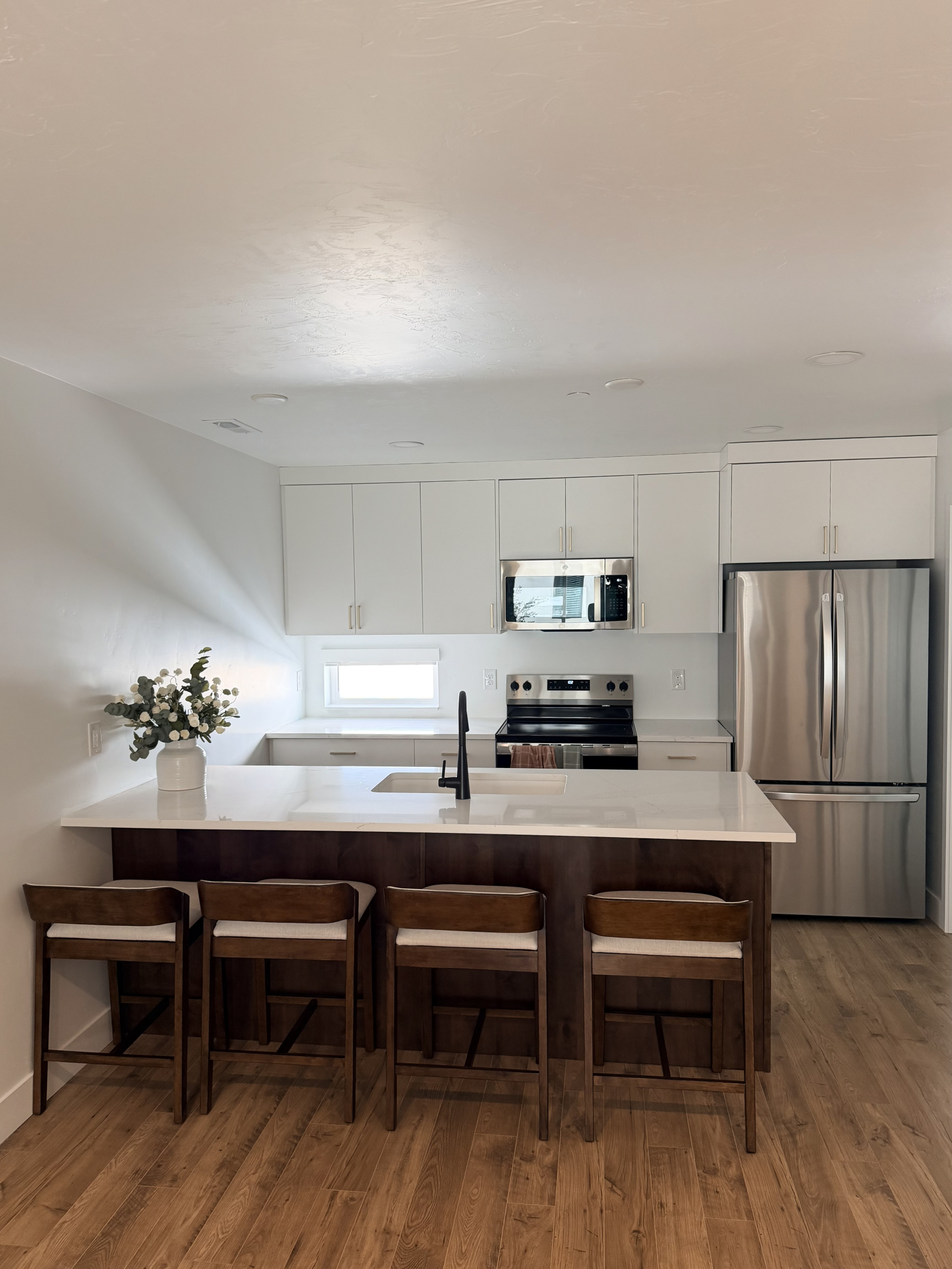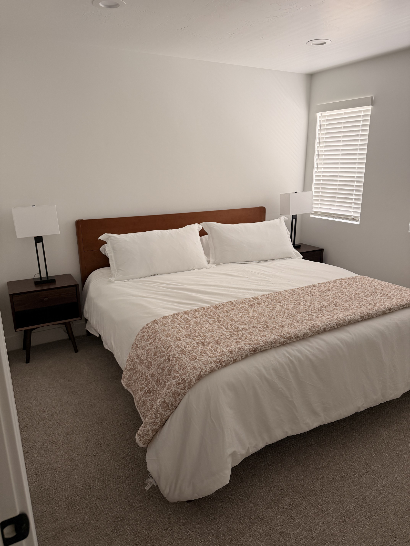 2 escaleras. En la planta baja está el garaje y una oficina/cama futón. La planta intermedia es la cocina y el espacio de estar. La planta superior tiene dos dormitorios y una lavandería