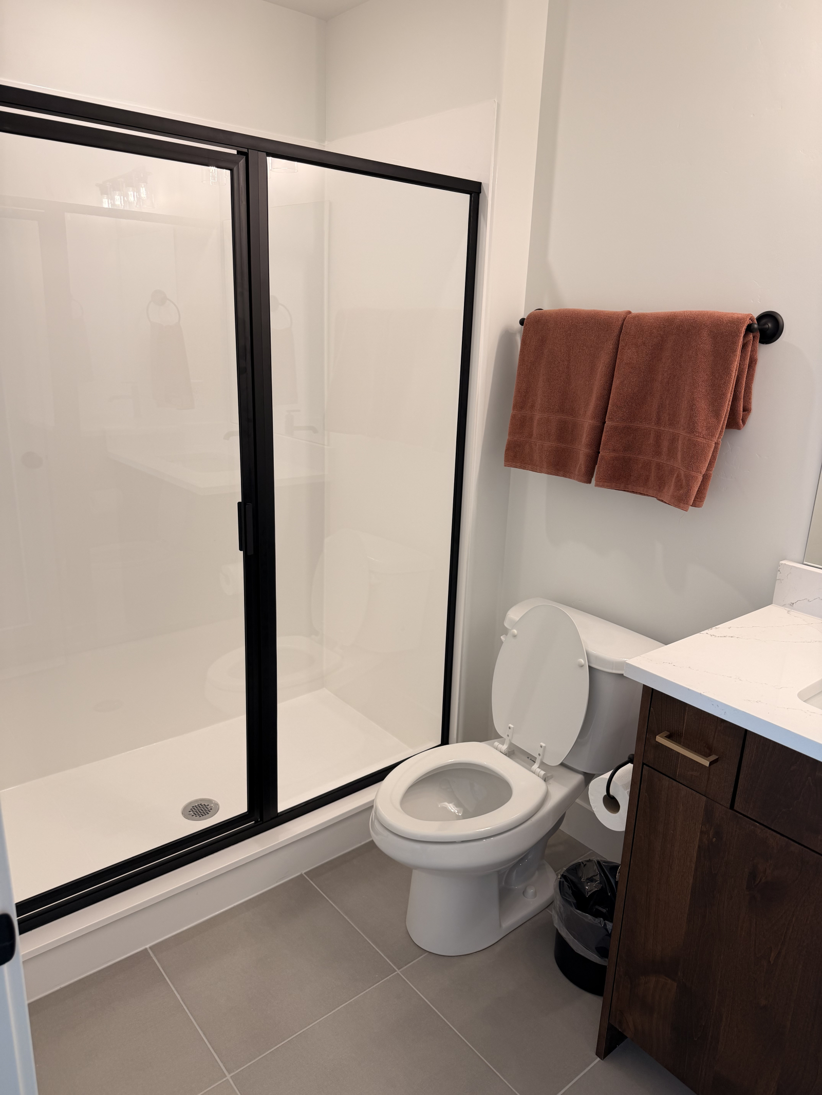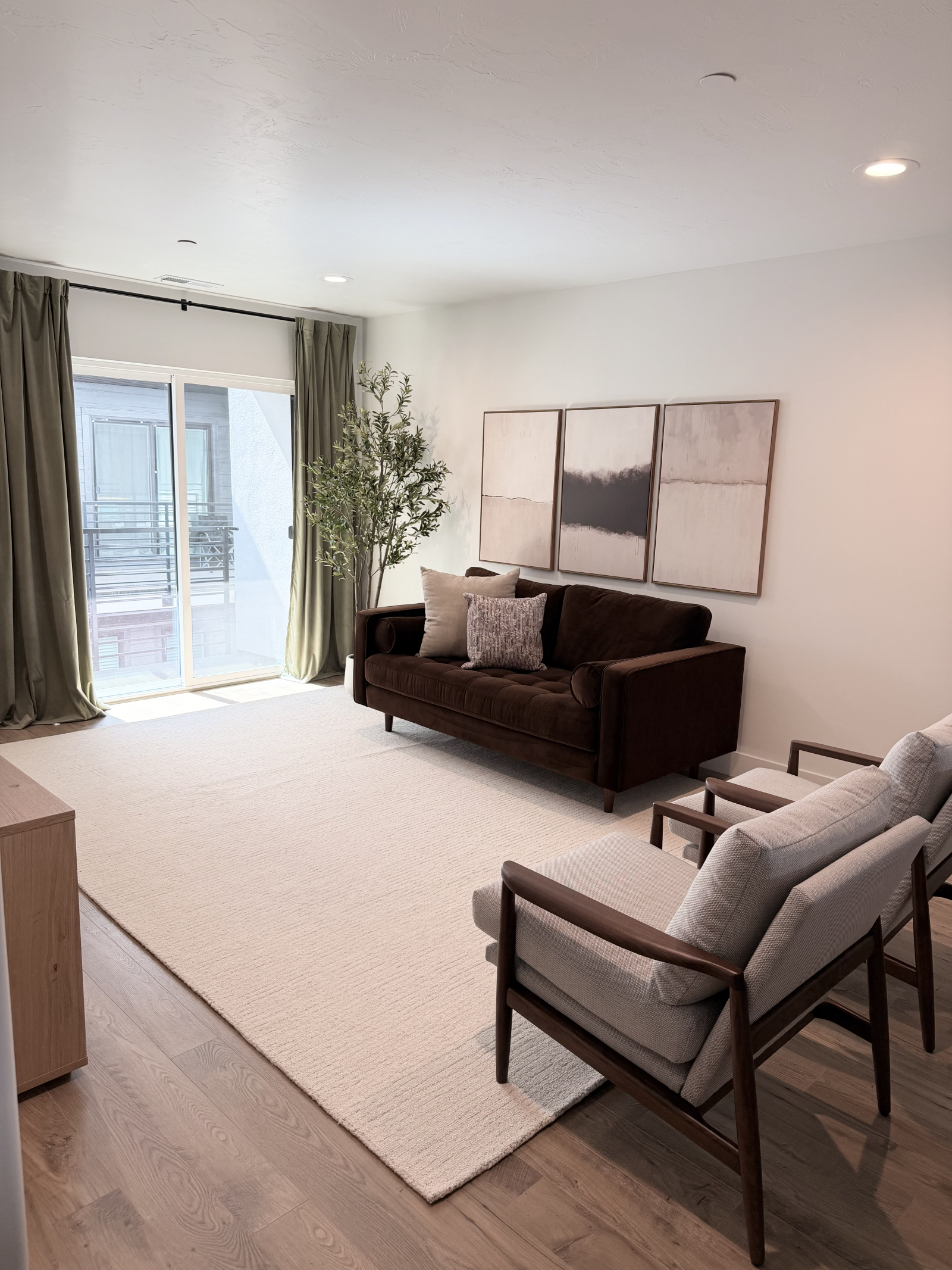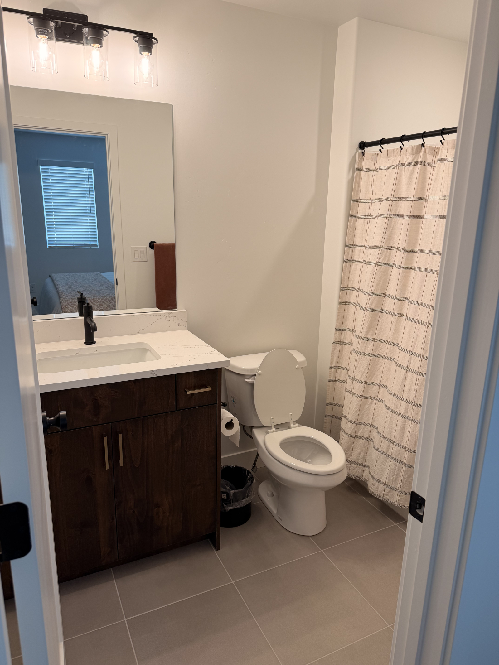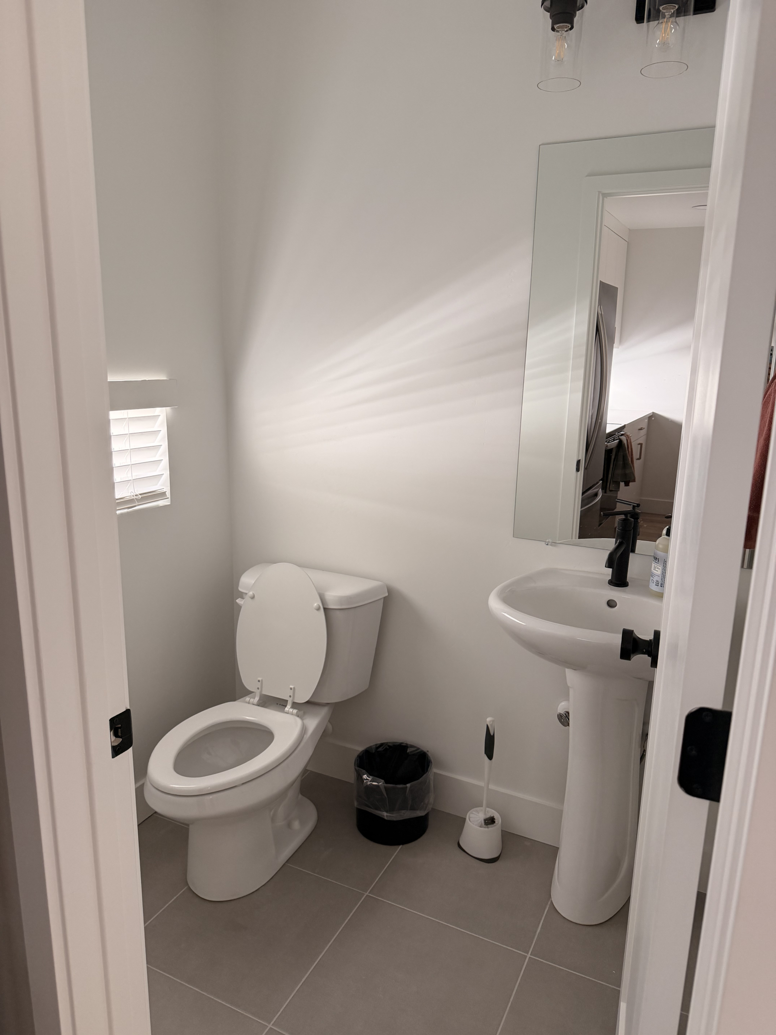 2 escaleras. En la planta baja está el garaje y una oficina/cama futón. La planta intermedia es la cocina y el espacio de estar. La planta superior tiene dos dormitorios y una lavandería