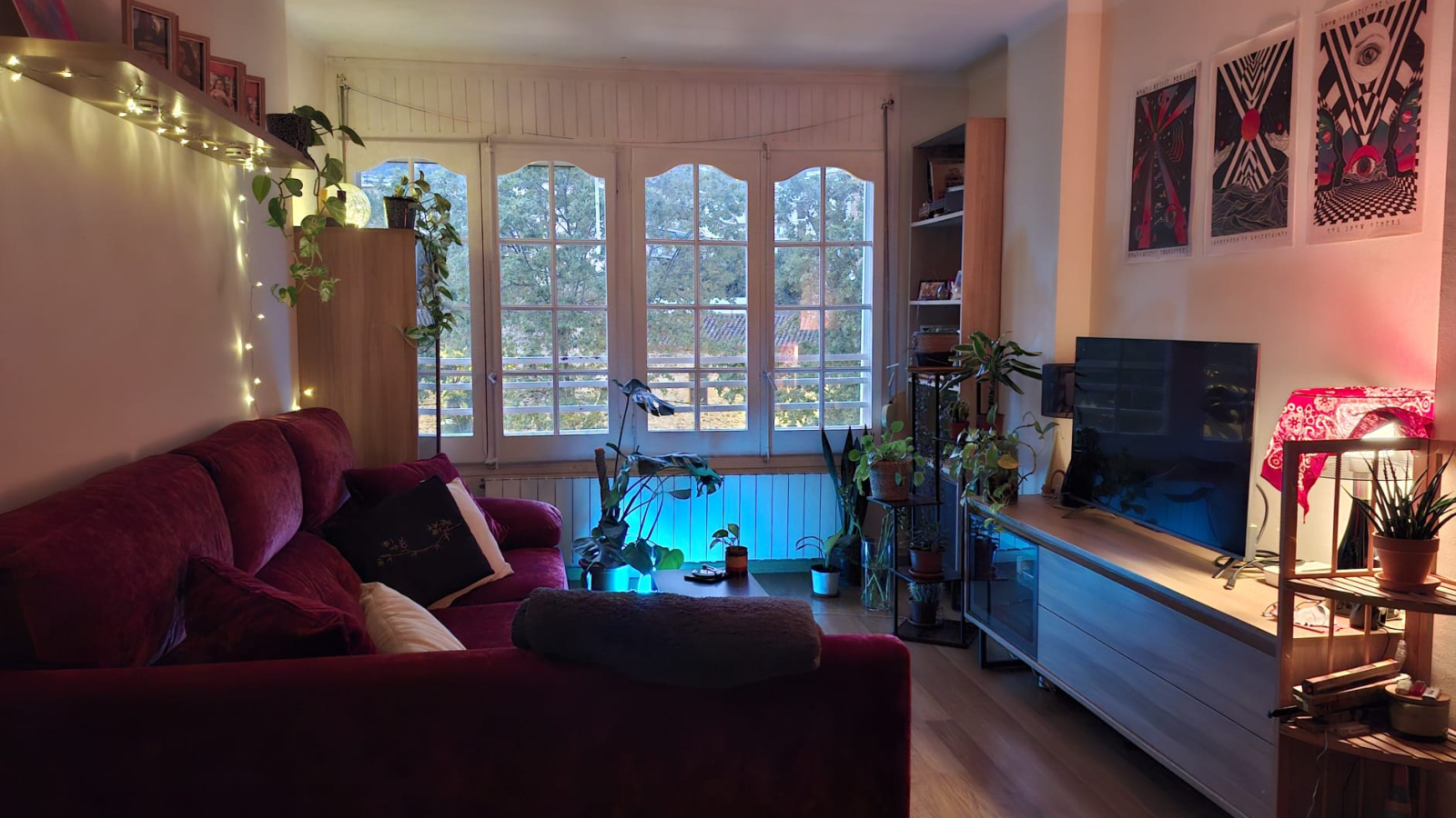 El espacioso salón está iluminado por la luz natural gracias a las hermosas ventanas grandes con marcos de estilo victoriano. Un gran y cómodo sofá de terciopelo rojo y nuestras queridas plantas hacen que el espacio sea especialmente acogedor. Hay una gran televisión inteligente, junto con libros en italiano e inglés. El salón es un espacio de planta abierta compartido con el comedor.