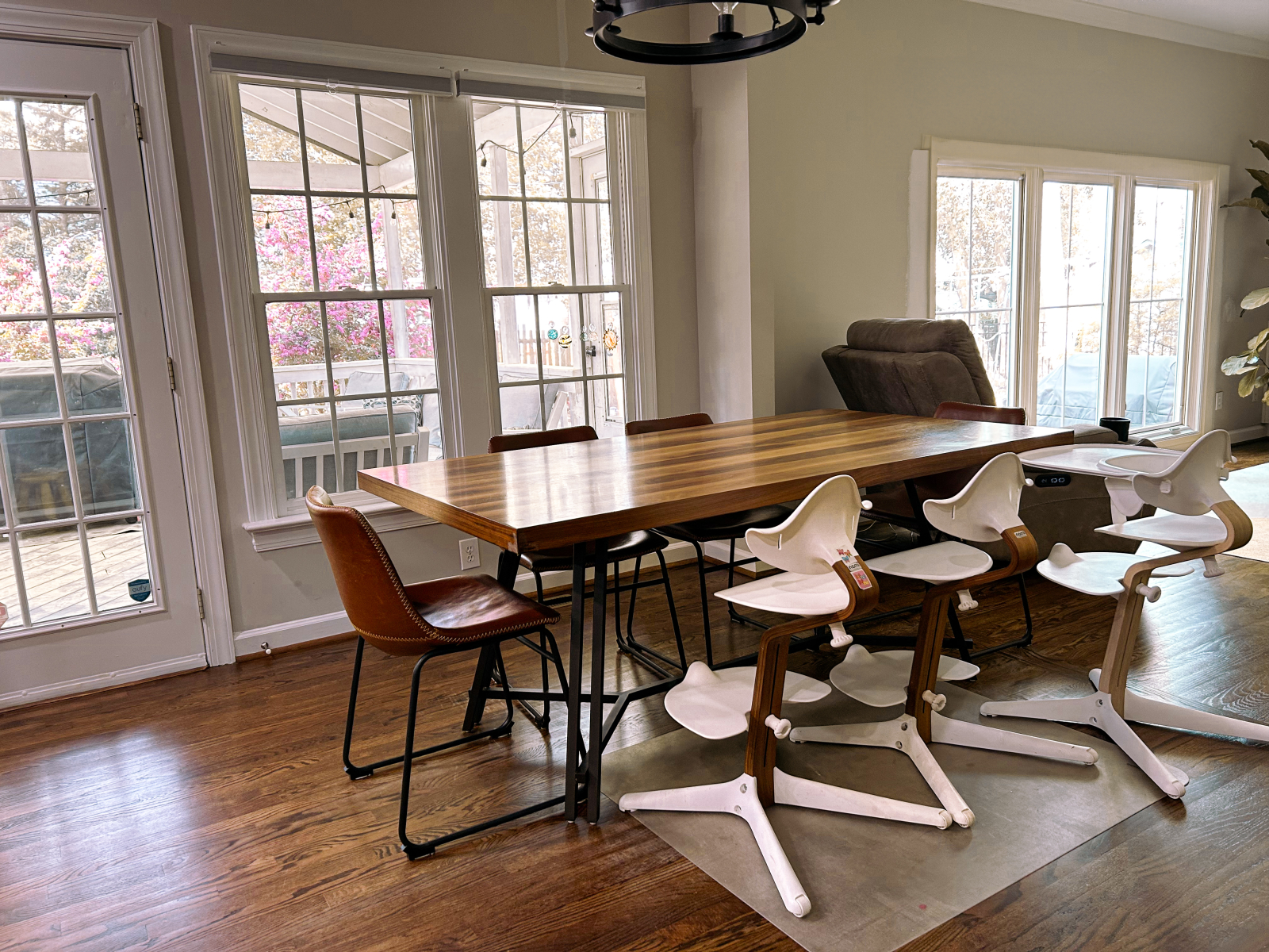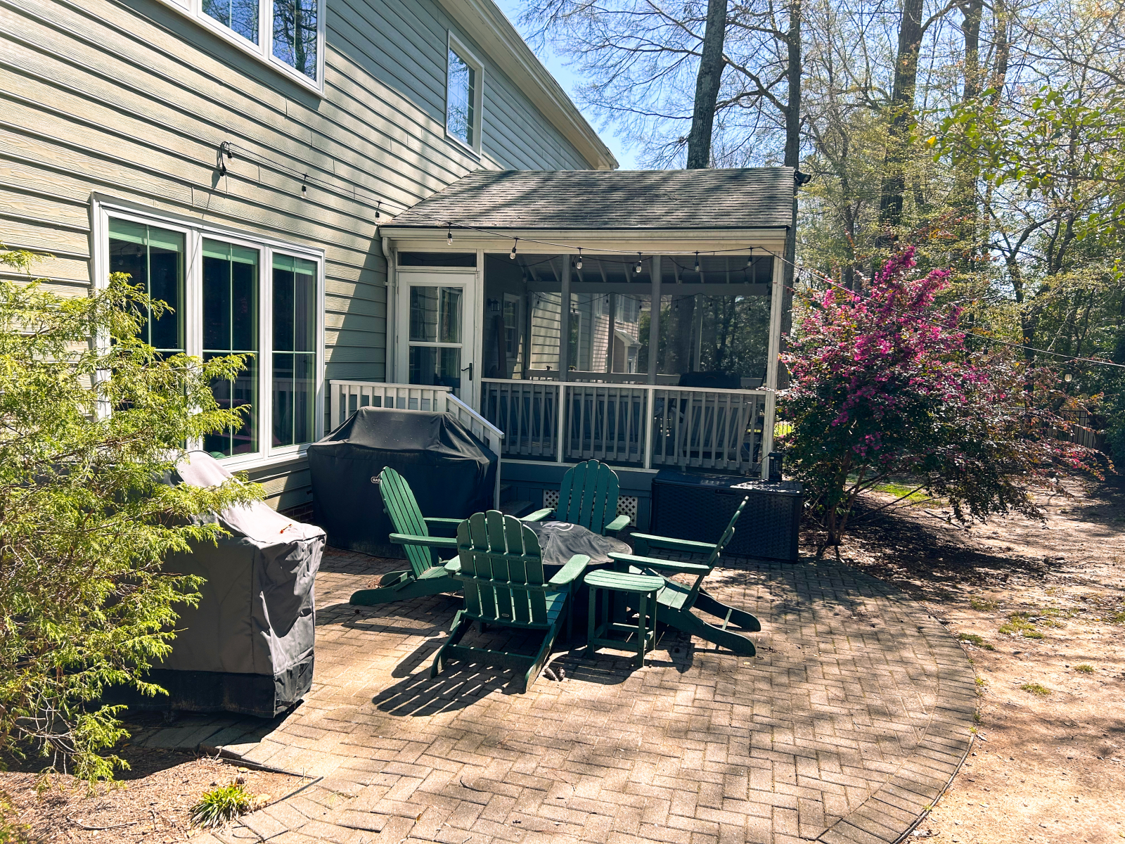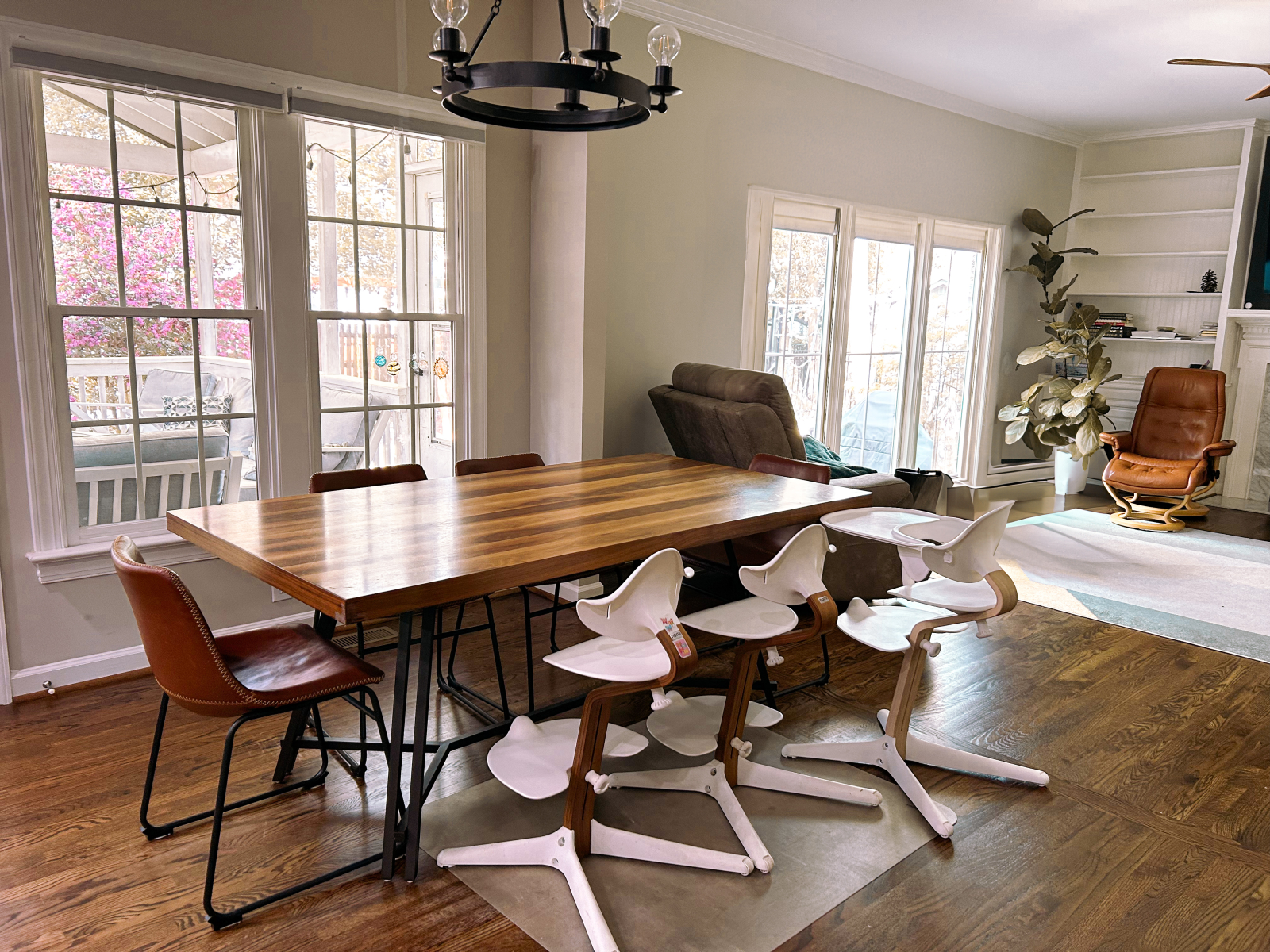 Tenemos una casa grande y luminosa con 5 dormitorios y un despacho. Nuestra parte favorita son las grandes ventanas con mucha luz natural y la vista de los árboles alrededor de la casa. De primavera a otoño pasamos mucho tiempo en el porche con mosquitero en la parte trasera de la casa, donde tenemos una sala de estar y una mesa de comedor para cenas al aire libre. Las luces que cuelgan en el porche y afuera en el patio trasero dan una sensación muy acogedora y romántica después de la puesta de sol. Tenemos chimenea sin humo y sillas Adirondack a su alrededor donde pasamos muchas horas disfrutando de un buen rato con la familia y amigos.