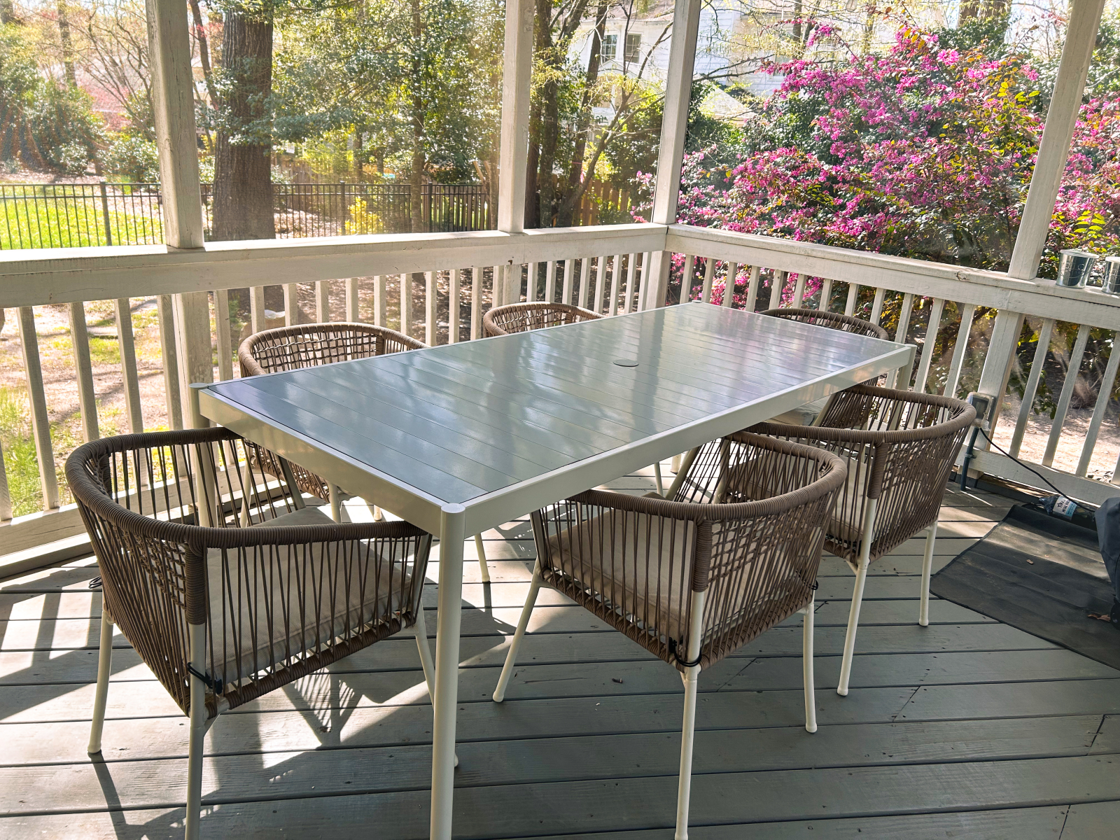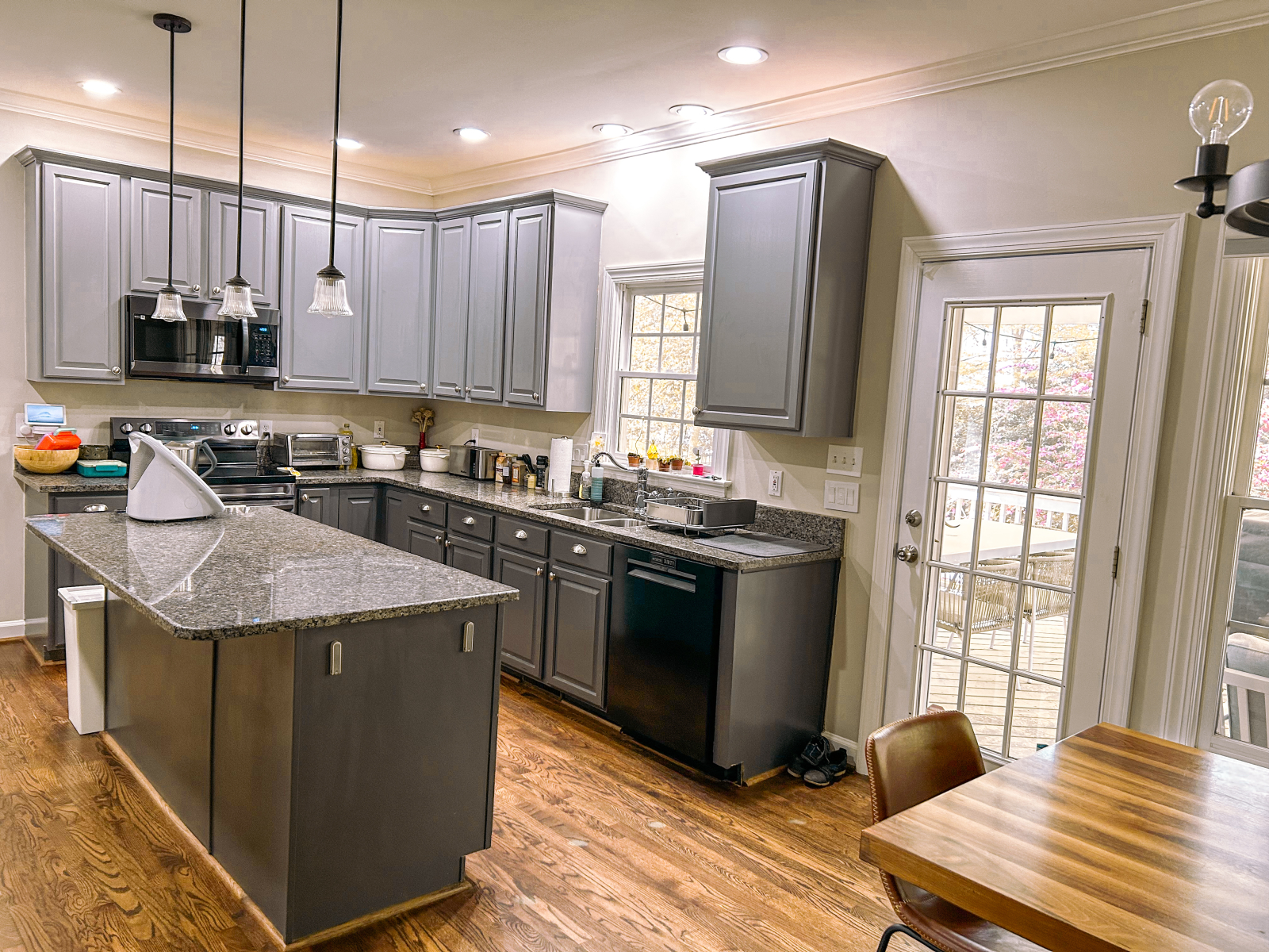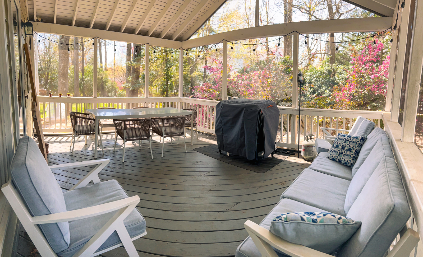Tenemos una casa grande y luminosa con 5 dormitorios y un despacho. Nuestra parte favorita son las grandes ventanas con mucha luz natural y la vista de los árboles alrededor de la casa. De primavera a otoño pasamos mucho tiempo en el porche con mosquitero en la parte trasera de la casa, donde tenemos una sala de estar y una mesa de comedor para cenas al aire libre. Las luces que cuelgan en el porche y afuera en el patio trasero dan una sensación muy acogedora y romántica después de la puesta de sol. Tenemos chimenea sin humo y sillas Adirondack a su alrededor donde pasamos muchas horas disfrutando de un buen rato con la familia y amigos.