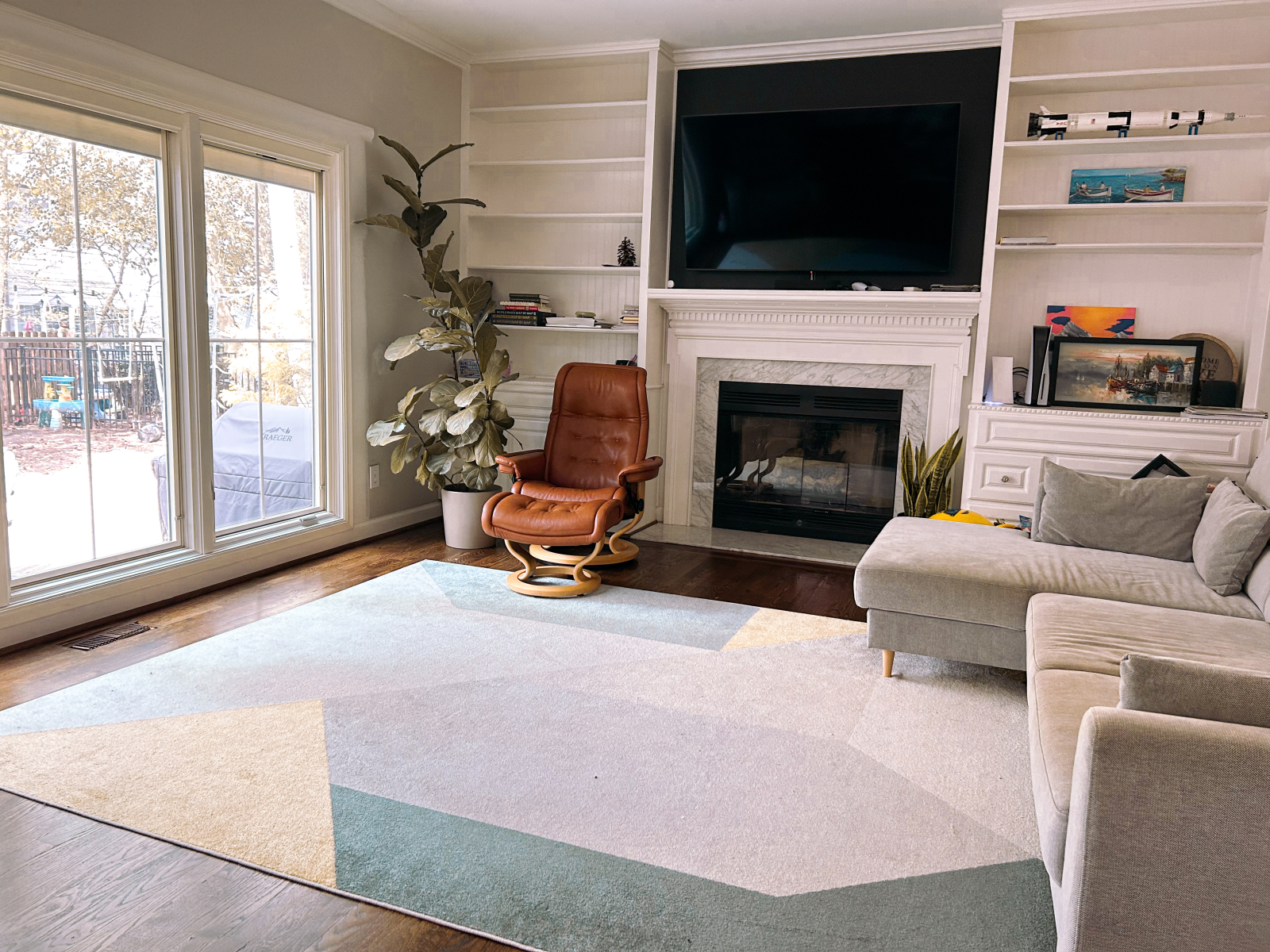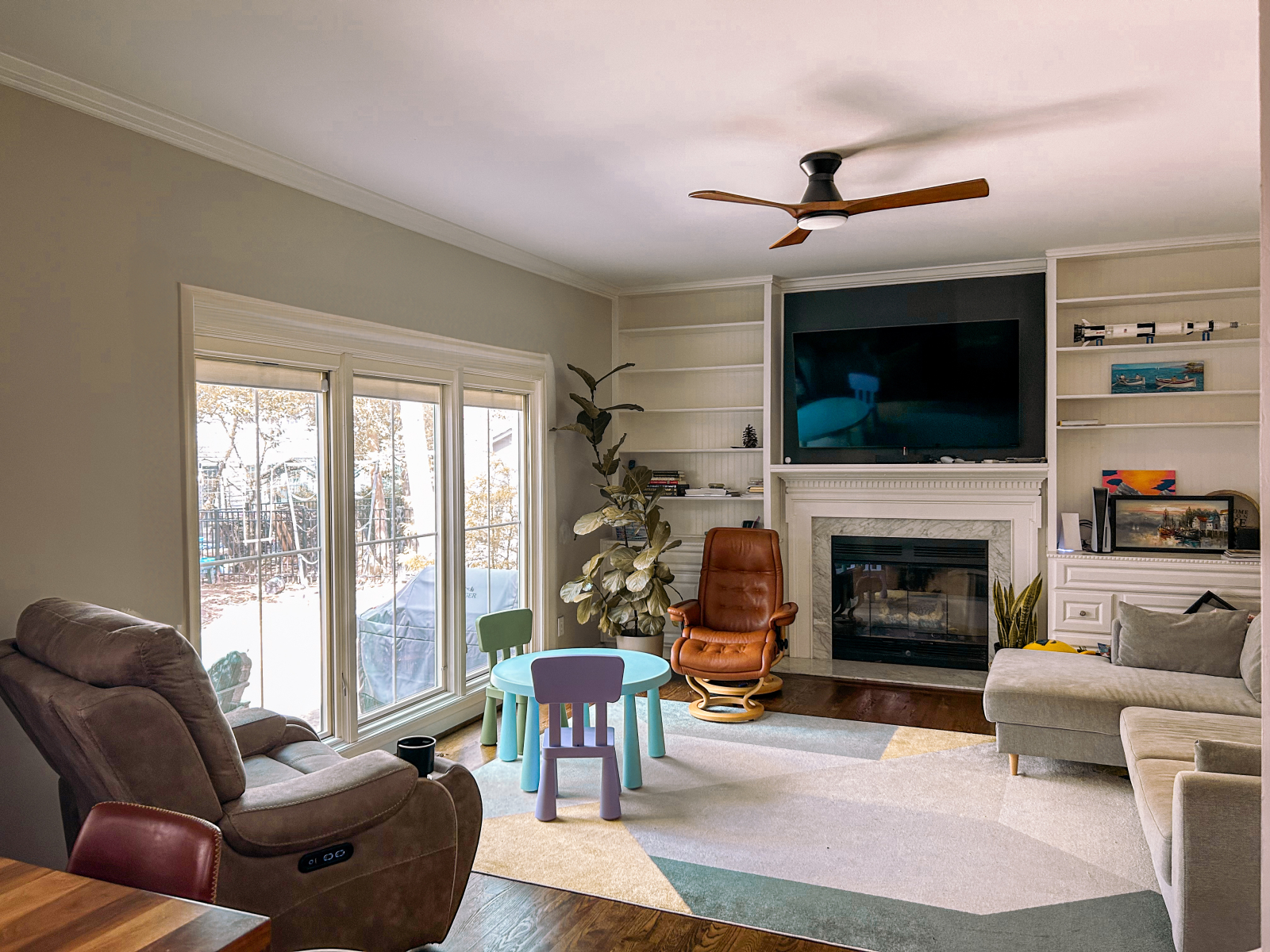 Habitación familiar: Este es nuestro lugar favorito de la casa. La sala de estar es muy acogedora, con grandes ventanales que se abren al patio trasero donde podemos ver a nuestros hijos jugar. Tiene un sofá frente a las ventanas, 2 sillas reclinables, TV y chimenea.