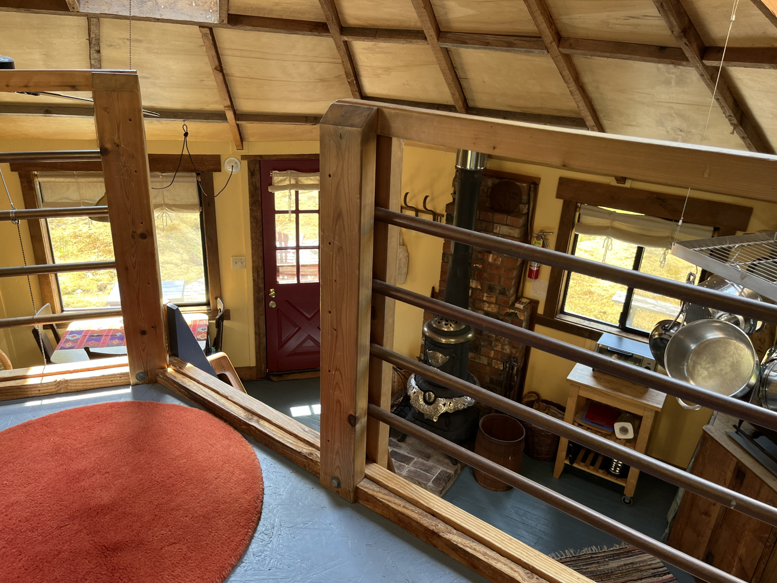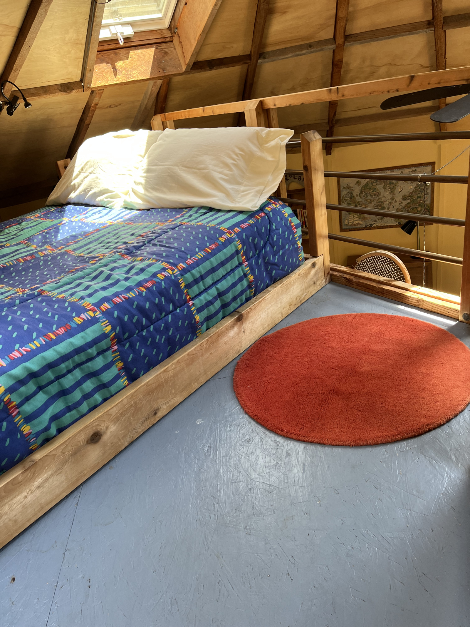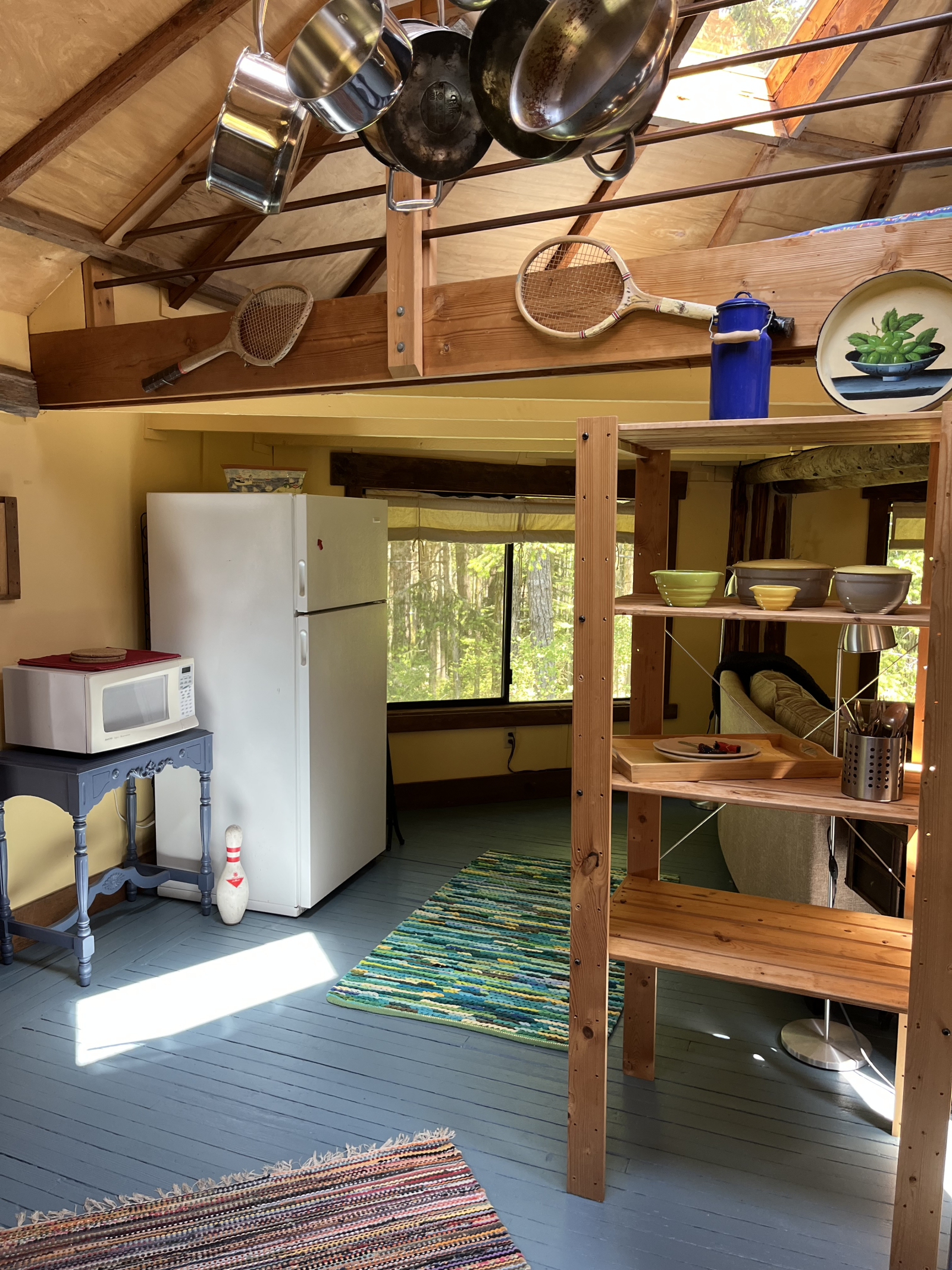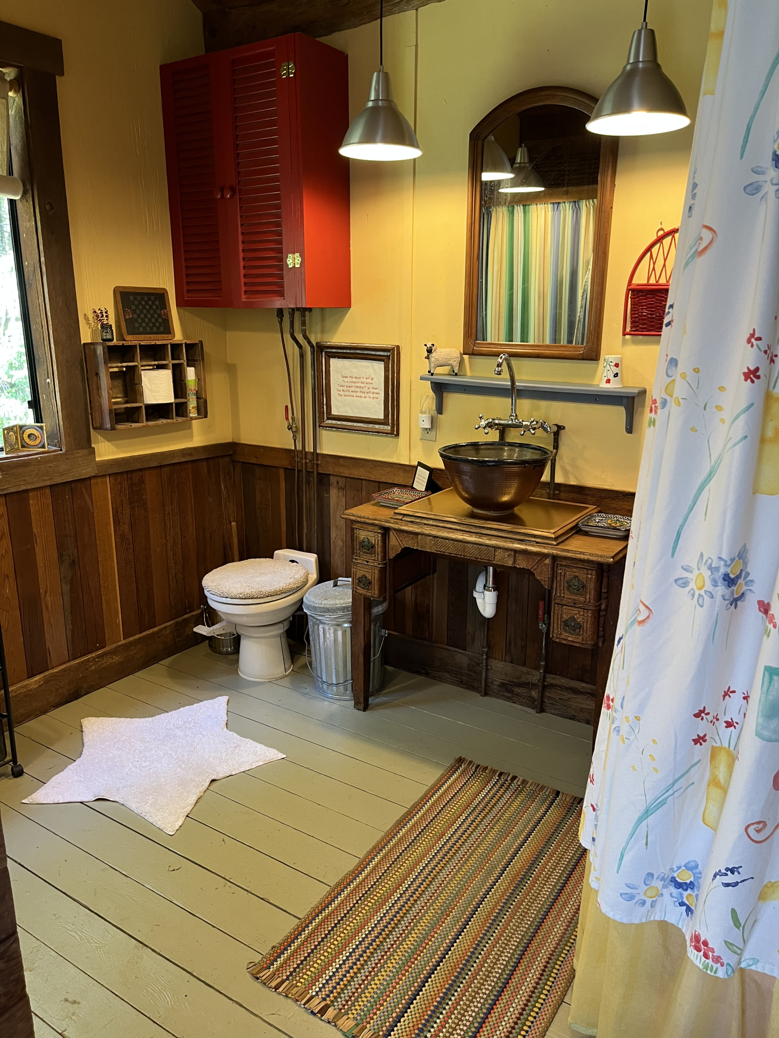 Pasamos muchos meses demoliendo algunas partes de la cabaña y rehaciendo otras partes y reutilizando la madera que originalmente se fresaba aquí mismo en la propiedad. El espacio es el resultado de nuestra creatividad combinada. Cuenta con un inodoro de compostaje, un comedero para la bañera y una cama tamaño queen en un desván de dos tragaluces.